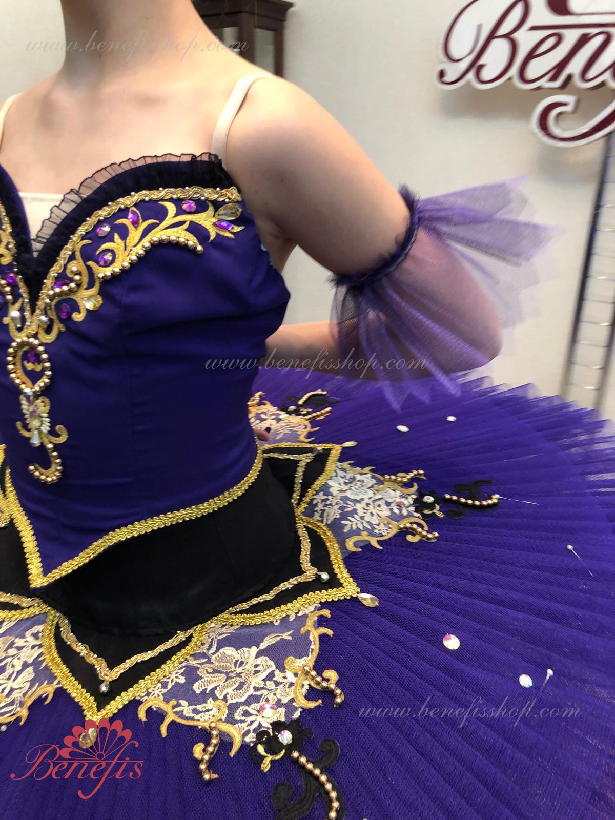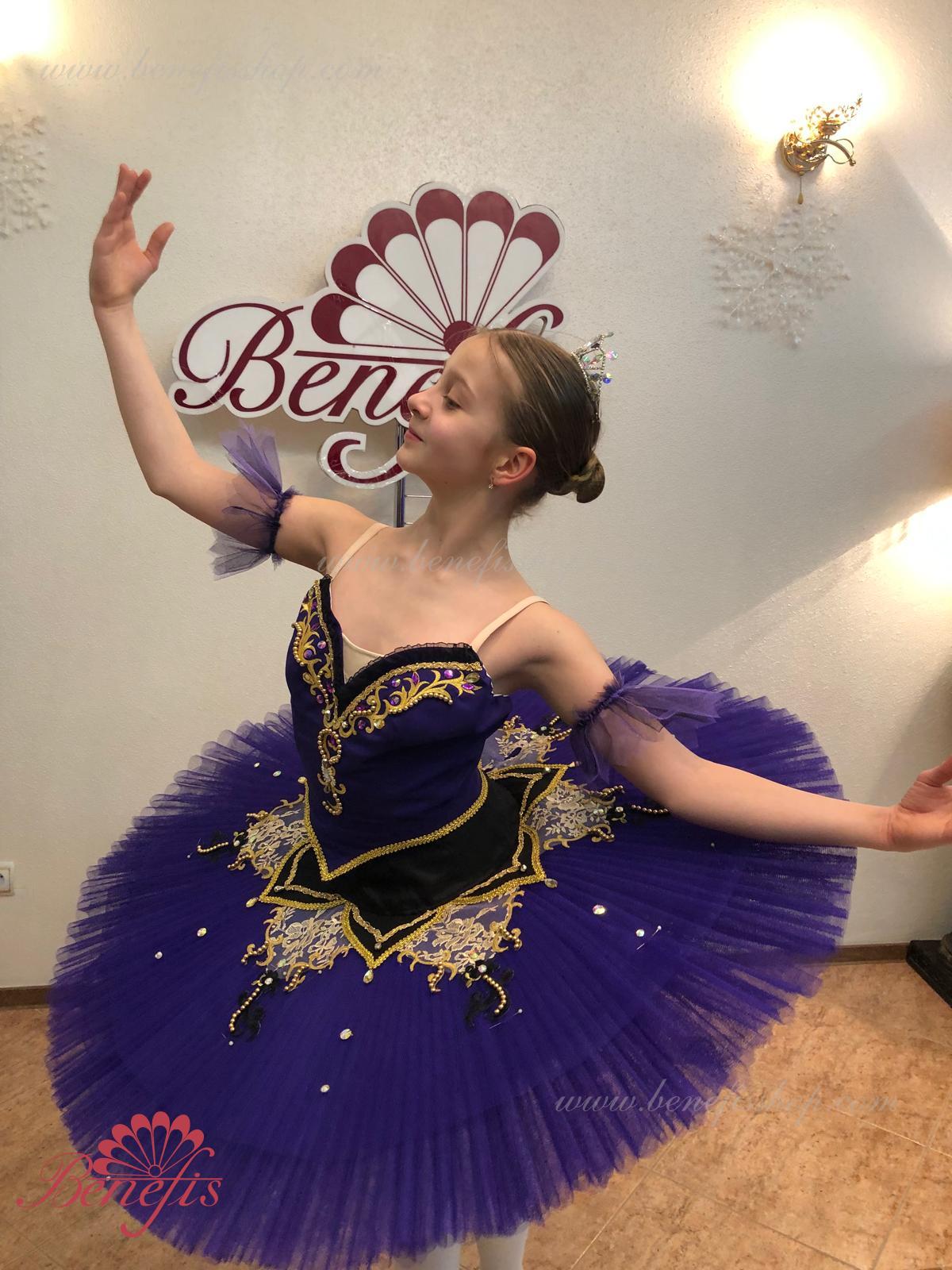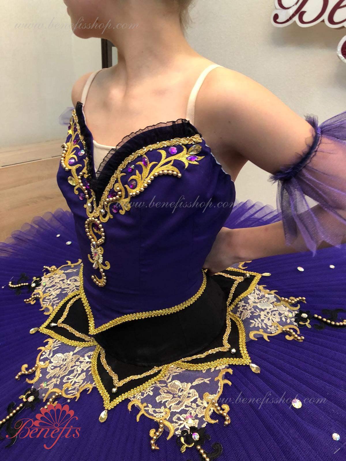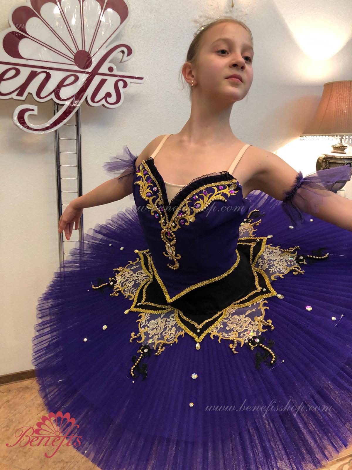 Details: costume. The bodice, with elastic straps and a body insert on the chest, is made of dense semi-elastic fabric. The bodice is fastened with hooks in two rows for easy adjustment, the inner cord is used to tighten the bodice in the chest area. Eight pleated graduated layers of semi-soft tulle- seven long and one short on tulle panties with a 10 cm yoke attached to an elastic waistband. Two crinoline hoops are embedded in the middle layer with two additional short frills at the edges. The length of the top layer is 36-38 cm, each subsequent layer is 4 cm shorter. The tutu is fastened at the back with 6 large hooks and loops. The sleeves are made of soft tulle, the peplum is made of semi-elastic fabric and guipure. Everything is decorated with braid, rhinestones and sequins, applications and beads.
