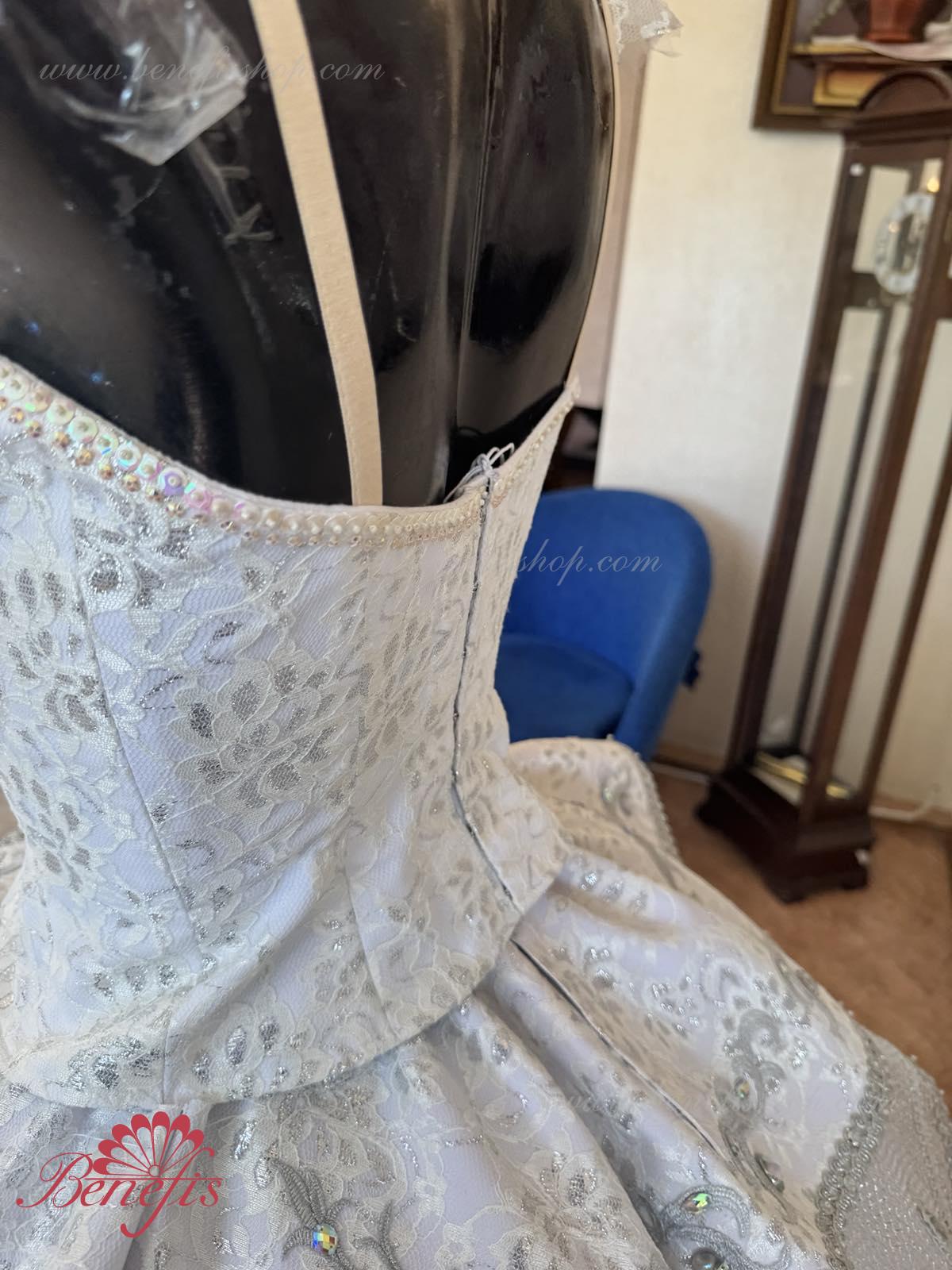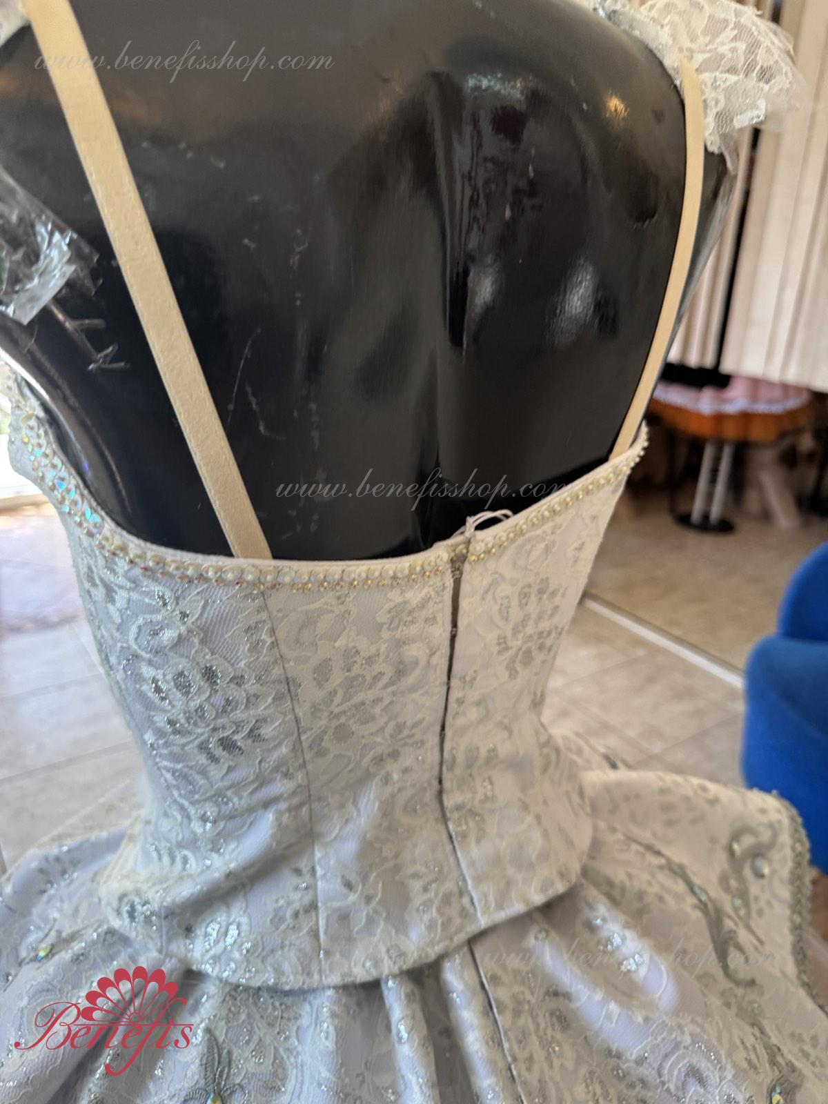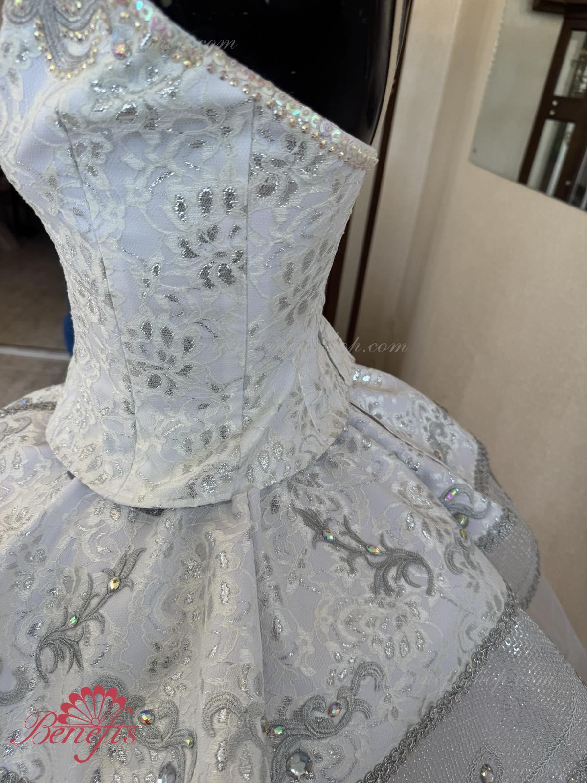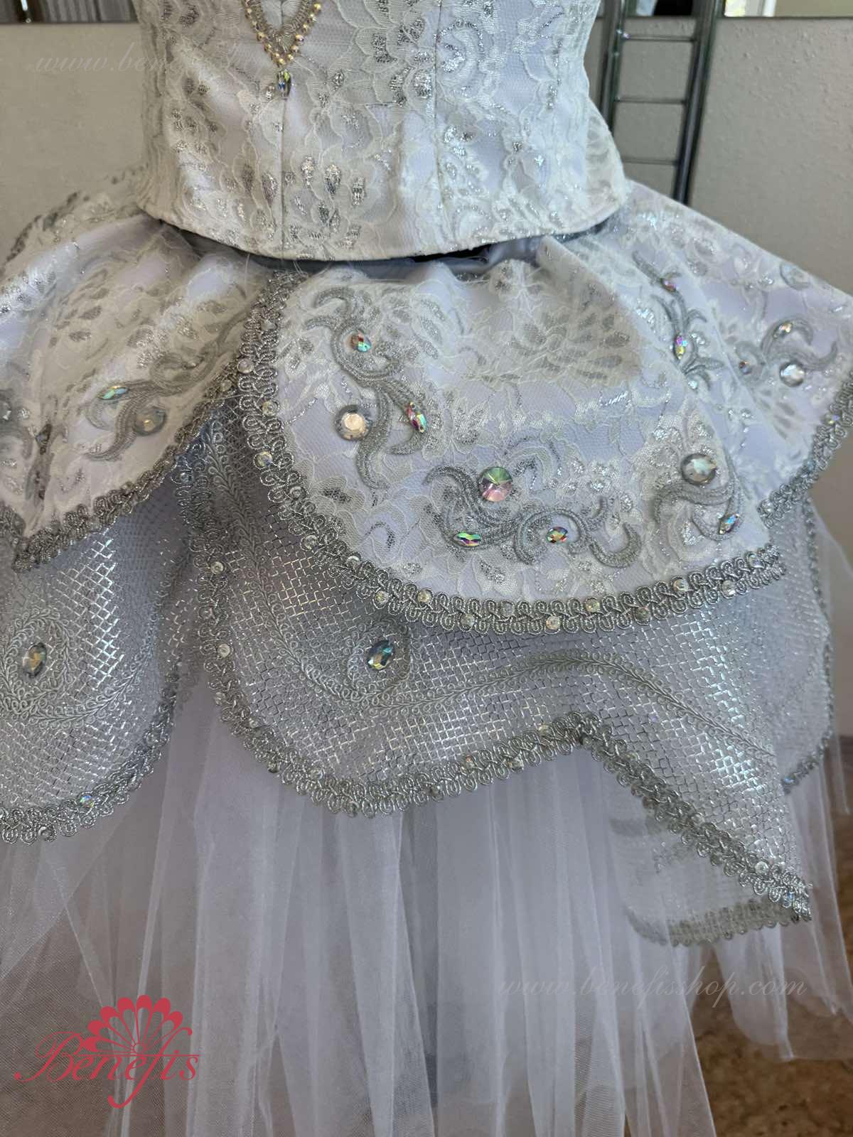 Exquisite applications are used as the costume\'s décor, along with a big quantity of rock crystals, bugles, beads.