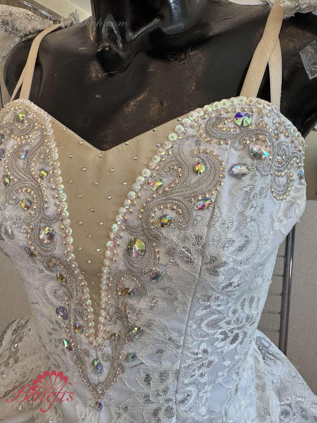 White long romantic skirt consists of a lot of layers of fluffy tulle. The leotard on the elastic straps and with a flesh-colored inset on the chest.
