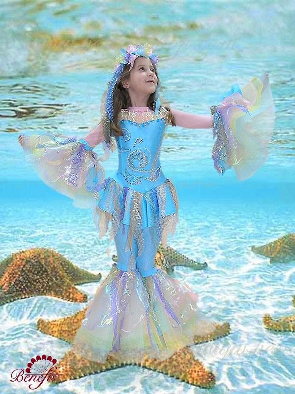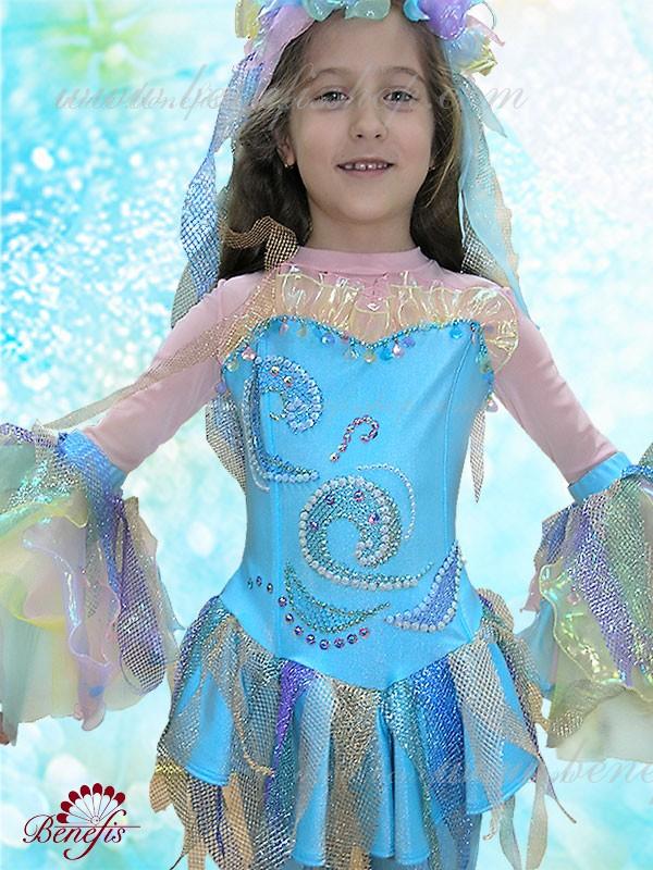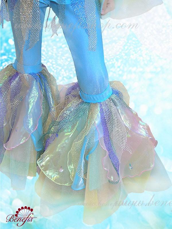 The bodice is made up of biflex, decorated with ruffles at the edges, and also with band and sequins. Cuffs with elastic on the hands nd feet imitating the flippers, are made up of 3 soft tulle layers, several tulle layers and coarse grid.