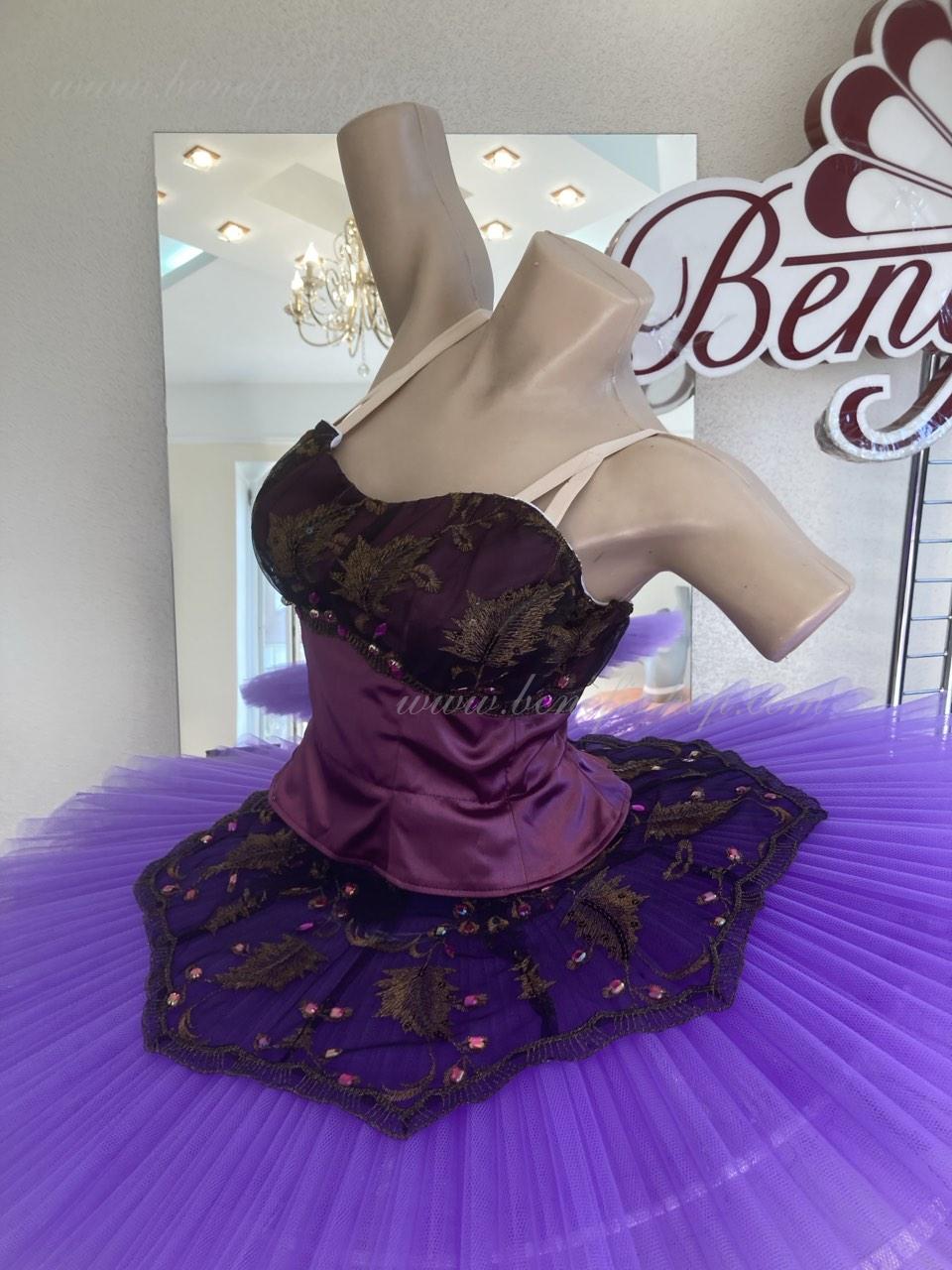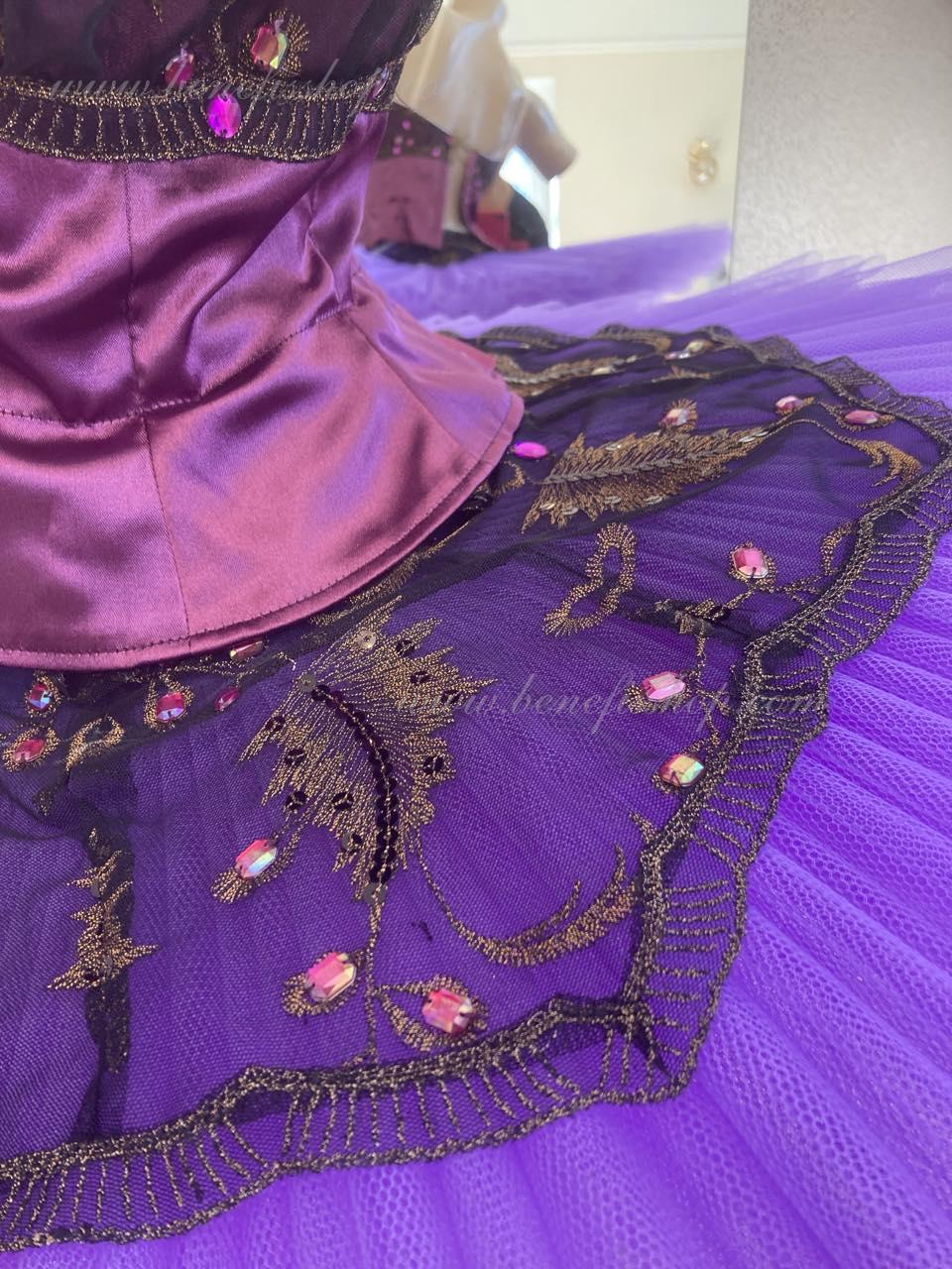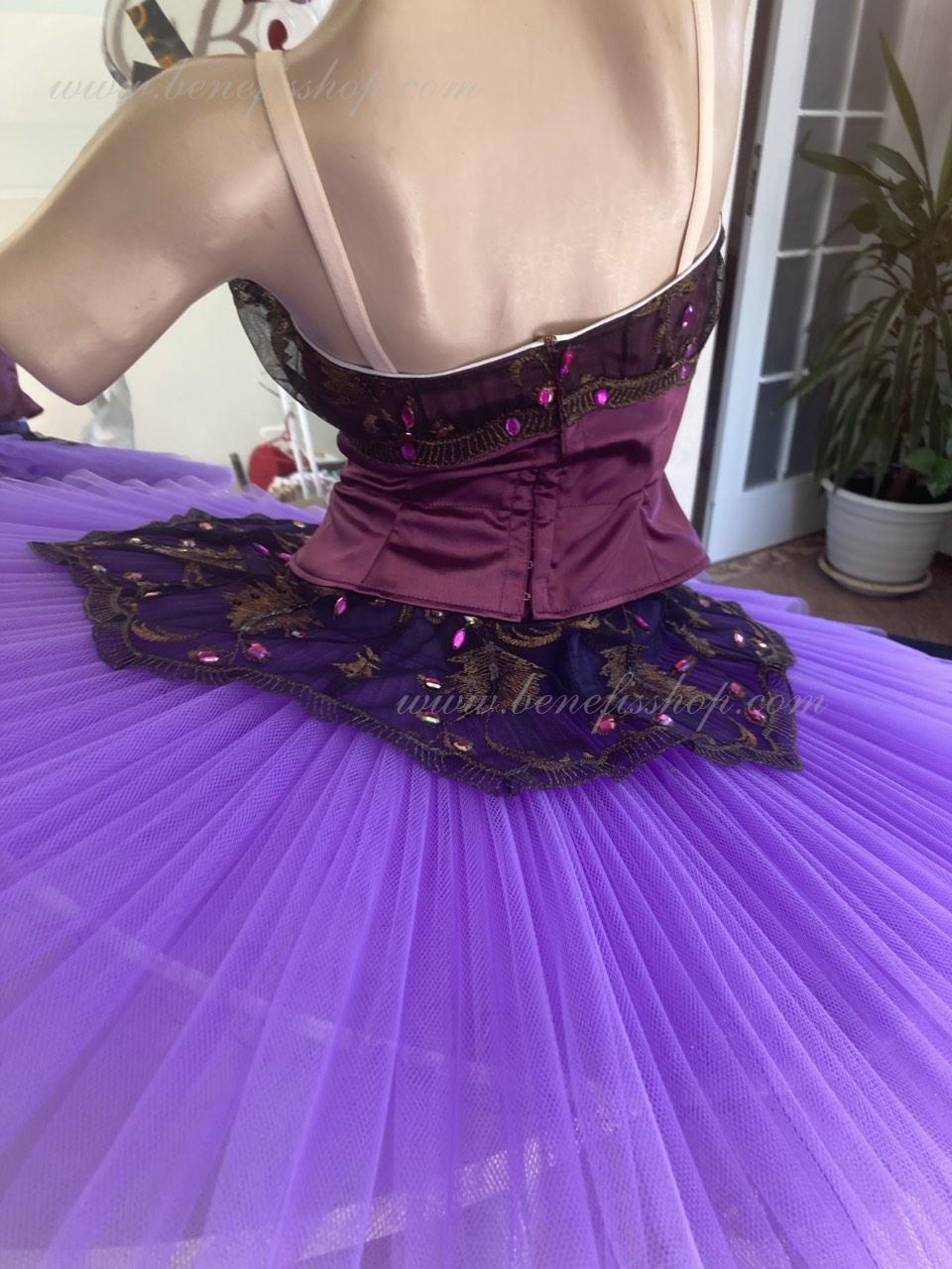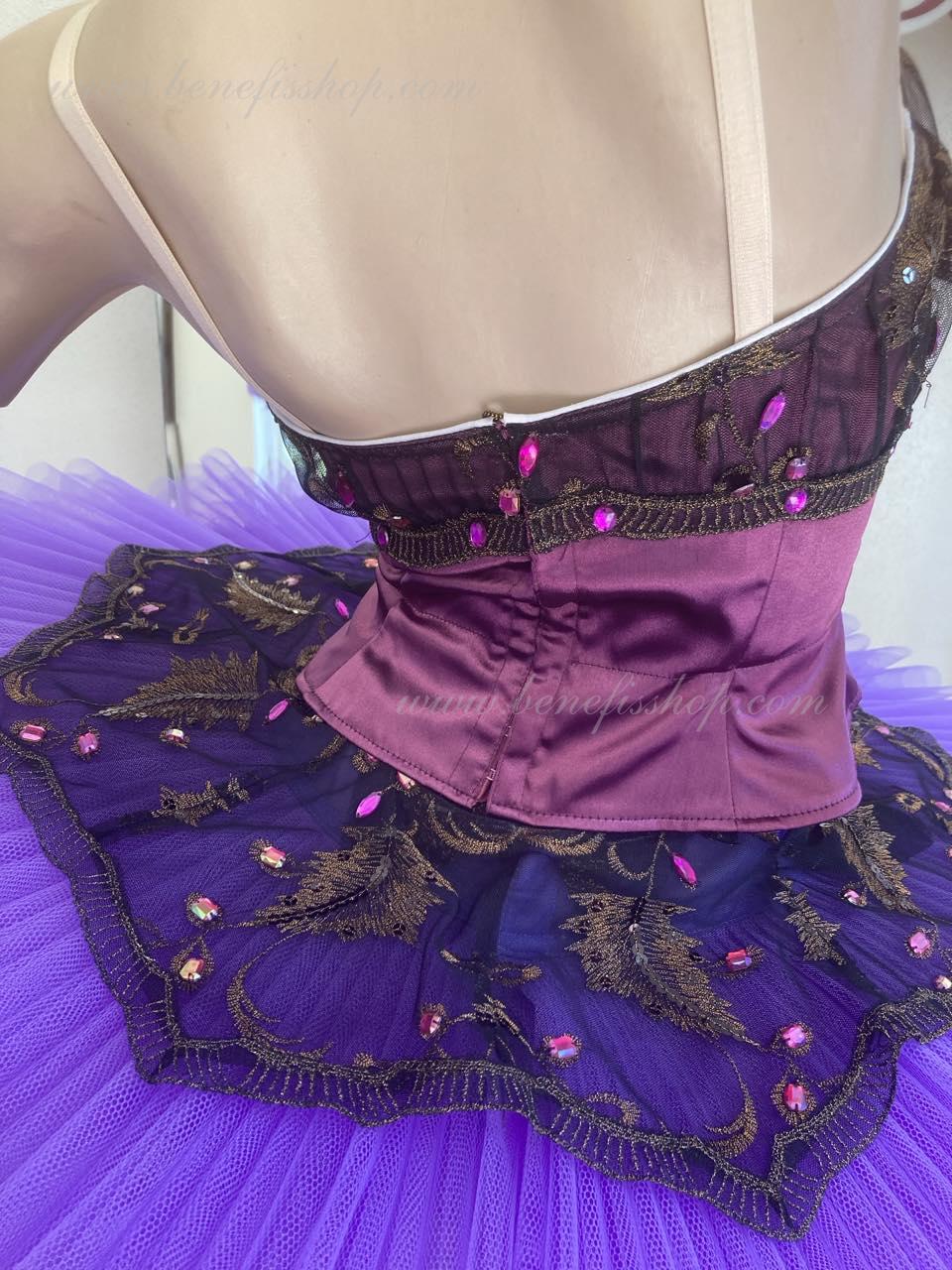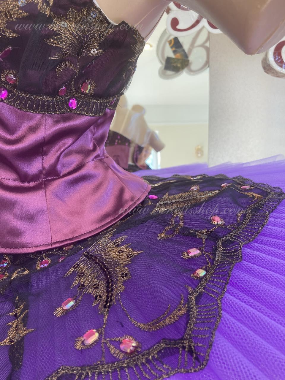 Details: costume. The bodice is duplicated with guipure. Eight pleated graduated layers of semi-soft tulle- seven long and one short on tulle panties with a 10 cm yoke attached to an elastic waistband. Two crinoline hoops are embedded in the middle layer with two additional short frills at the edges. The length of the top layer is 36-38 cm, each subsequent layer is 4 cm shorter. The tutu is fastened at the back with 6 large hooks and loops. Decor: appliques, rhinestones, sequins.The costume is ready for immediate shipment
