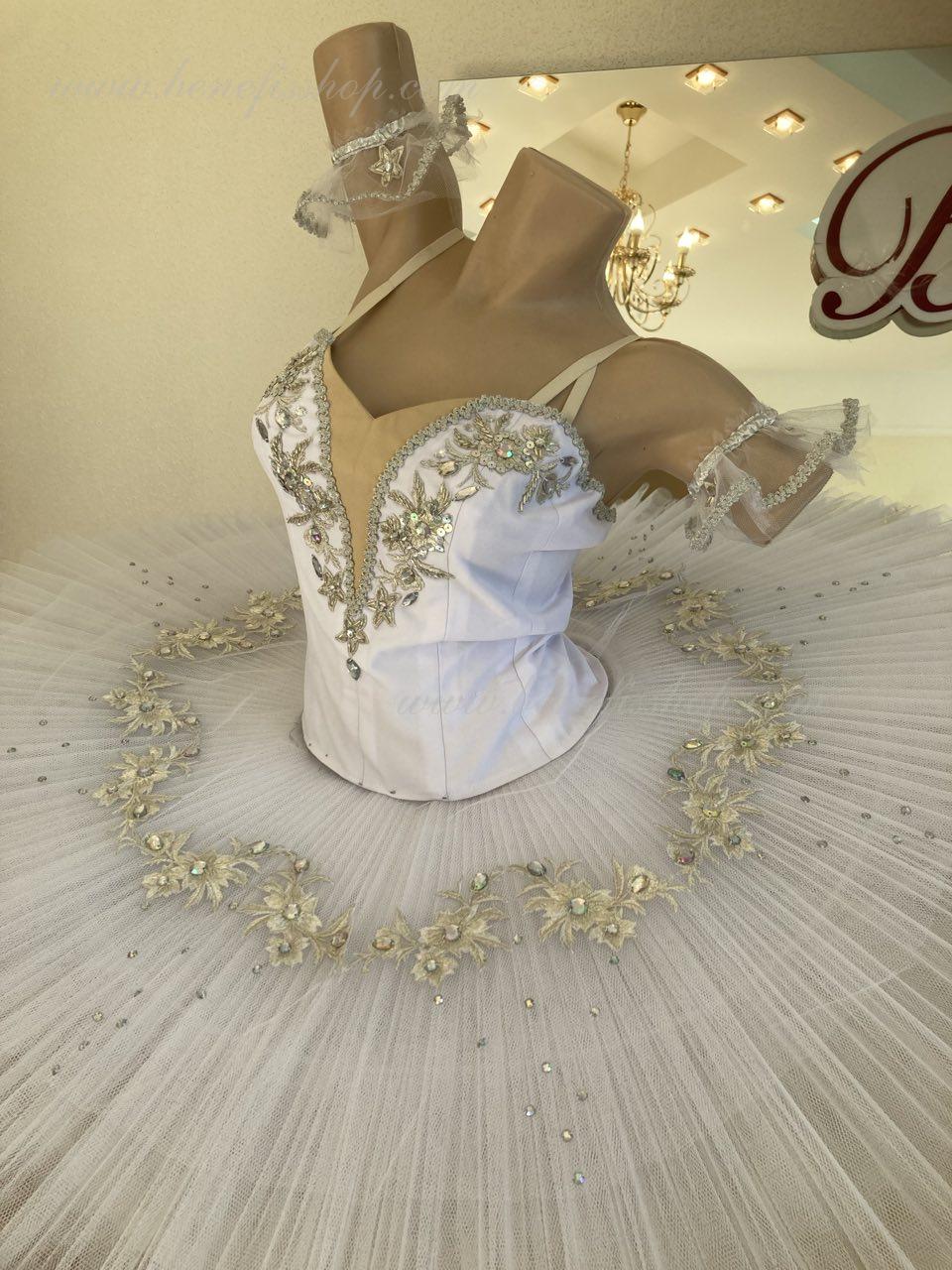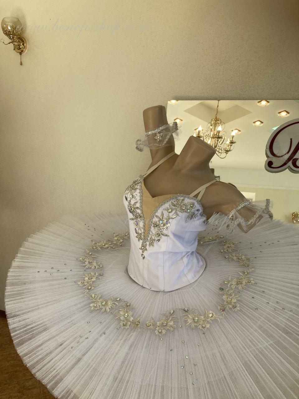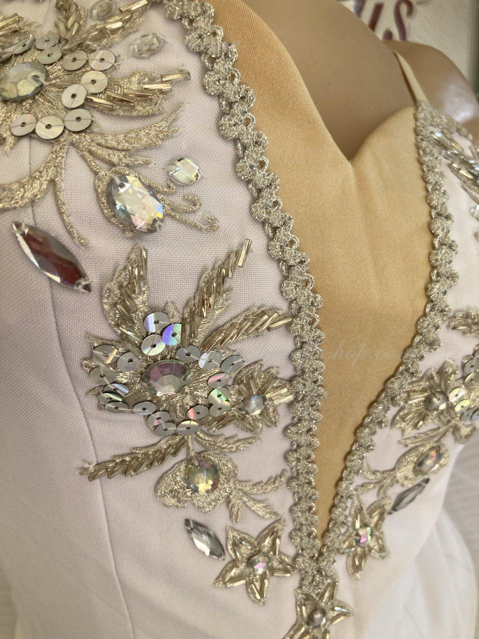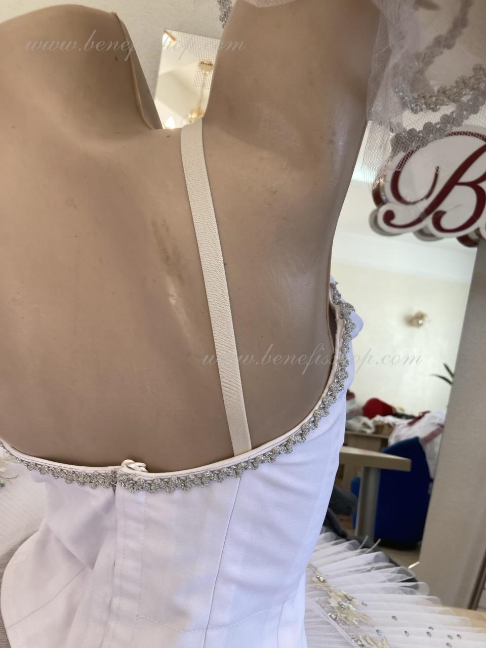 The bodice is fastened with hooks in two rows for easy adjustment, the inner cord is used to tighten the bodice in the chest area.Eight pleated graduated layers of semi-soft tulle- seven long and one short on tulle panties with a 10 cm yoke attached to an elastic waistband. Two crinoline hoops are embedded in the middle layer with two additional short frills at the edges. The length of the top layer is 36-38 cm, each subsequent layer is 4 cm shorter. The tutu is fastened at the back with 6 large hooks and loops. Decor: appliques, rhinestones, sequins.The costume is ready for immediate shipment