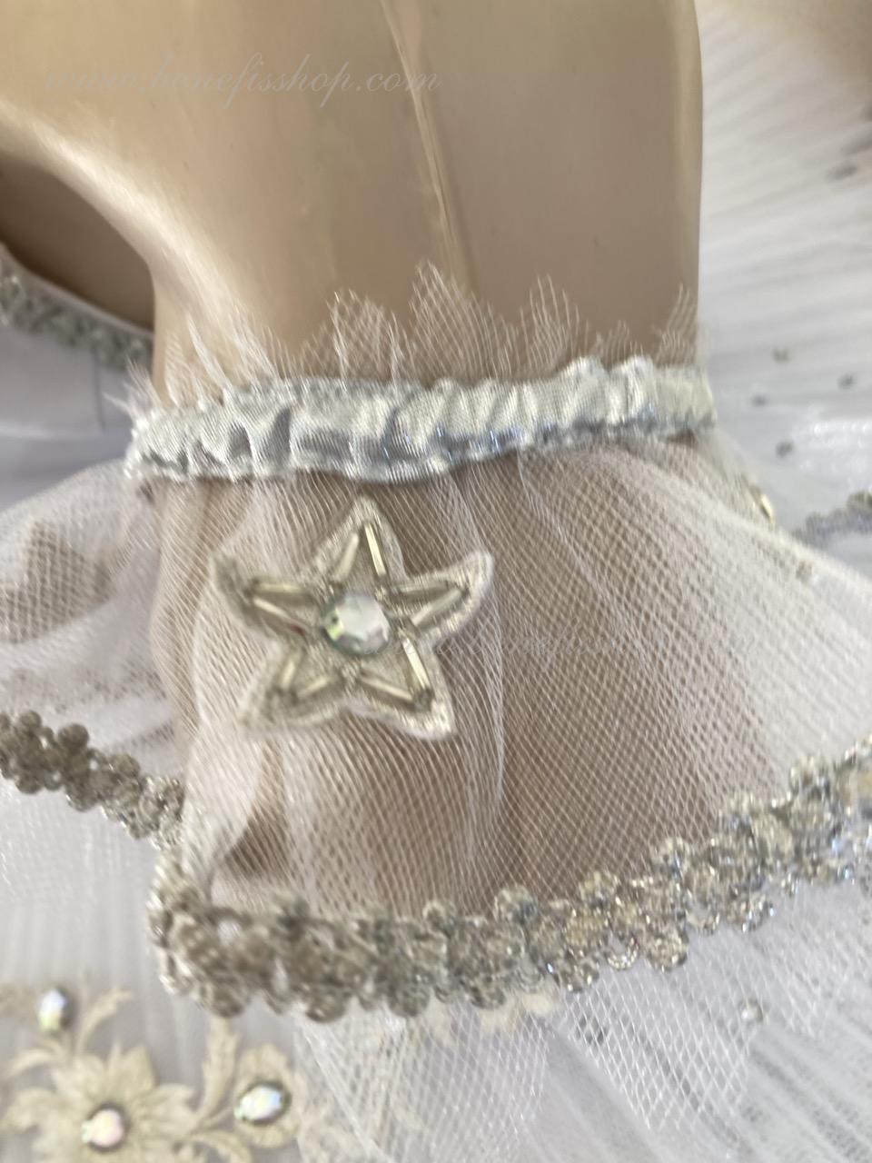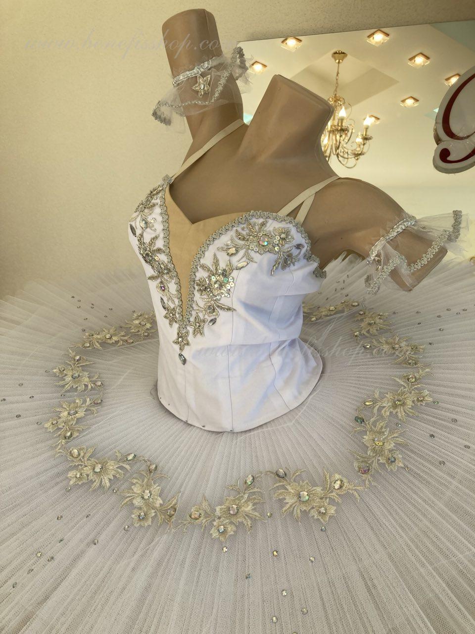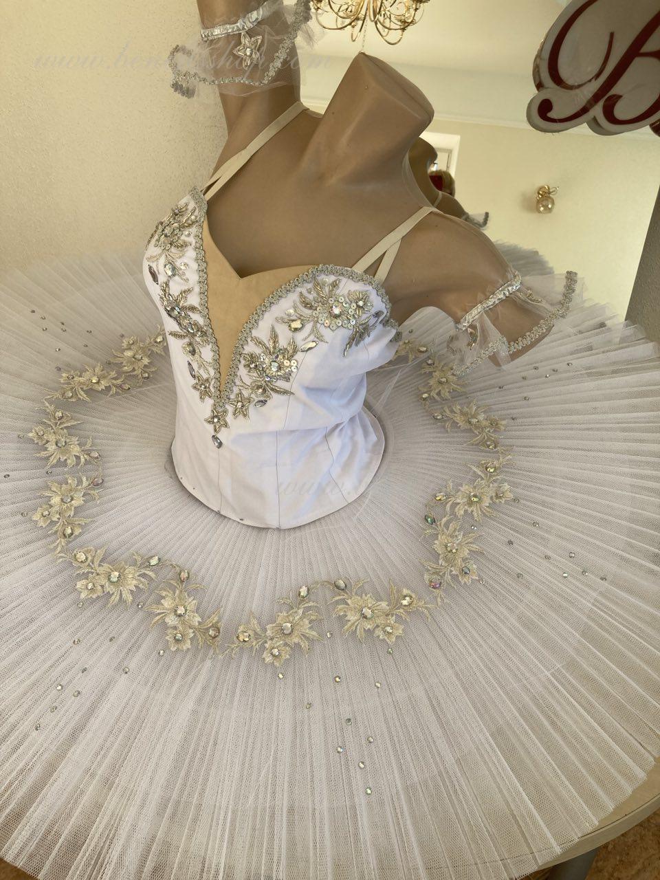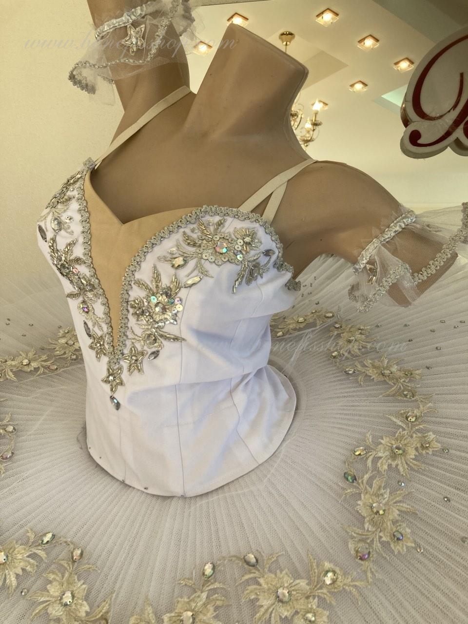 The bodice is fastened with hooks in two rows for easy adjustment, the inner cord is used to tighten the bodice in the chest area.Eight pleated graduated layers of semi-soft tulle- seven long and one short on tulle panties with a 10 cm yoke attached to an elastic waistband. Two crinoline hoops are embedded in the middle layer with two additional short frills at the edges. The length of the top layer is 36-38 cm, each subsequent layer is 4 cm shorter. The tutu is fastened at the back with 6 large hooks and loops. Decor: appliques, rhinestones, sequins.The costume is ready for immediate shipment