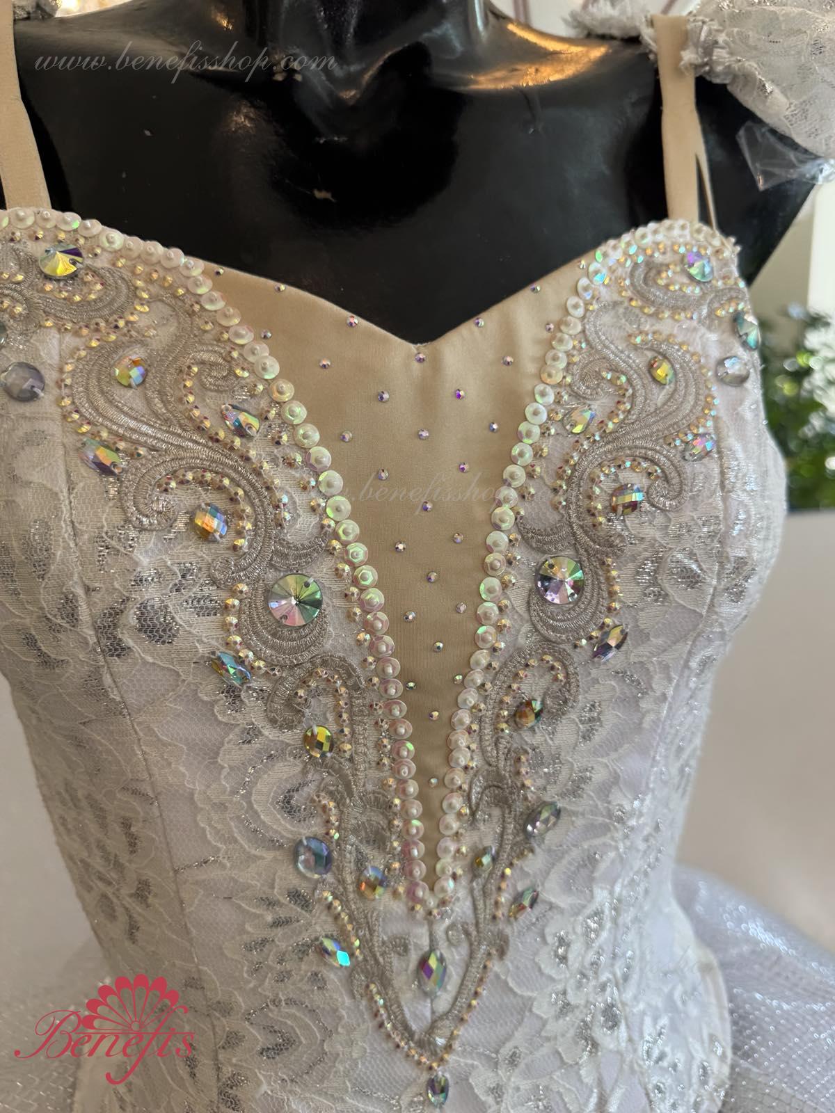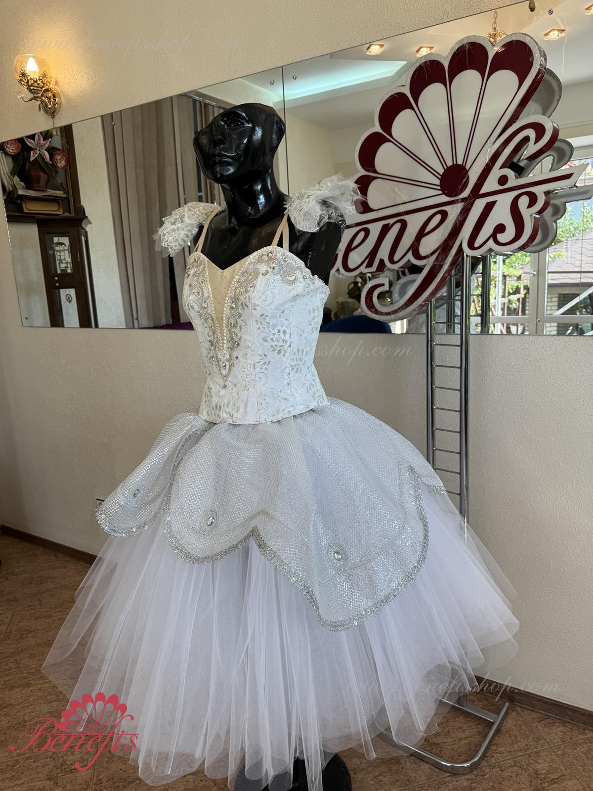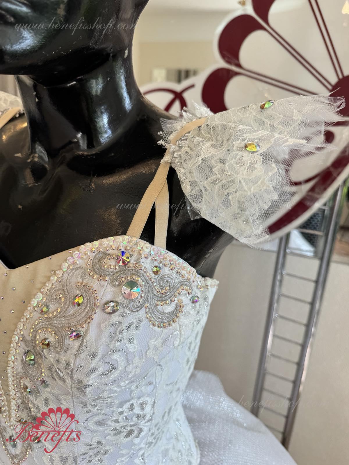 Details: costume, armbands. The bodice, with elastic straps and a flesh insert on the chest, is made of dense semi-elastic fabric duplicated with guipure. The bodice is fastened with hooks in two rows for convenient size adjustment in the chest area. The long white romantic skirt consists of many layers of airy tulle. The costume is decorated with applique patterns, sequins, elongated and round-shaped rhinestones. With one mesh tire without an upper peplum. This ballet costume can be used in various ballet variations.