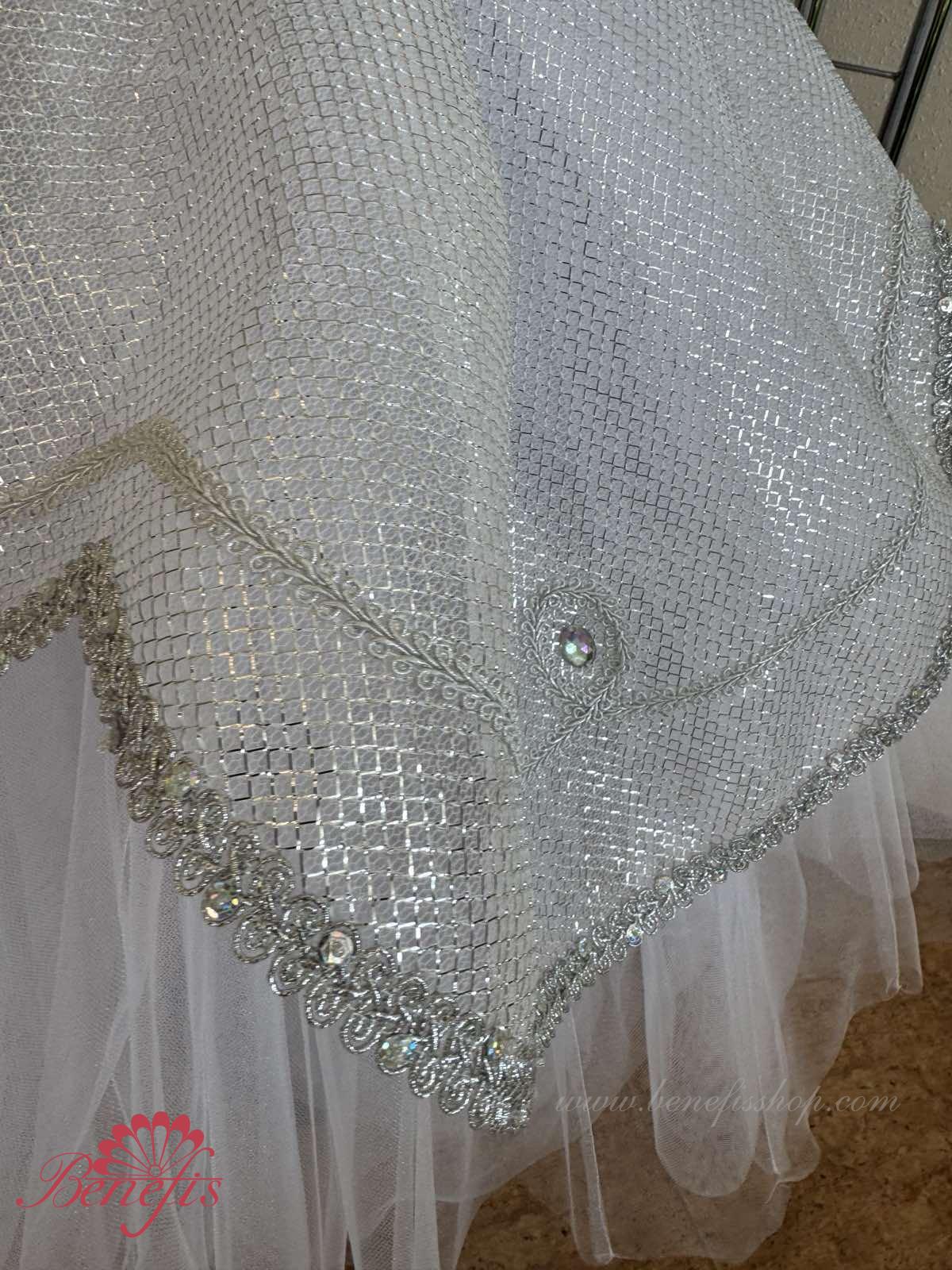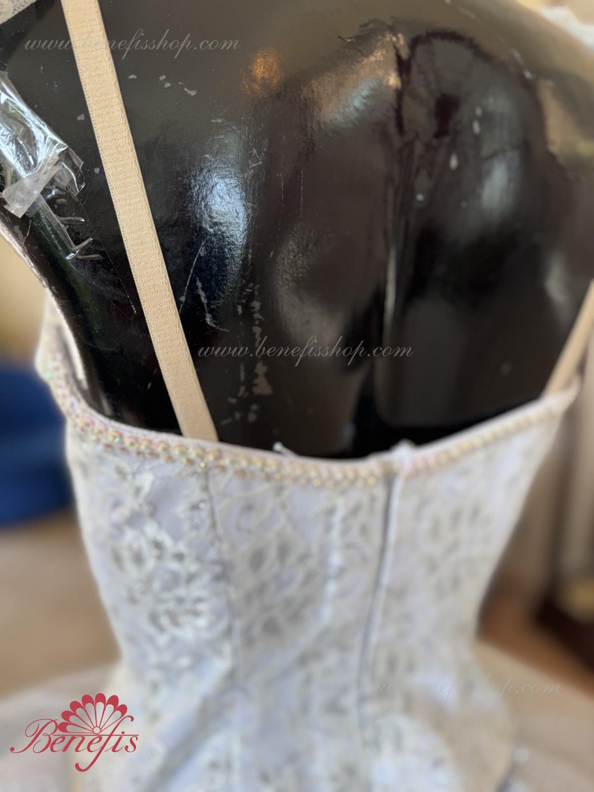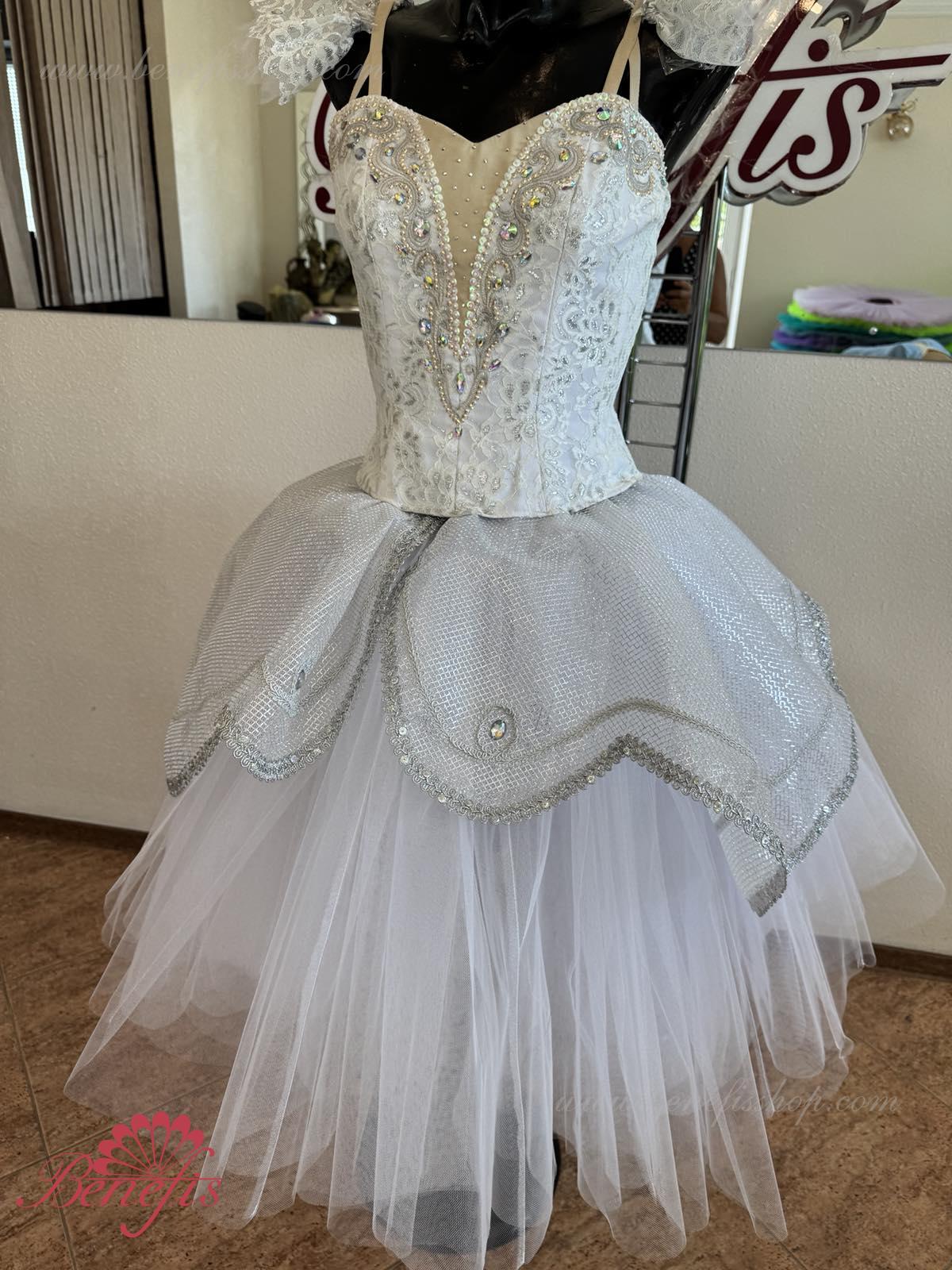 Details: costume, armbands. The bodice, with elastic straps and a flesh insert on the chest, is made of dense semi-elastic fabric duplicated with guipure. The bodice is fastened with hooks in two rows for convenient size adjustment in the chest area. The long white romantic skirt consists of many layers of airy tulle. The costume is decorated with applique patterns, sequins, elongated and round-shaped rhinestones. With one mesh tire without an upper peplum. This ballet costume can be used in various ballet variations.