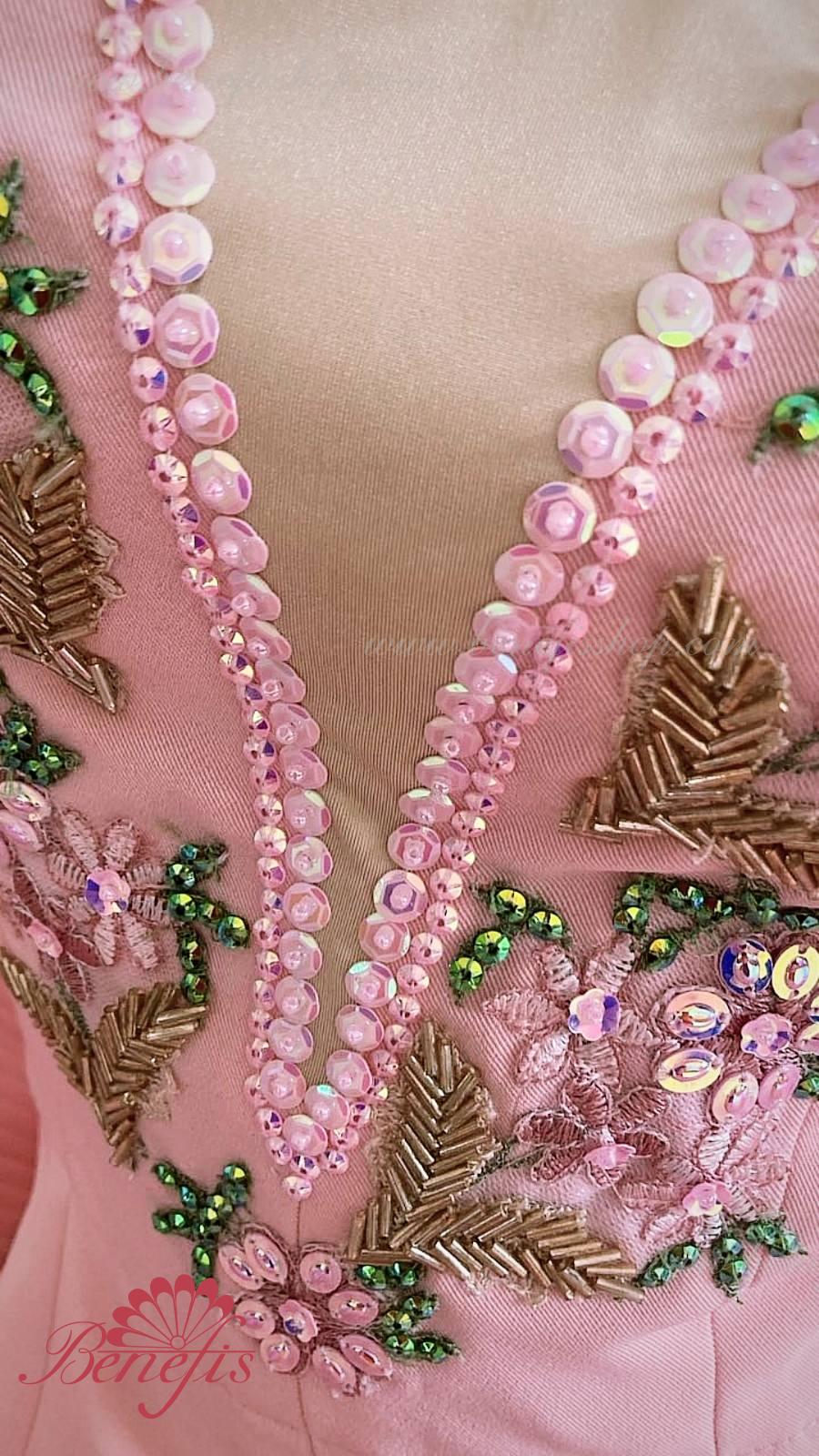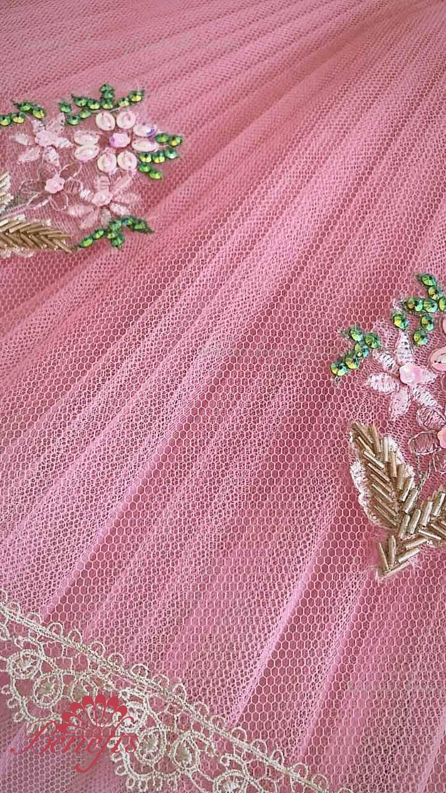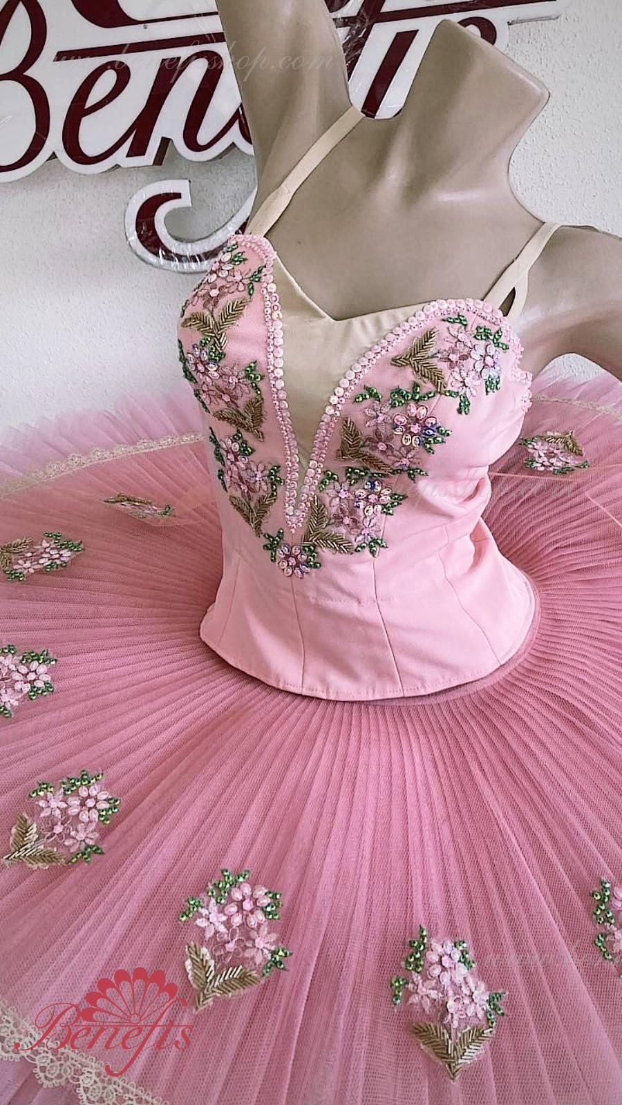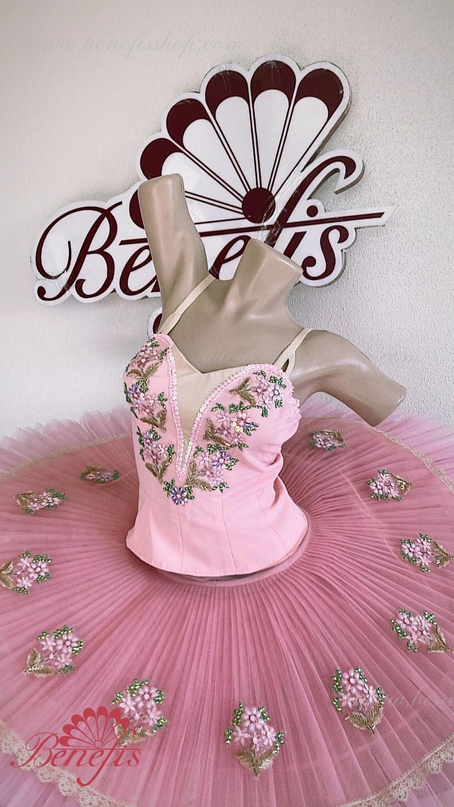 There are two rows of hooks for the comfortable adjustment and an inner cord to tighten the bodice at the chest level.Eight pleated graduated net layers of semi soft tulle- seven long and one short layer, are built on net panties with 10 cm basque attached to an elastic waistband. Two crinoline resilient hoops is inserted in the middle layer with two extra short ruffles on the edge. The length of the top layer is 36-38 cm, with each successive layer being 4 cm shorter than the previous layer. Six large hook and eyes are attached at the back to fasten the skirt.Decor: rhinestones, sequins, beads.