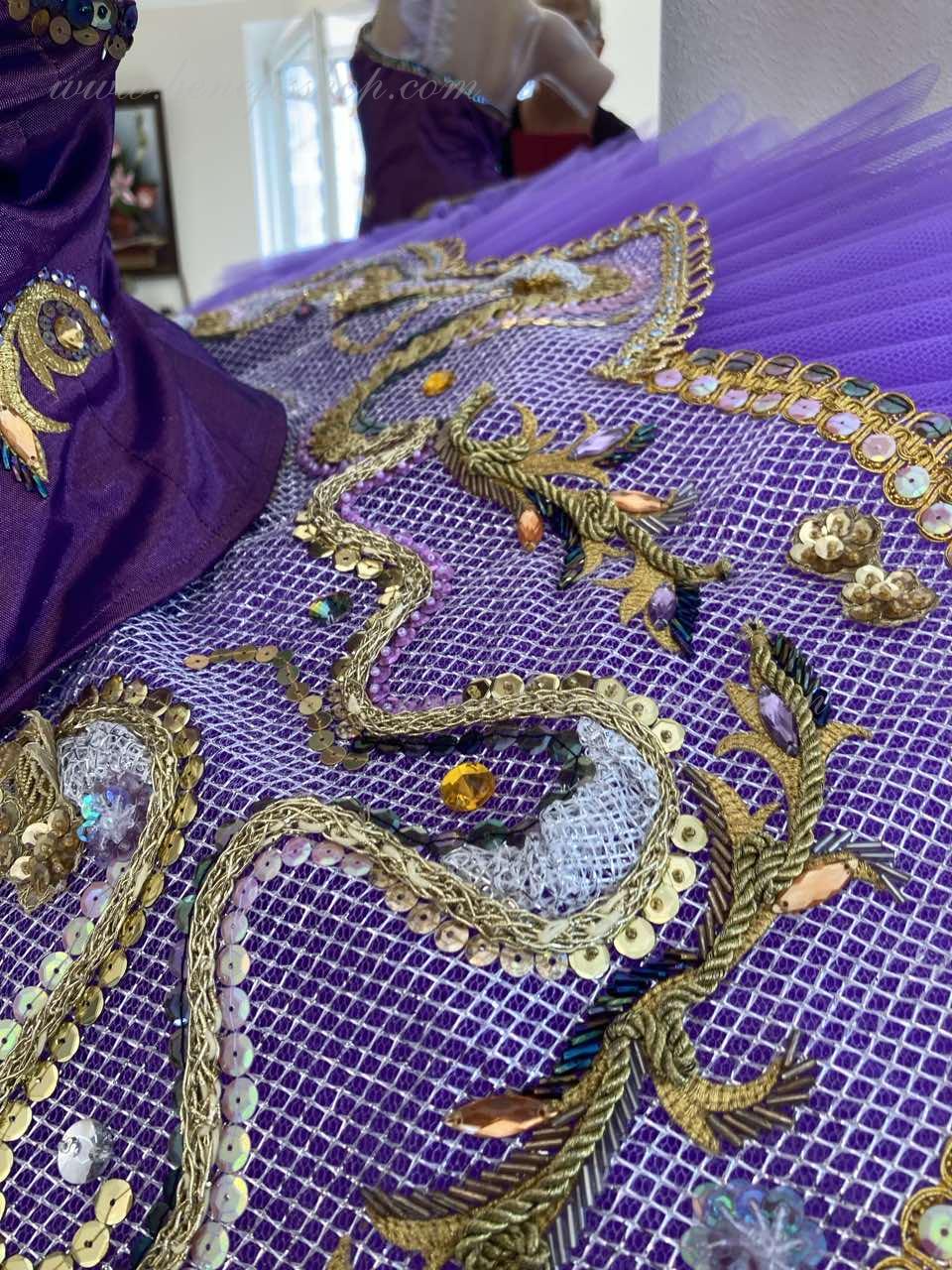 The tutu skirt’s upper layer is all over embroidered with glass beads.