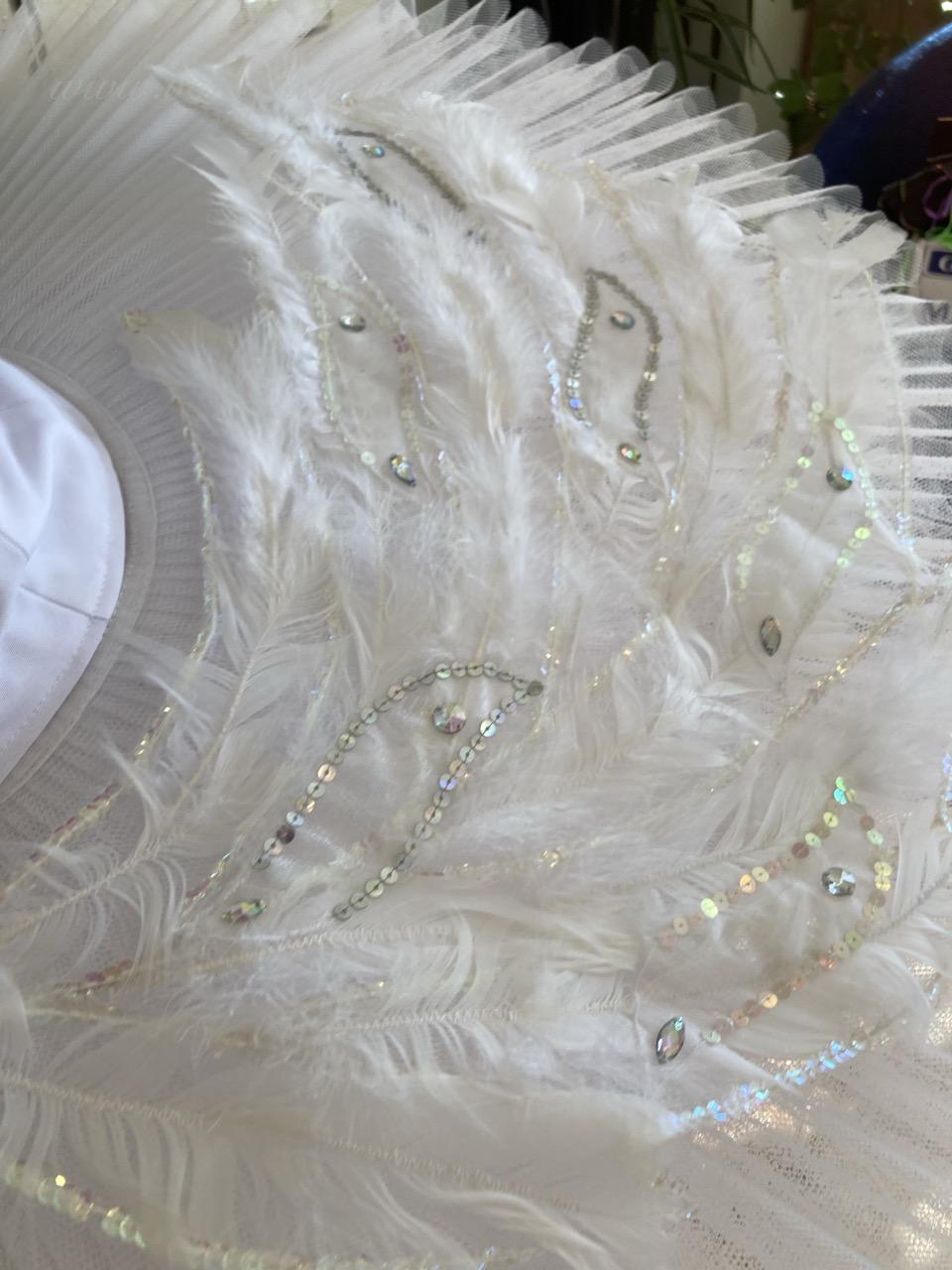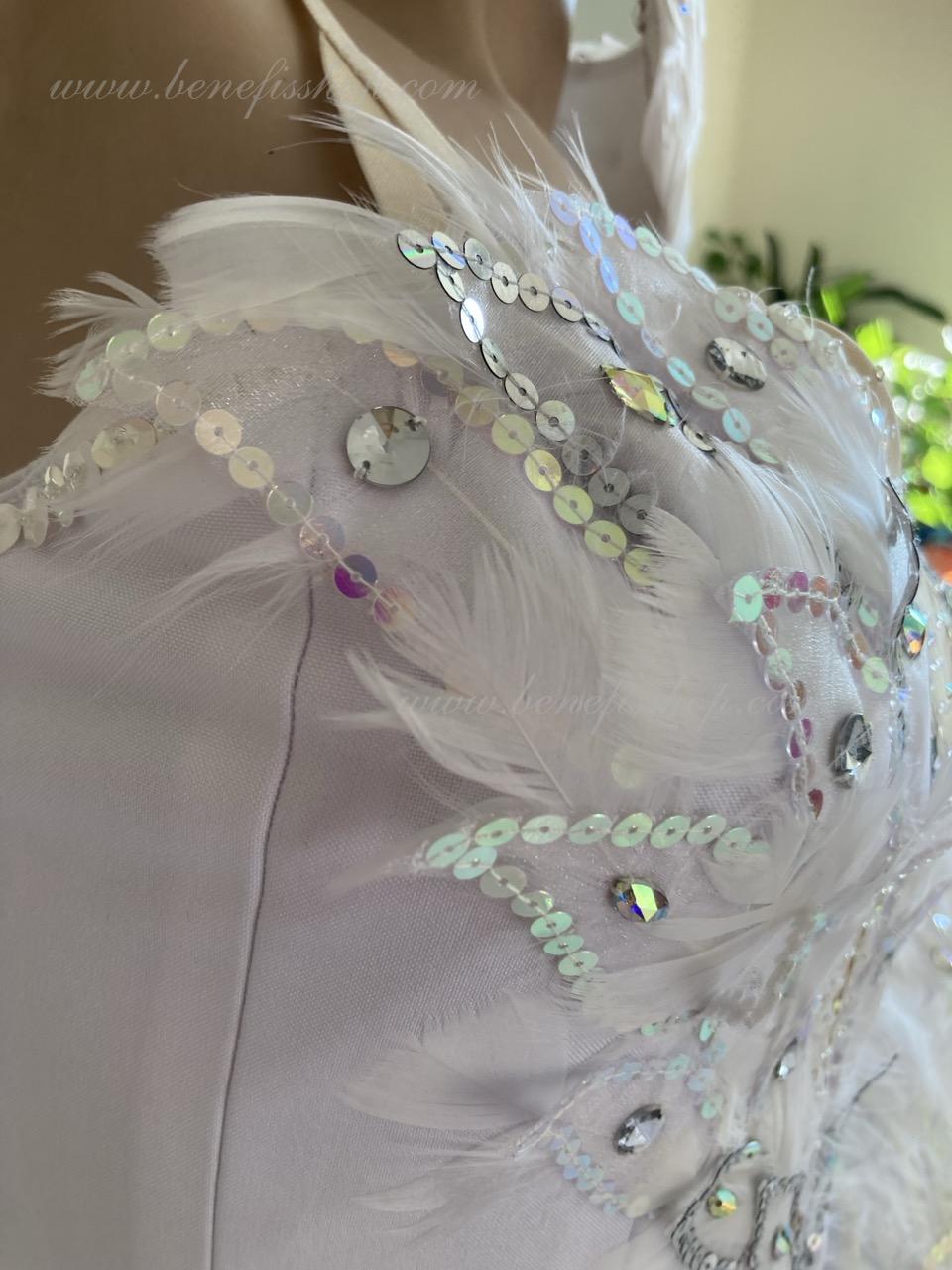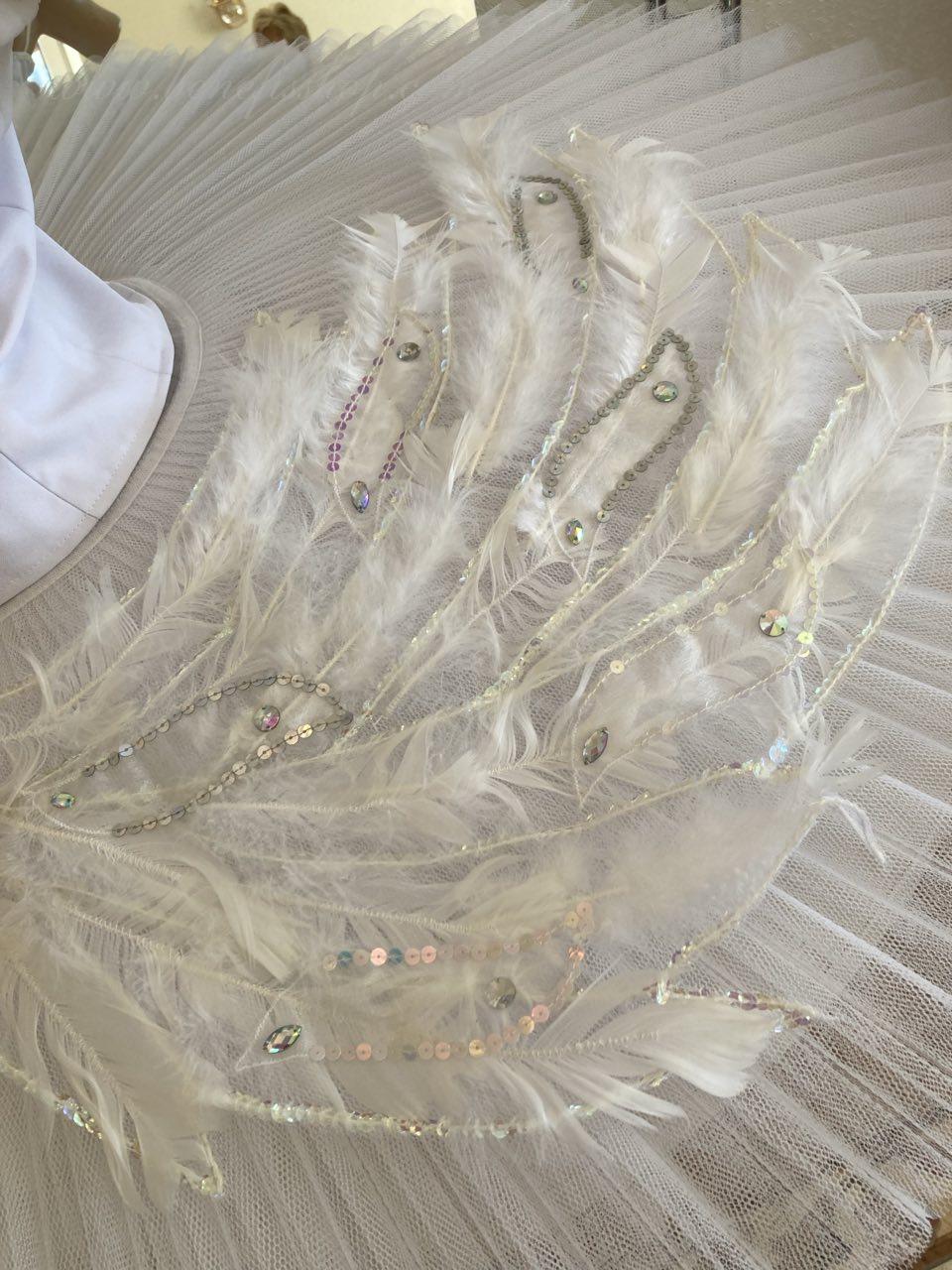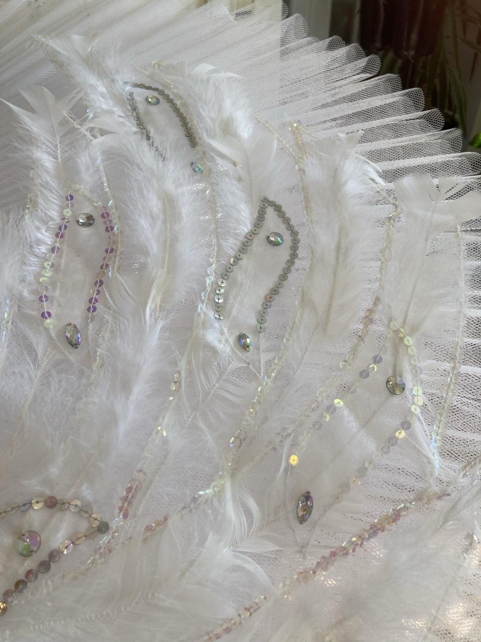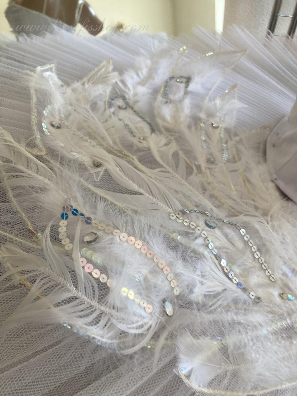 On the top layer of this stage ballet tutu, there is an application pattern in the shape of wings. White swan’s down, white crystals of different sizes, bugles, spangles, beads, sparkles with hologram and without it are used as decoration for tutu and bodice. Such decoration looks wonderful from the stage.