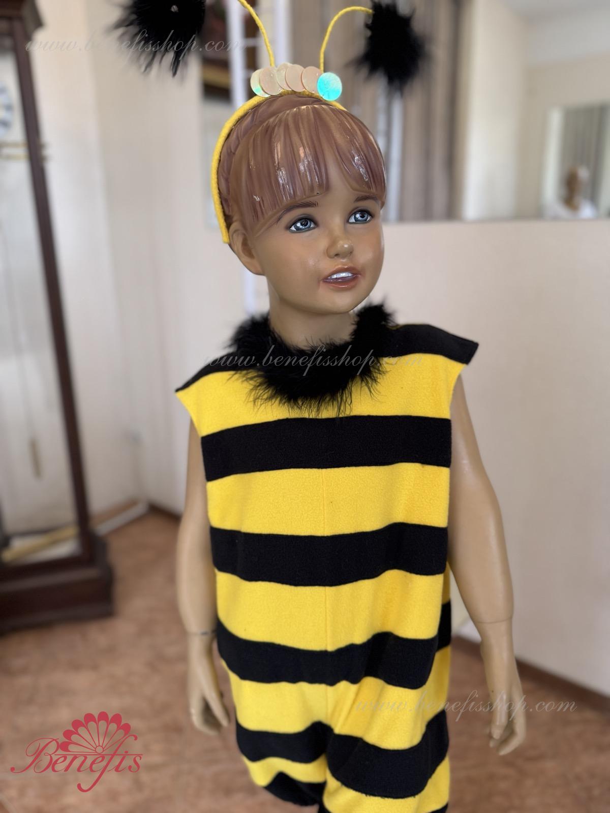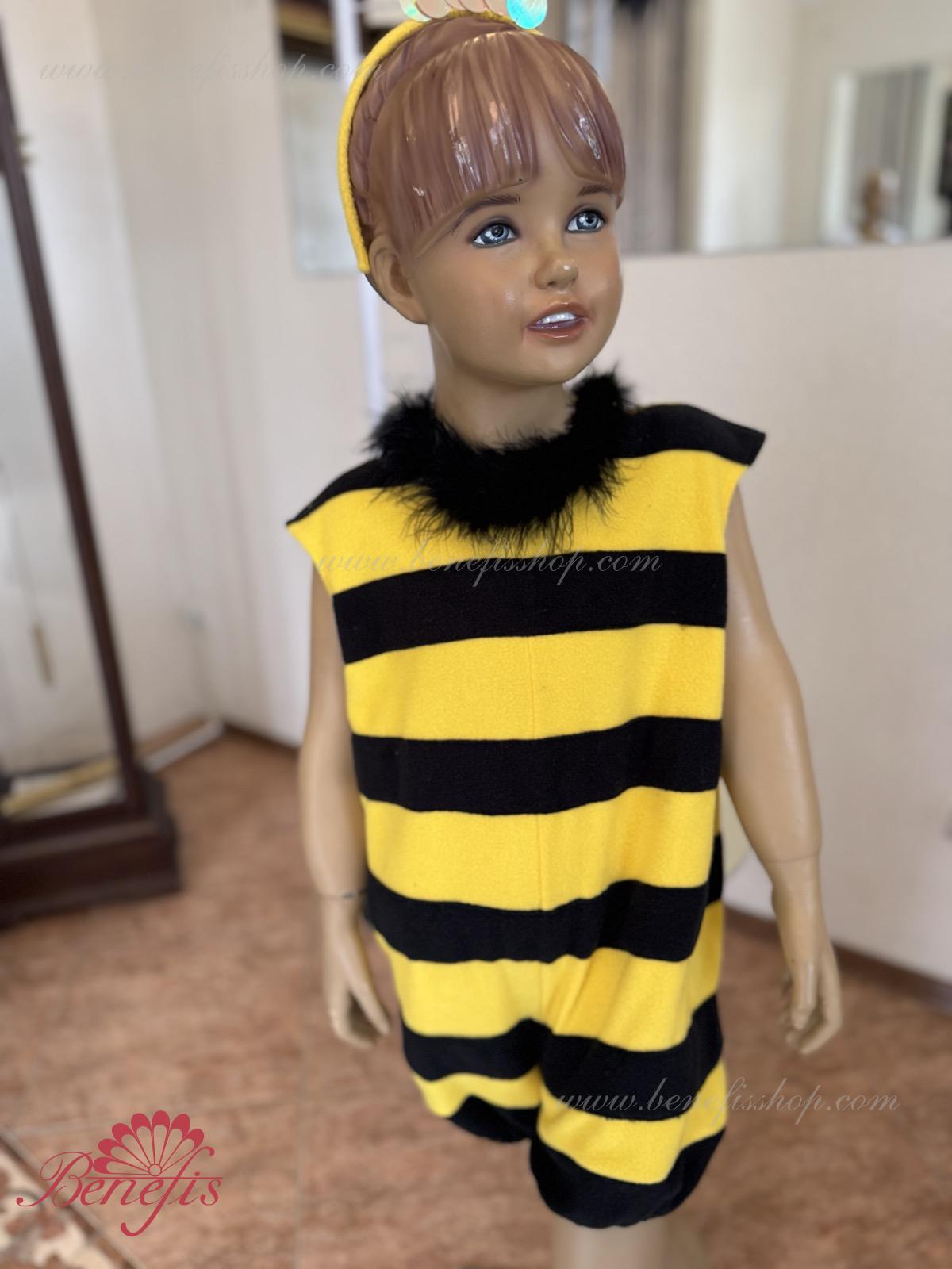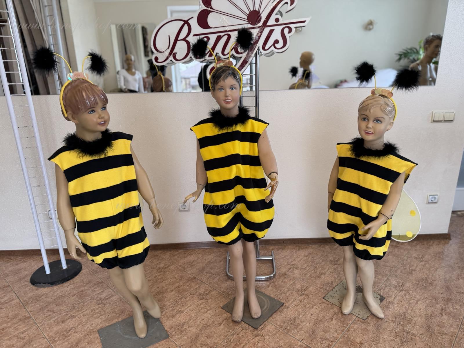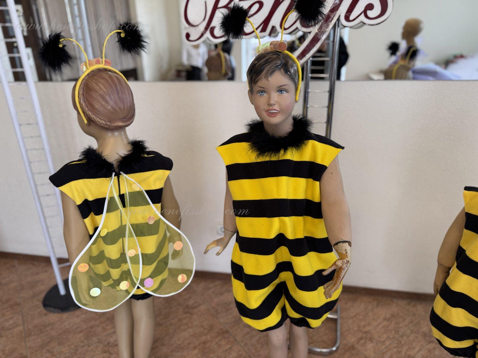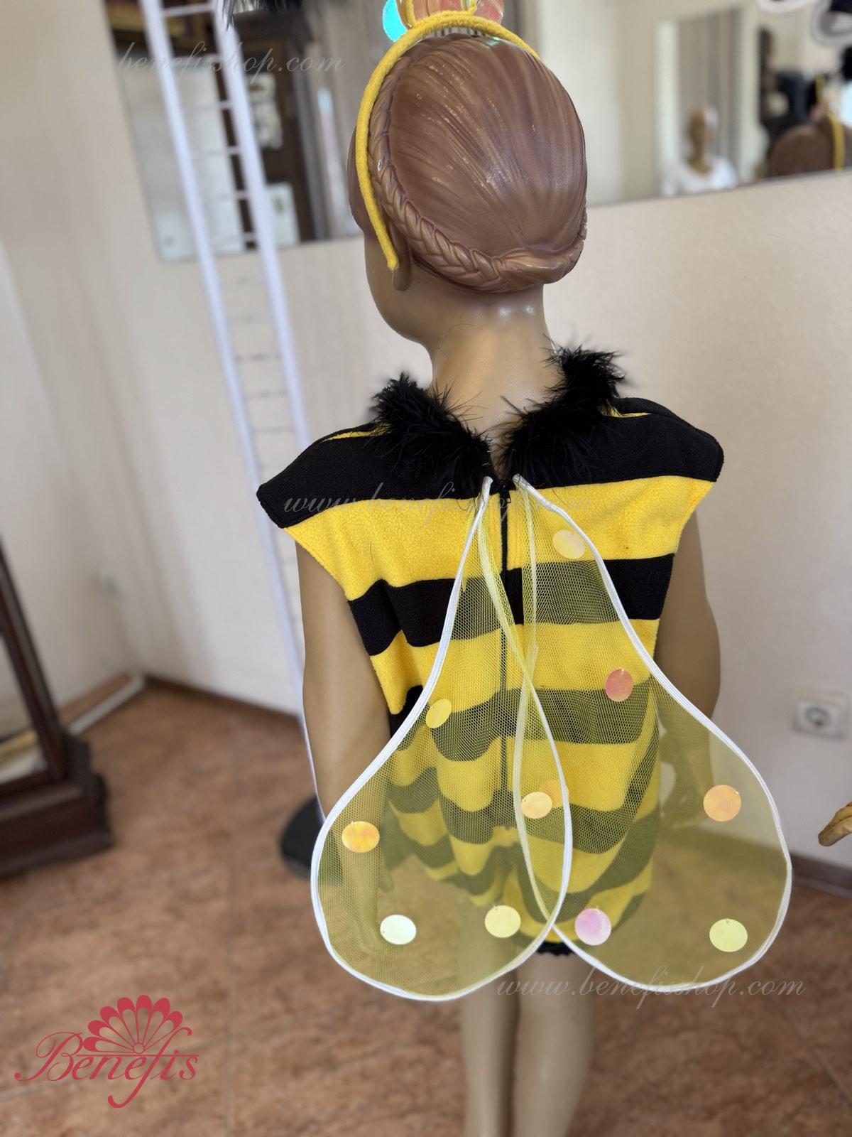 The unitard with the short trouser legs is made of soft fabric of two colors. The wings are fixed on the back. The unitard’s edges and the orifice are trimmed with swan’s down. The wide trouser legs of the unitard are stretched with elastic. The head-piece and the wings are embellished with large round applications.