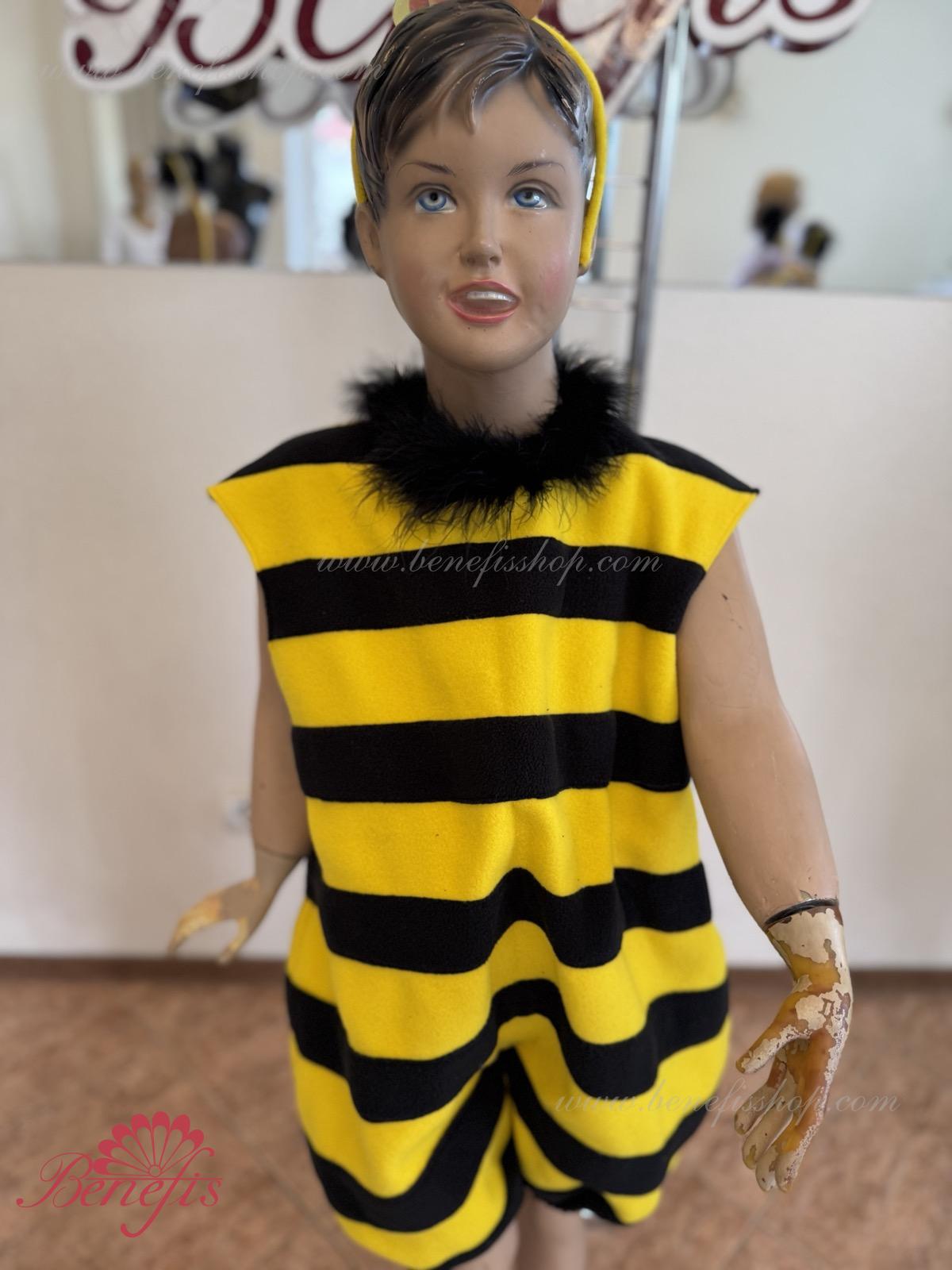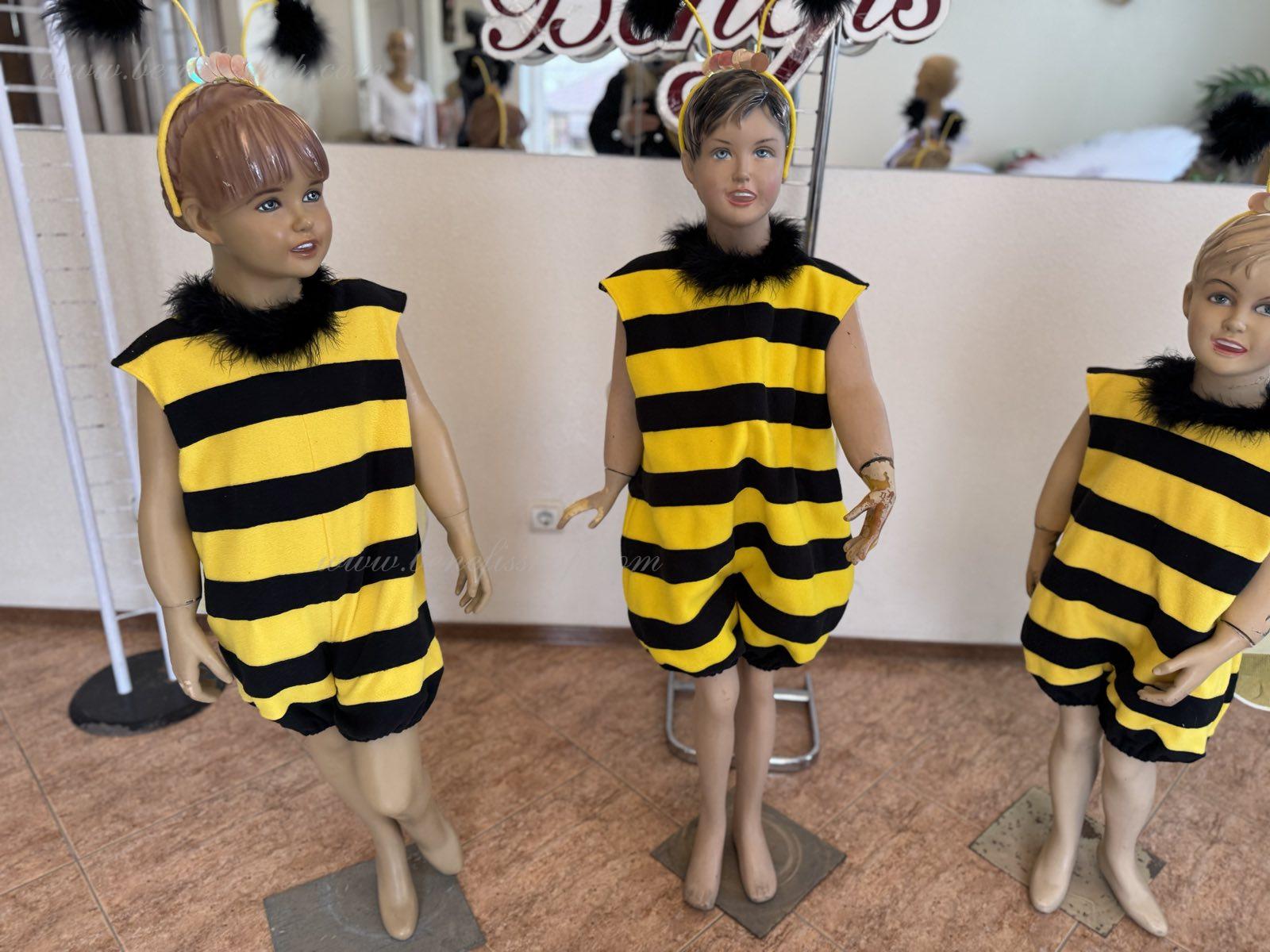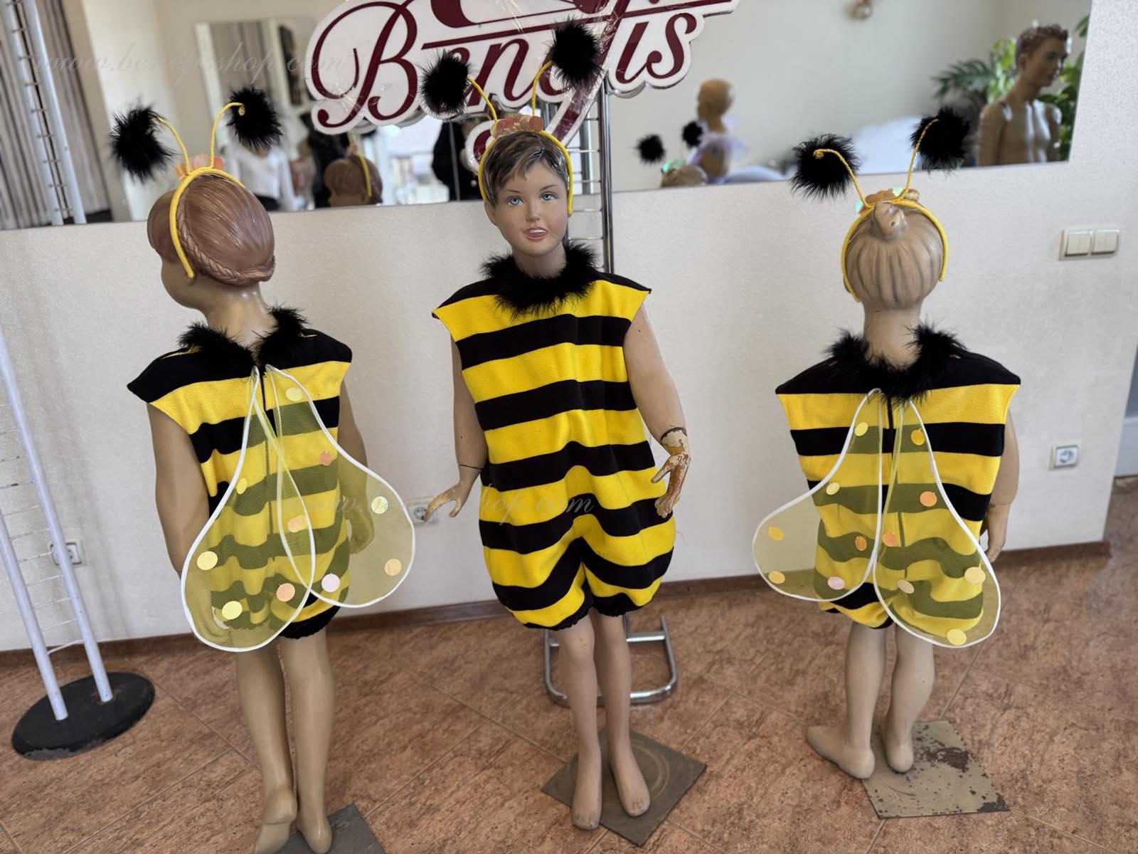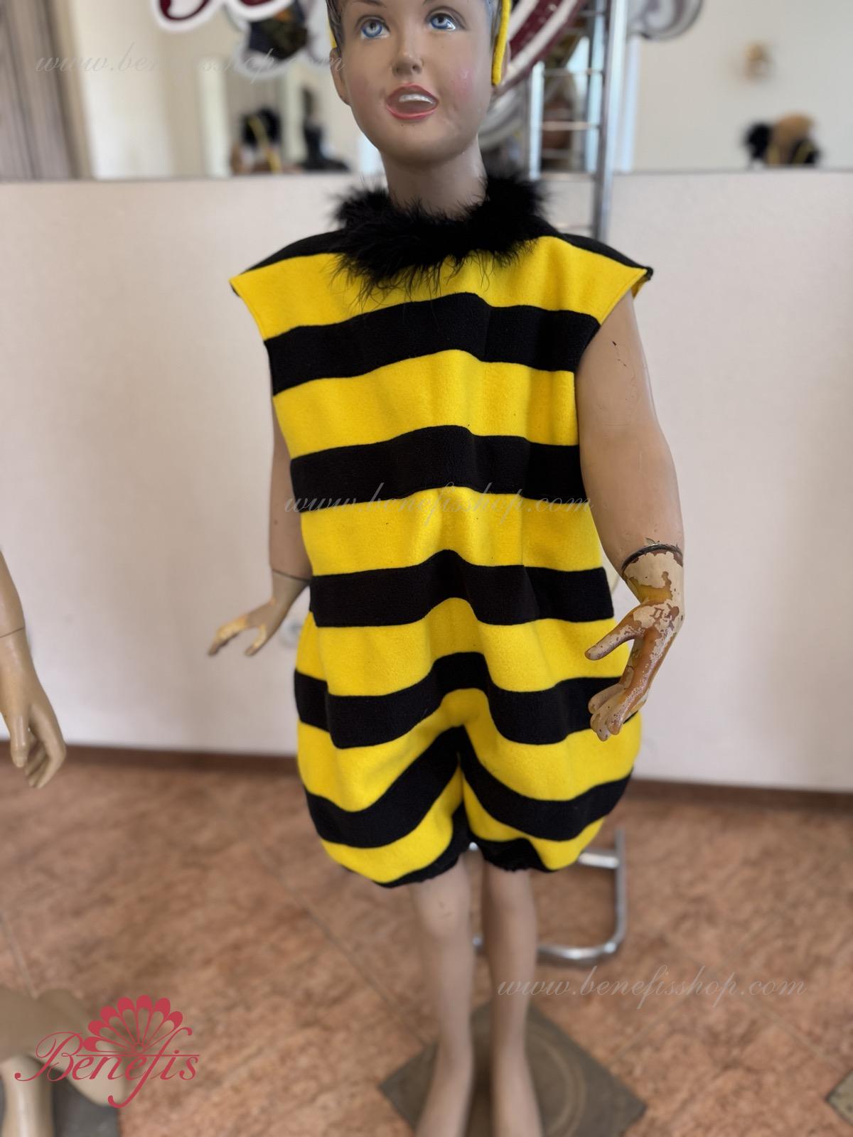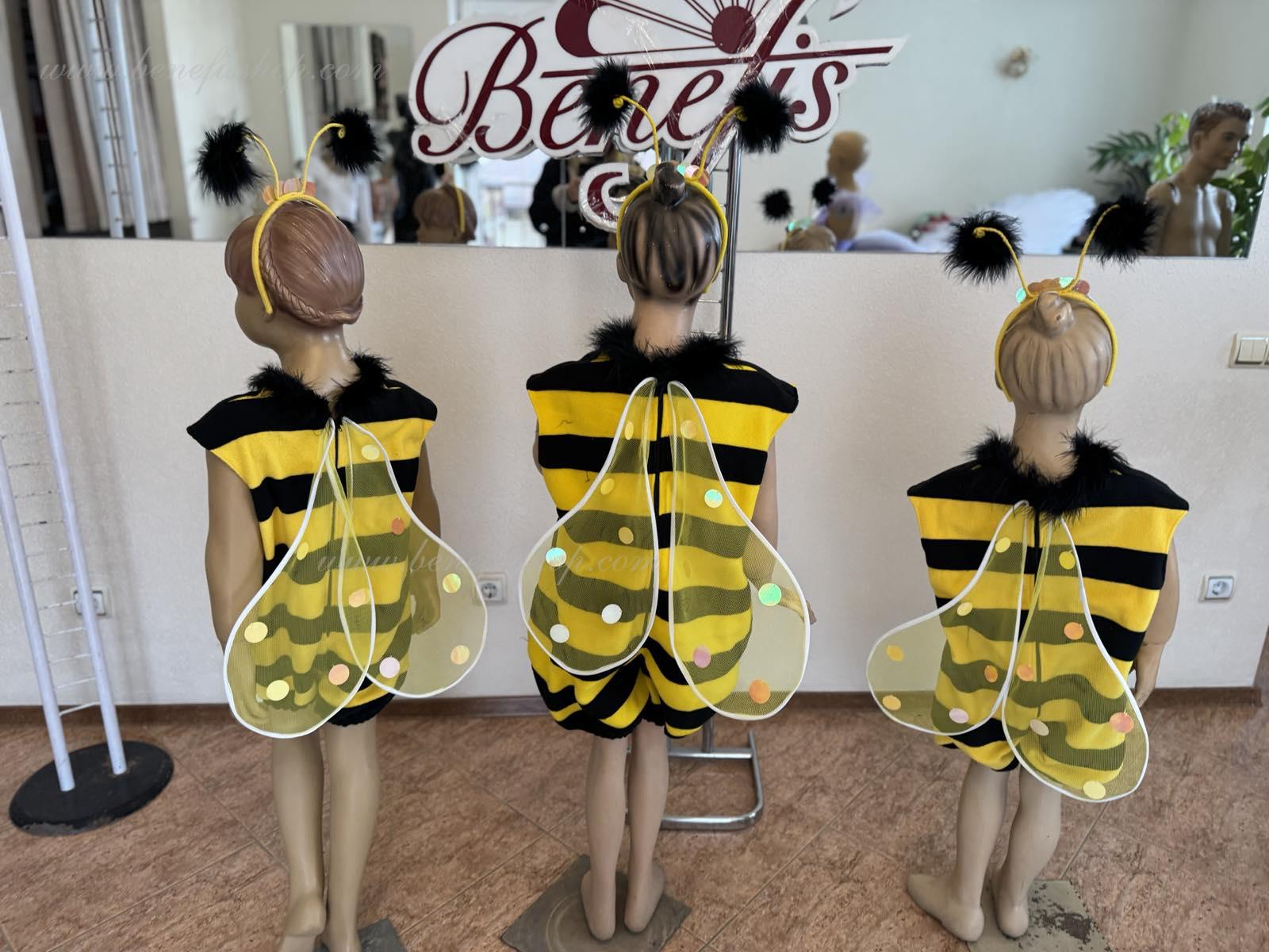 The unitard with the short trouser legs is made of soft fabric of two colors. The wings are fixed on the back. The unitard’s edges and the orifice are trimmed with swan’s down. The wide trouser legs of the unitard are stretched with elastic. The head-piece and the wings are embellished with large round applications.