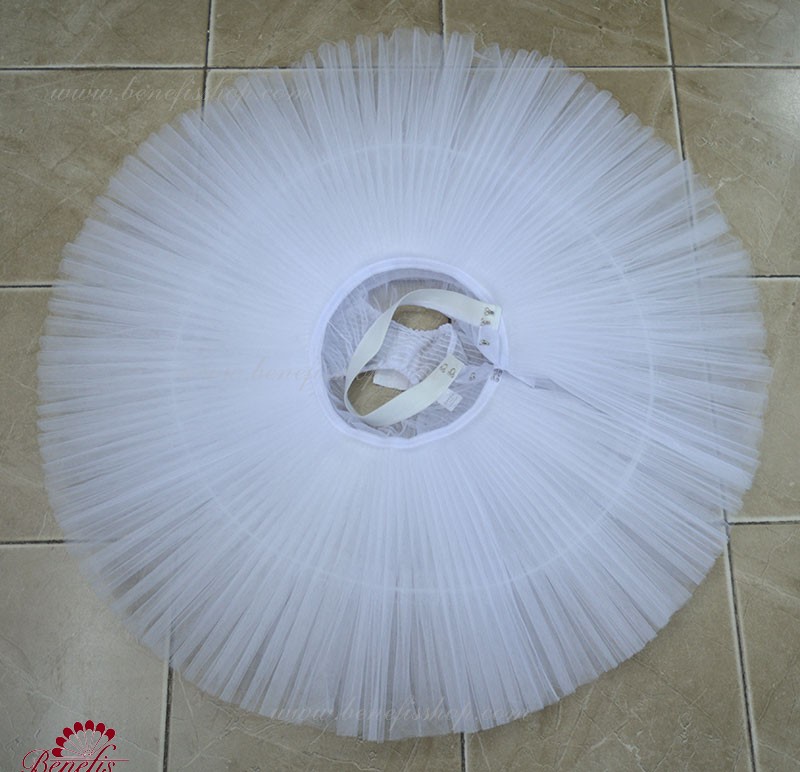 The first two layers are shorter on the 2 cm than the previous and every next layers is shorter on the 5 cm.Five large hook and eyes are attached at the back to fasten the skirt.