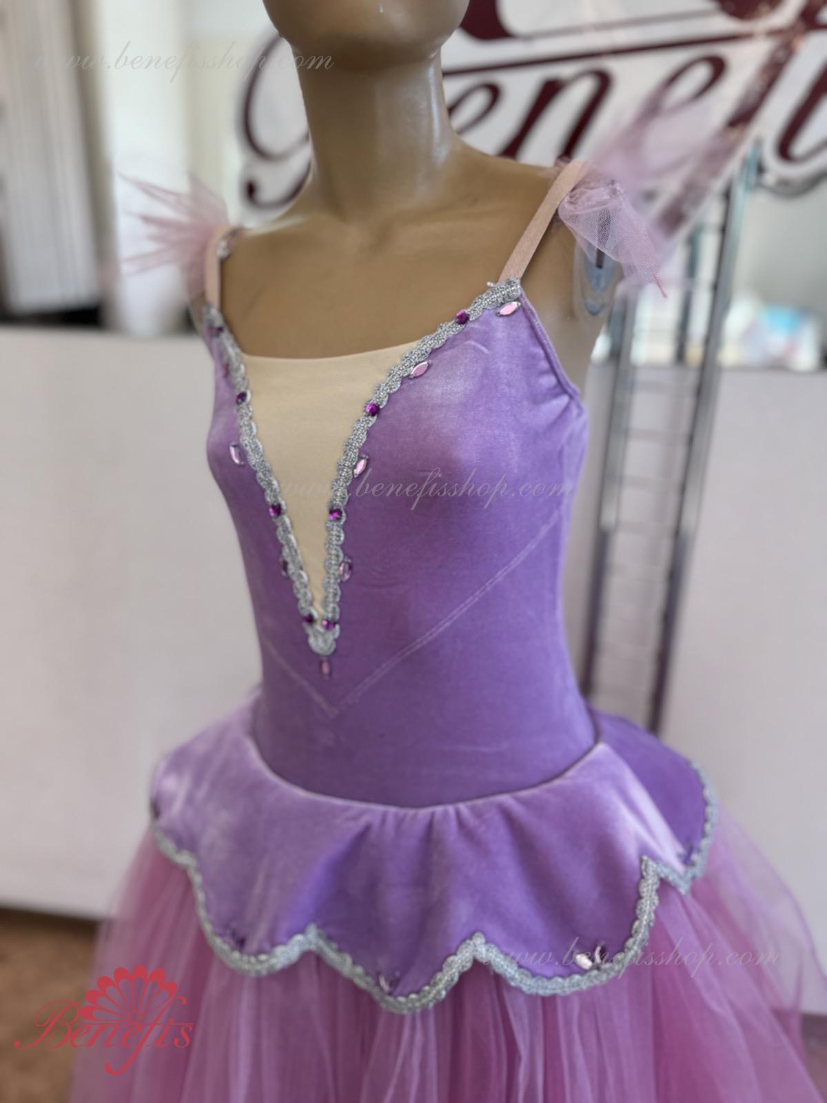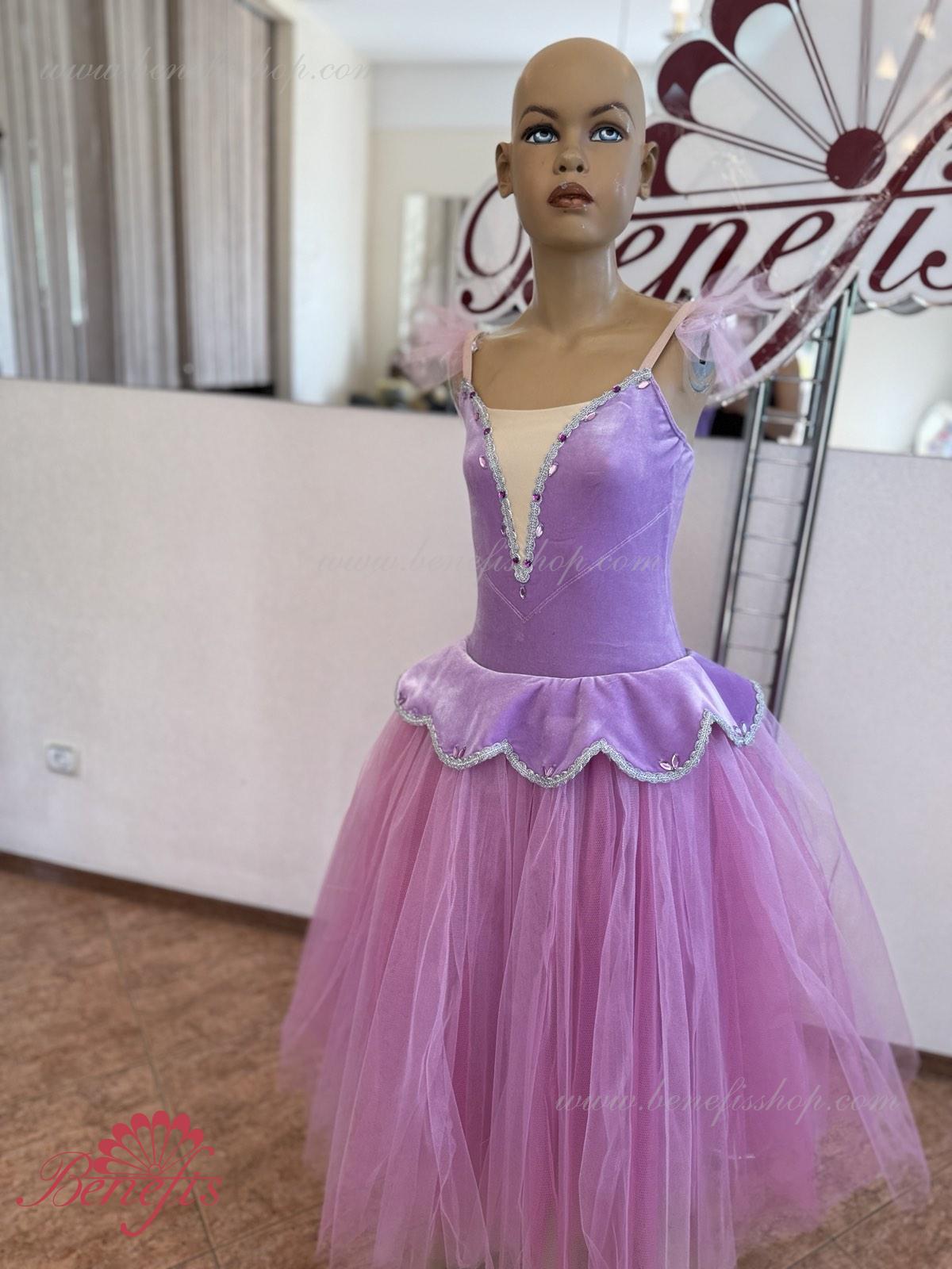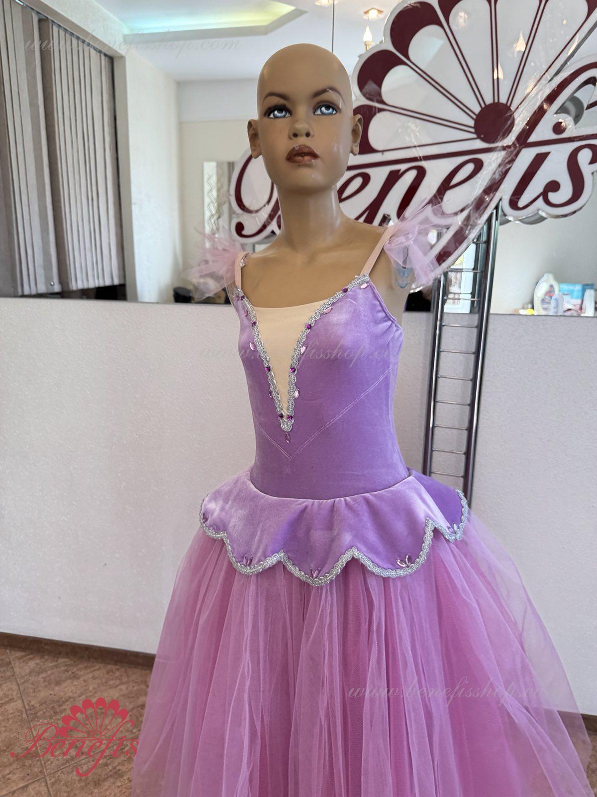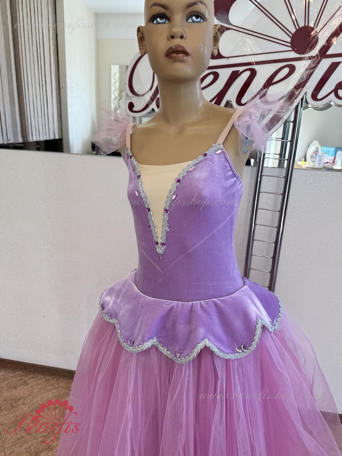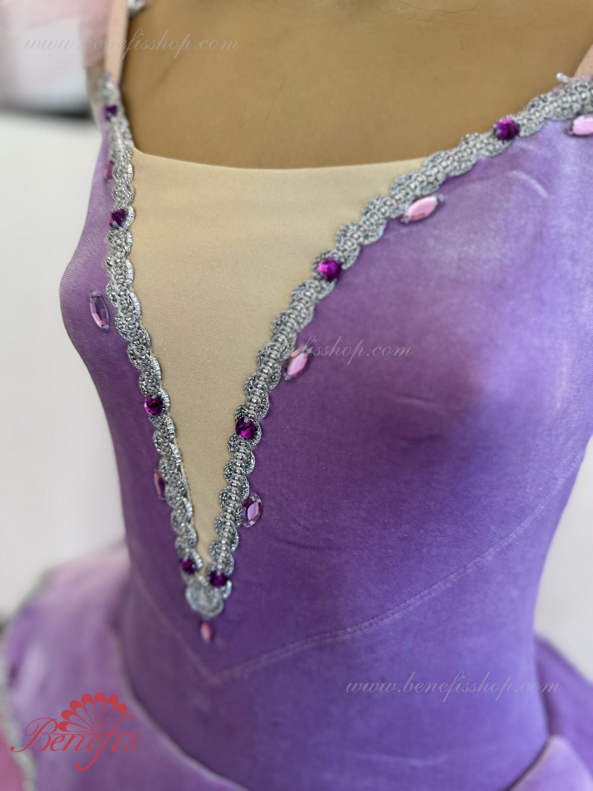 Details: suit, armbands. This professional stage costume is made on the basis of a professional basic romantic tutu #T0008 (see the section \"Basic tutus\") made of 4-layer tulle. The bodice is made of elastic velvet swimsuit with elastic straps and decorated with elegant applications. The tutu (skirt) itself is made in a romantic style. The petal-shaped cover is made of the same fabric as the bodice.