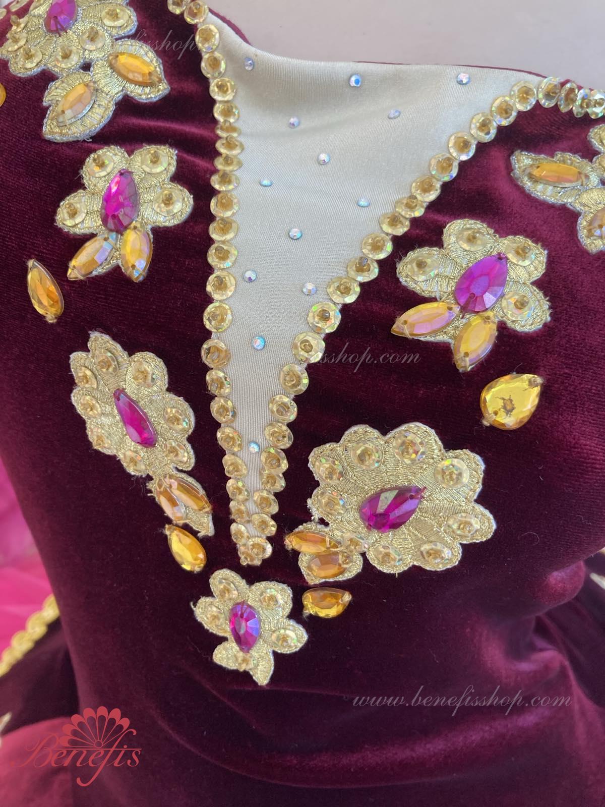 The applications of different colors, crystals, braid, sparkles, and pearls impart an original look to the costume.