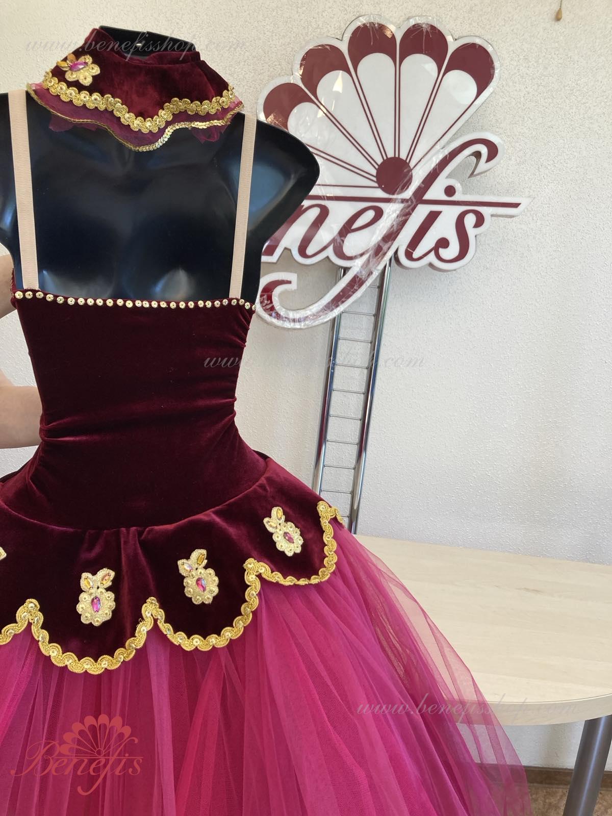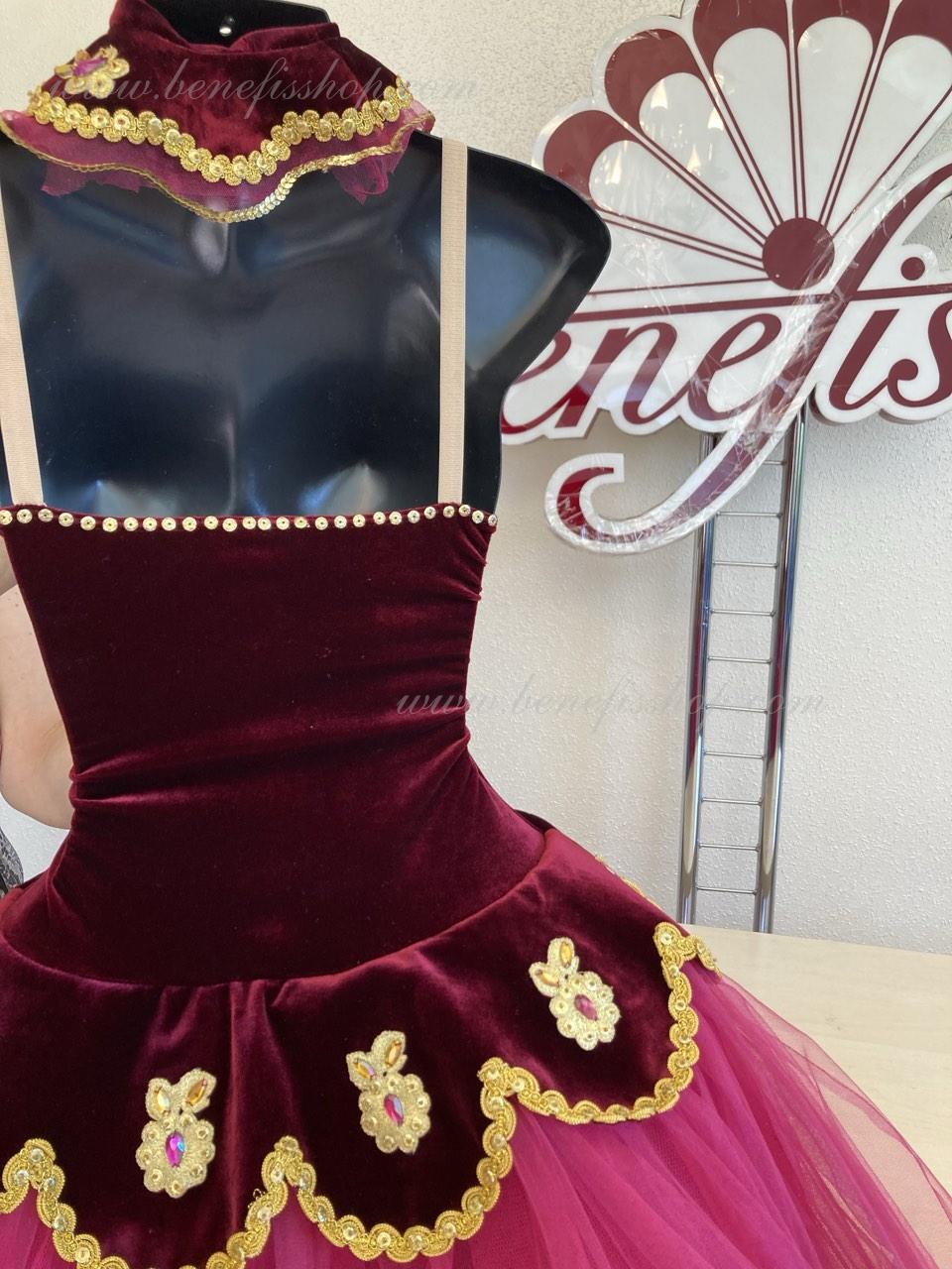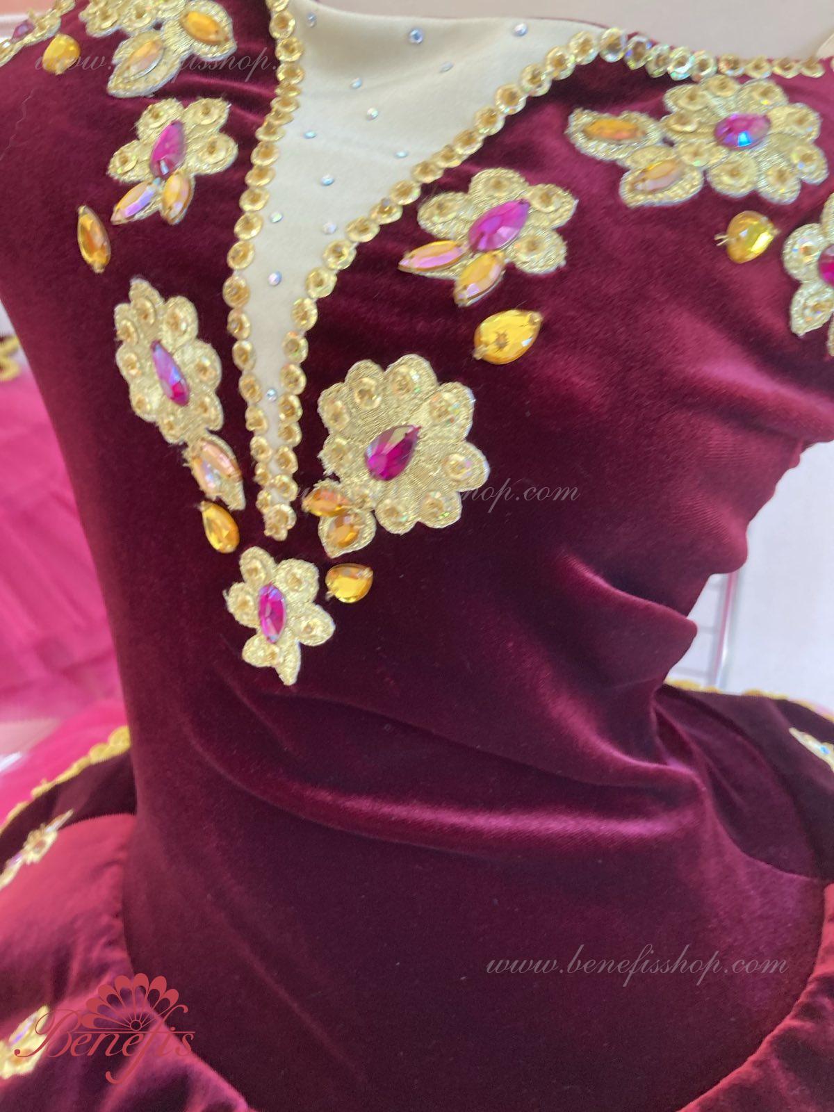 Details: costume, arm ruffles. It is a professional stage costume, which is made on the basis of the professional basic romantic tutu #T0008 (see section “Basic tutus”) and is made of tulle of 4 layers. The bodice is made of the elastic velvet leotard on elastic flesh-colored straps and is decorated with exquisite applications.