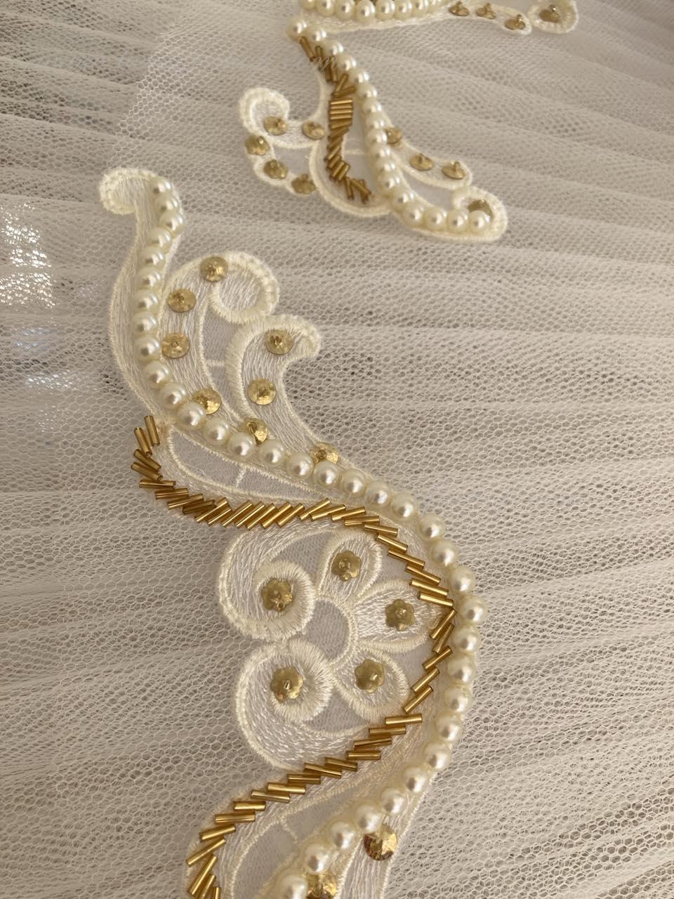 The decor is made using applique, rhinestones, sequins, beads, seed beads and bugles. Handmade.