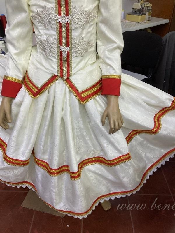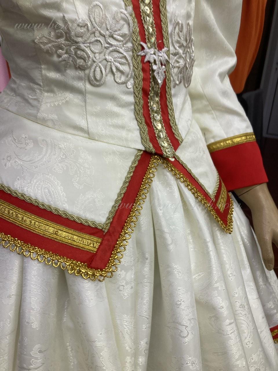Details: costume. Collet and patterned satin top skirt. It is decorated with a satin ribbon and lace braid. There is a tulle skirt T0003 under the satin.This airy romantic basic tutu consists of six layers of soft and hard tulle made from a variety of wedges. All the layers are planted on tulle panties. The panties are connected to a 7cm tulle yoke attached to an elastic waistband. The top layer is soft tulle, the second layer is hard tulle, the third layer is soft tulle, the fourth layer is hard tulle, the fifth layer is hard tulle, the sixth layer is soft tulle. The length of the skirt is made according to the customer's request. The tutu is fastened at the back with 4 hooks and loops, which are sewn in the waist area.The costume is ready for immediate shipment