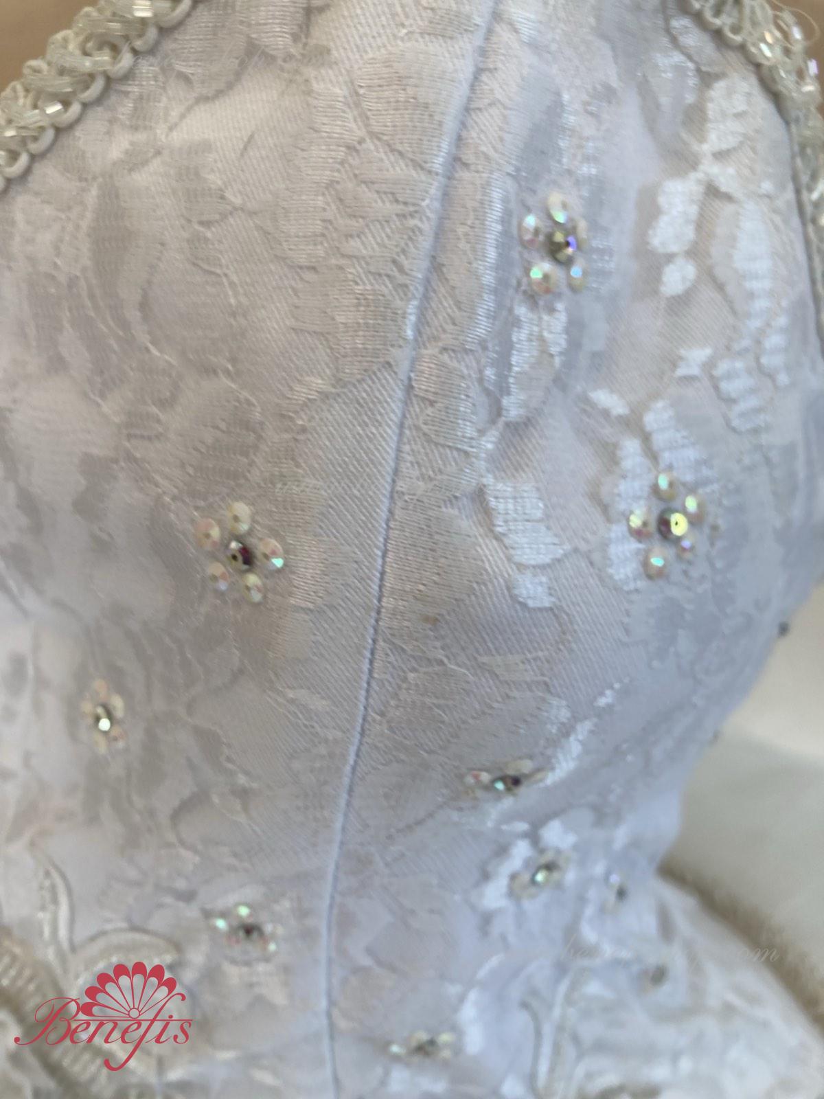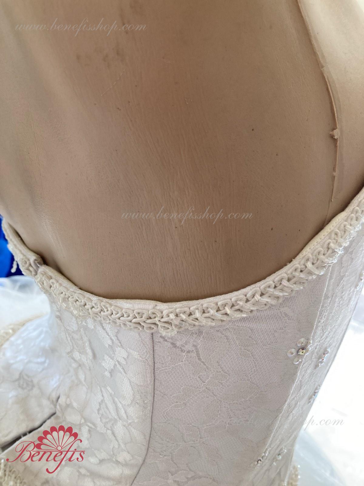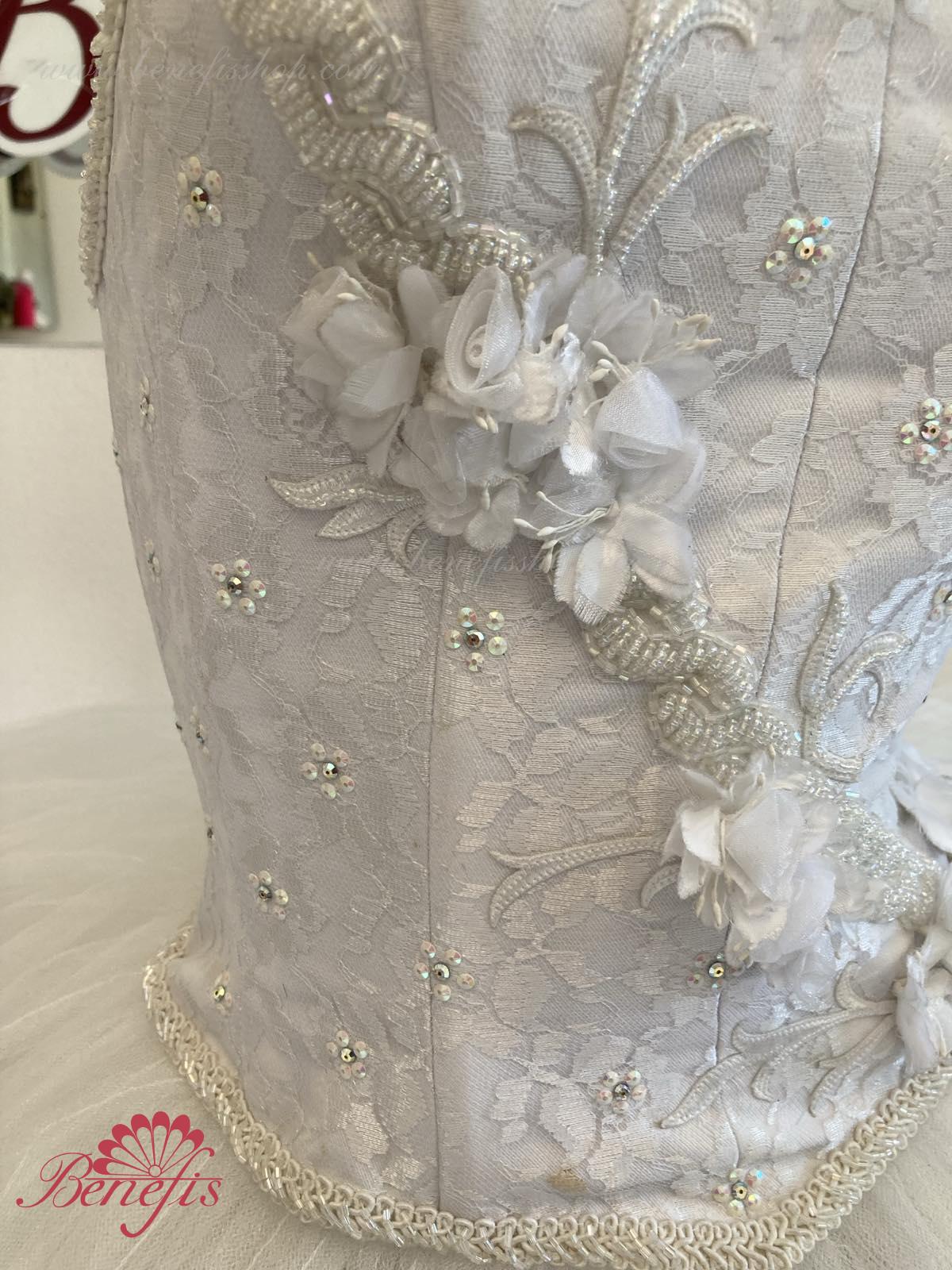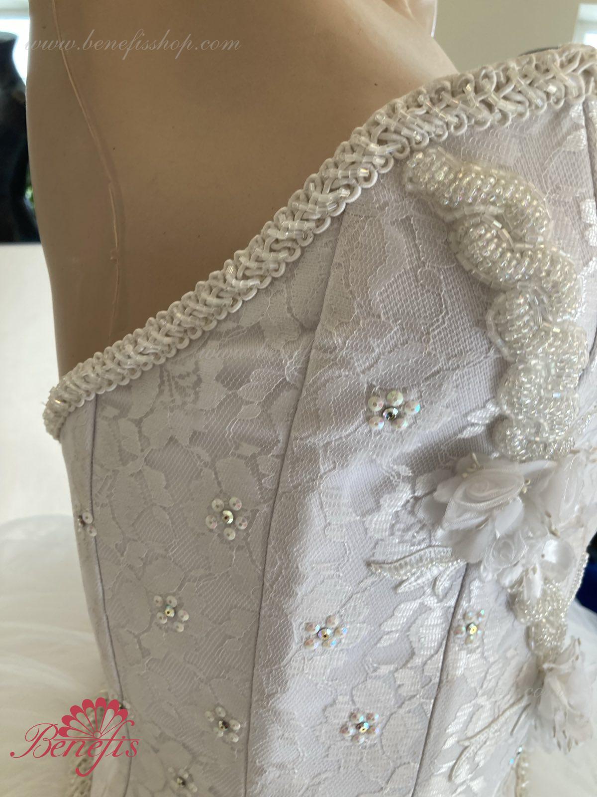 The beautifully sculptured, strapless bodice of the semi-stretched fabric is doubled with guipure and is trimmed with lace.