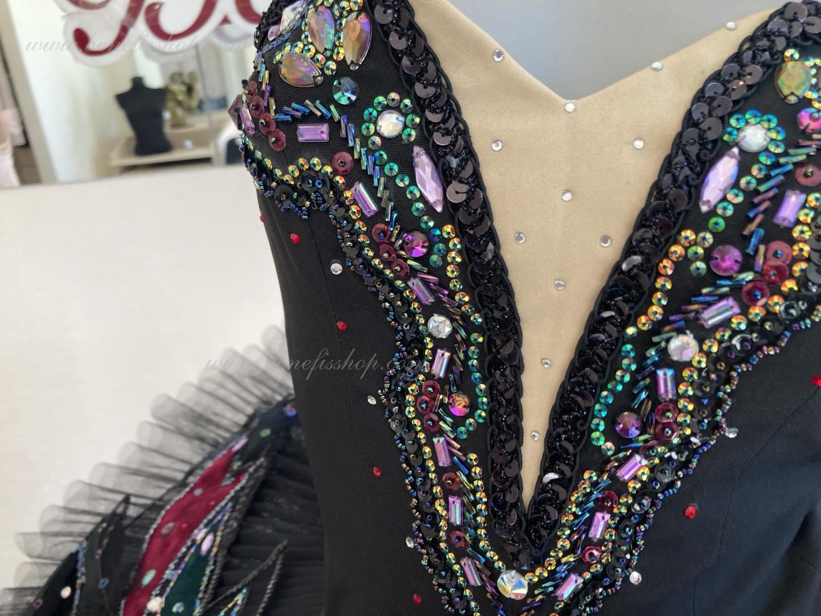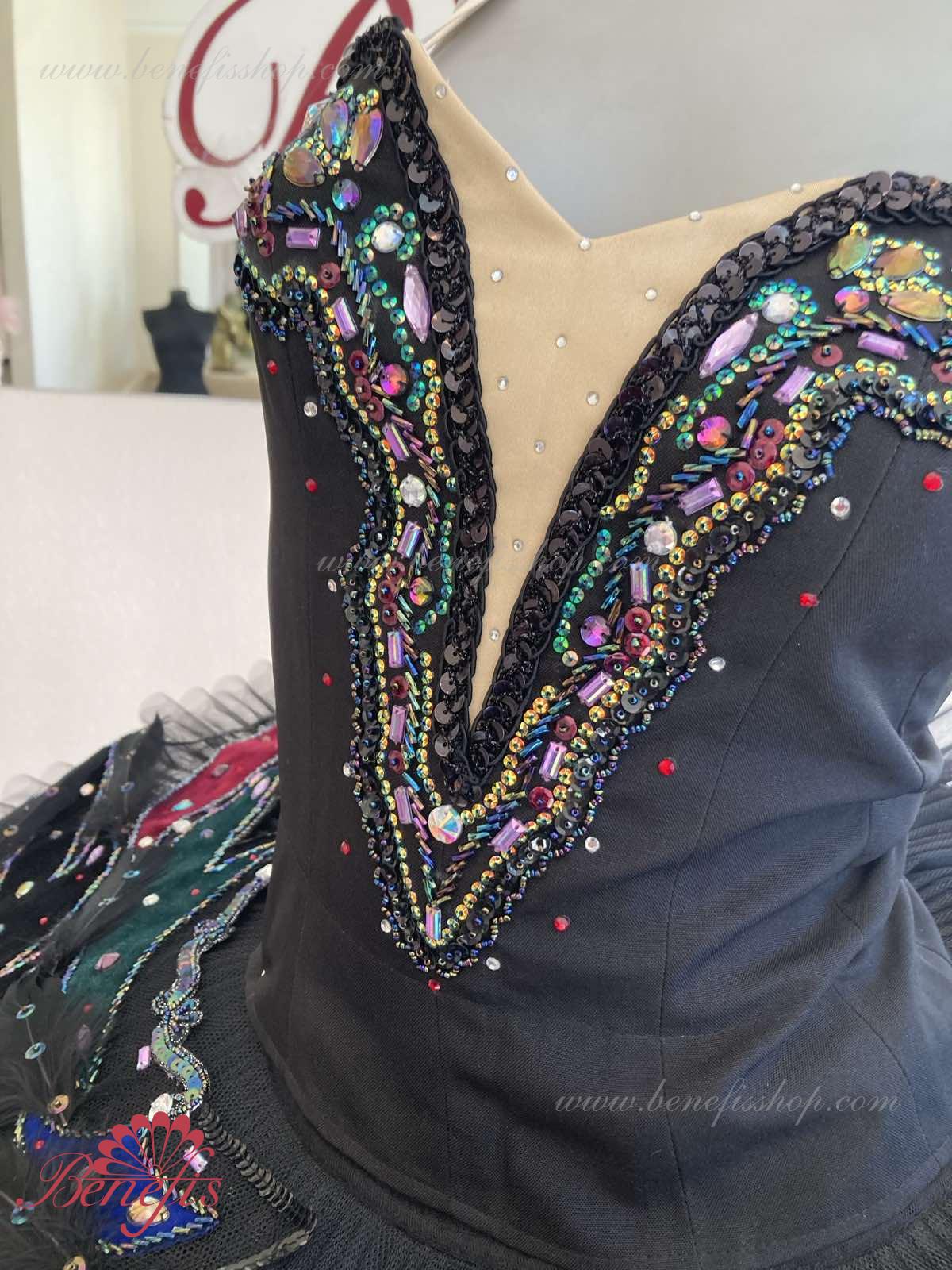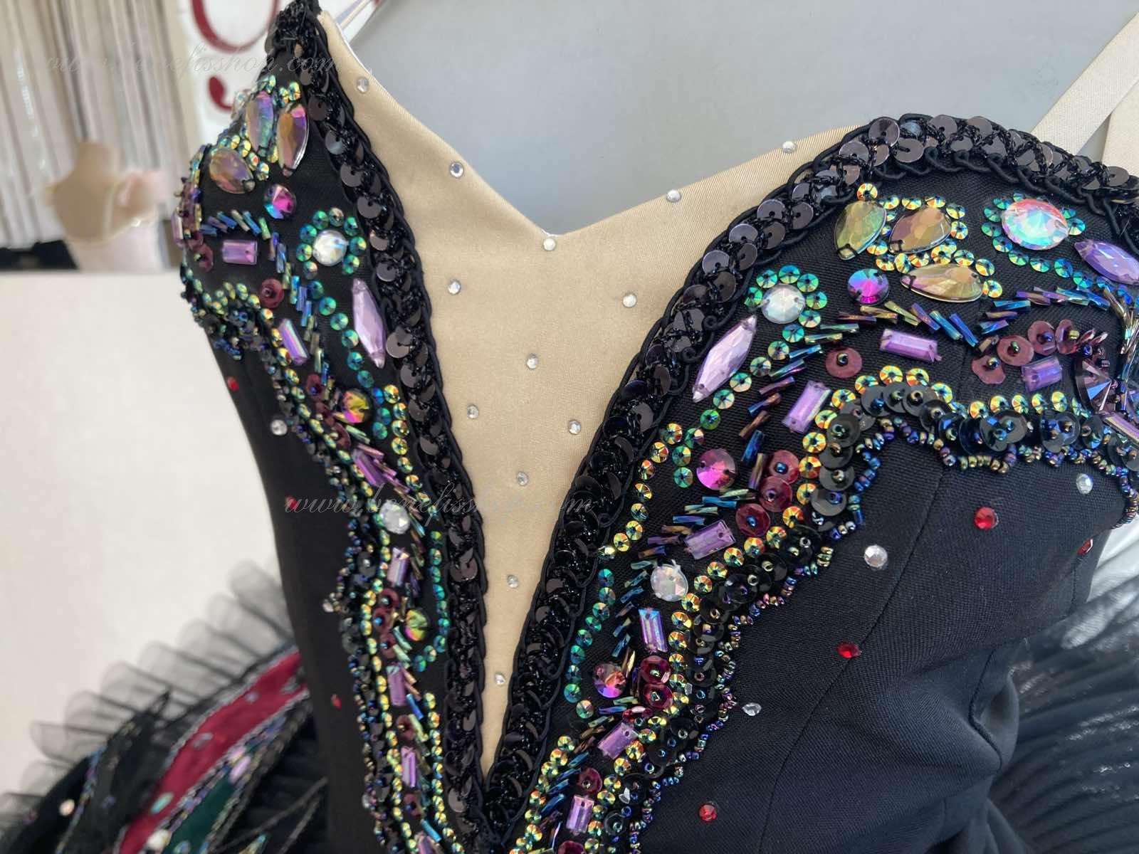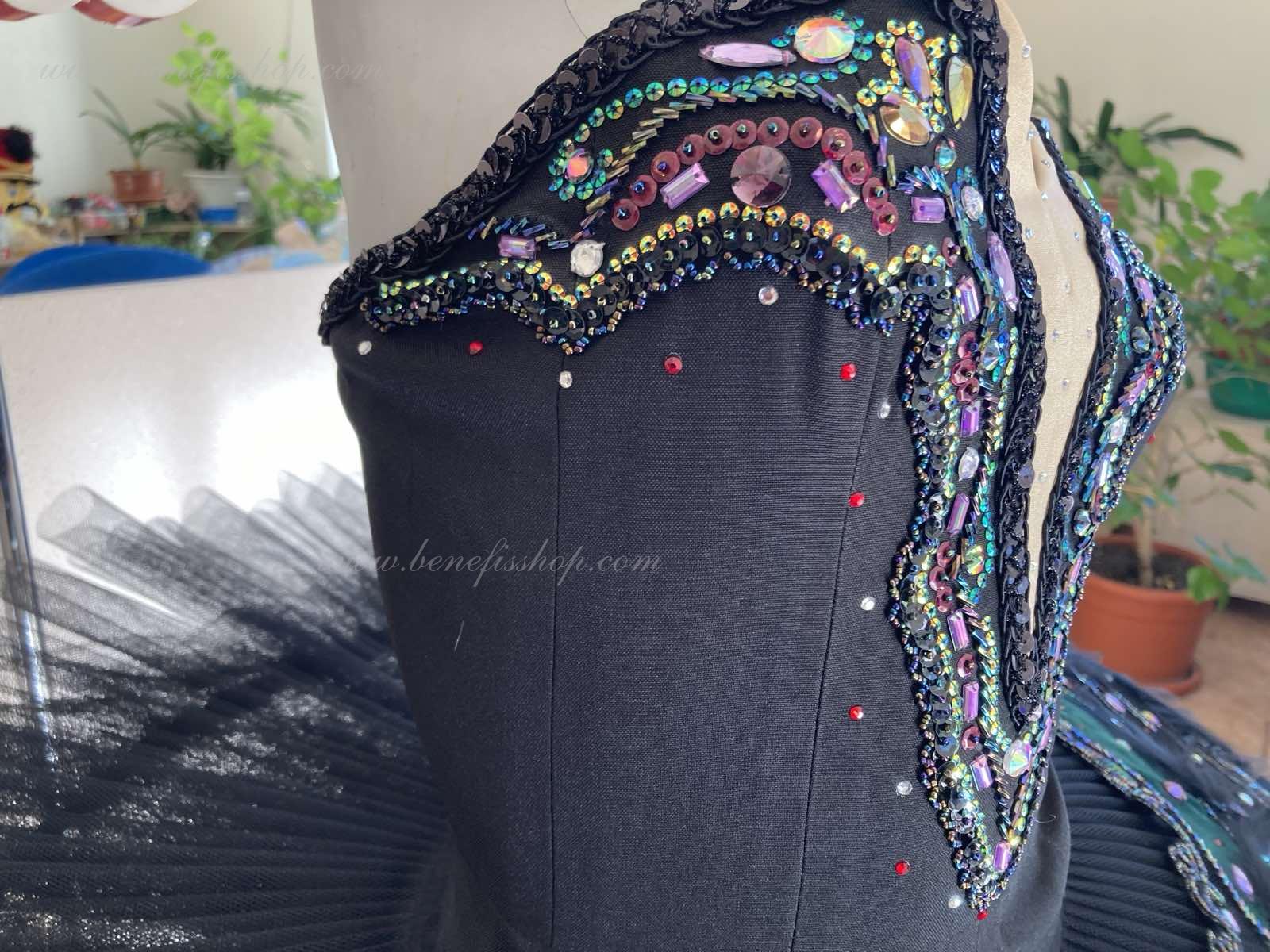 There is a velvet appliqué in the shape of wings on the top layer of skirt. Black and dark crystals, bugles, beads, natural feather, laser sparkles, applications and sparkle braid are used as decoration.
