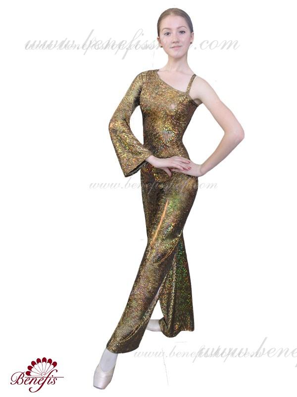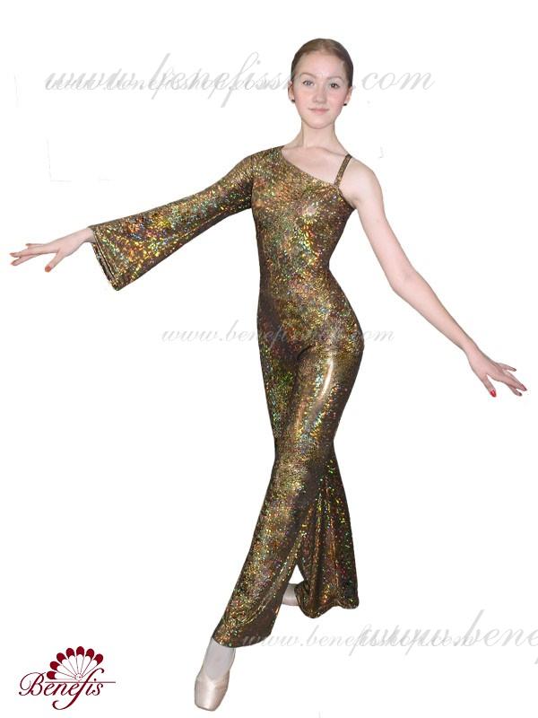This unitard model is made of supplex. The costume has only one sleeve on the right side; the left shoulder is uncovered and has a strap. The sleeve and pants are flared. This costume can be used on stage or for rehearsals.