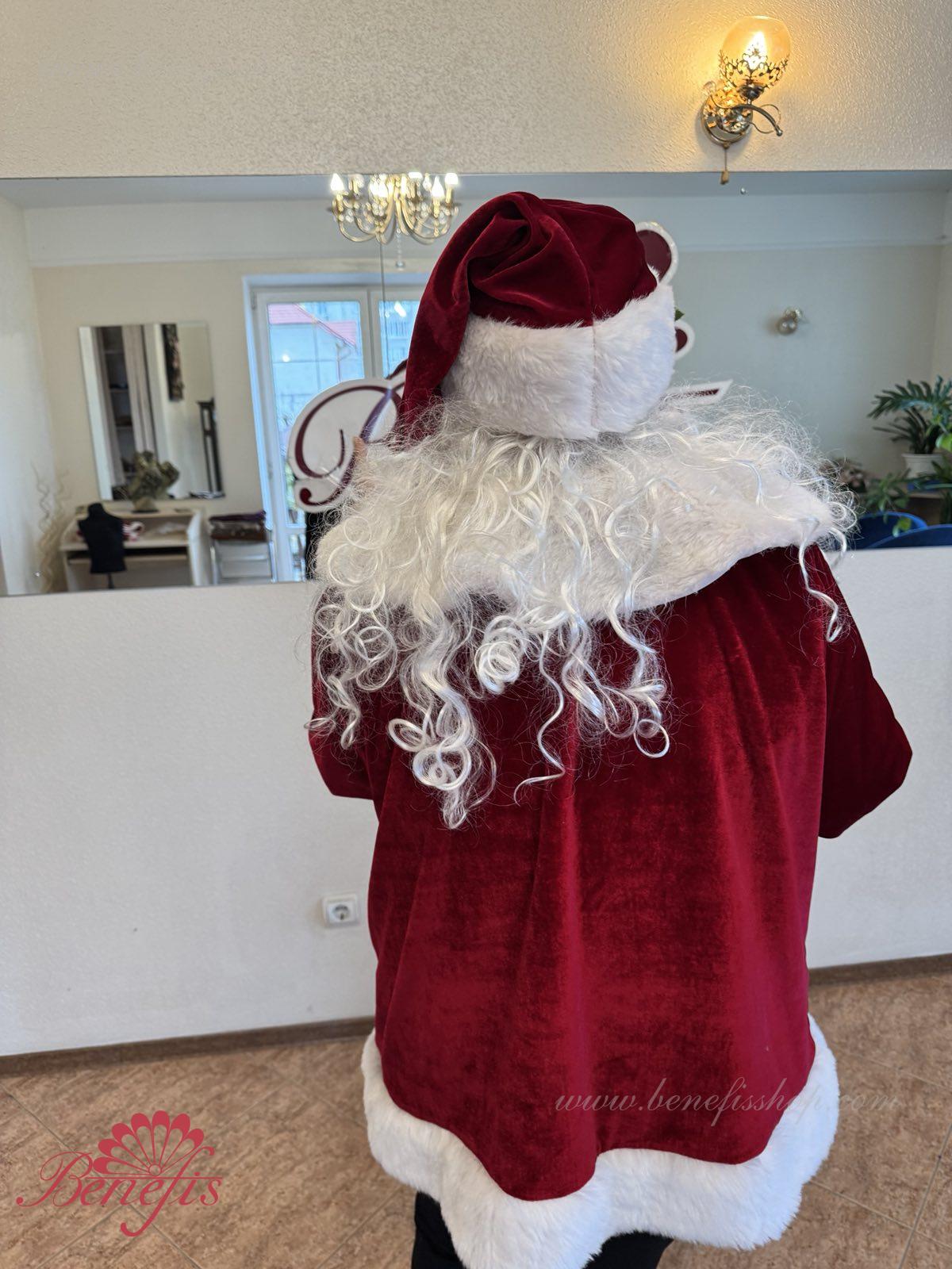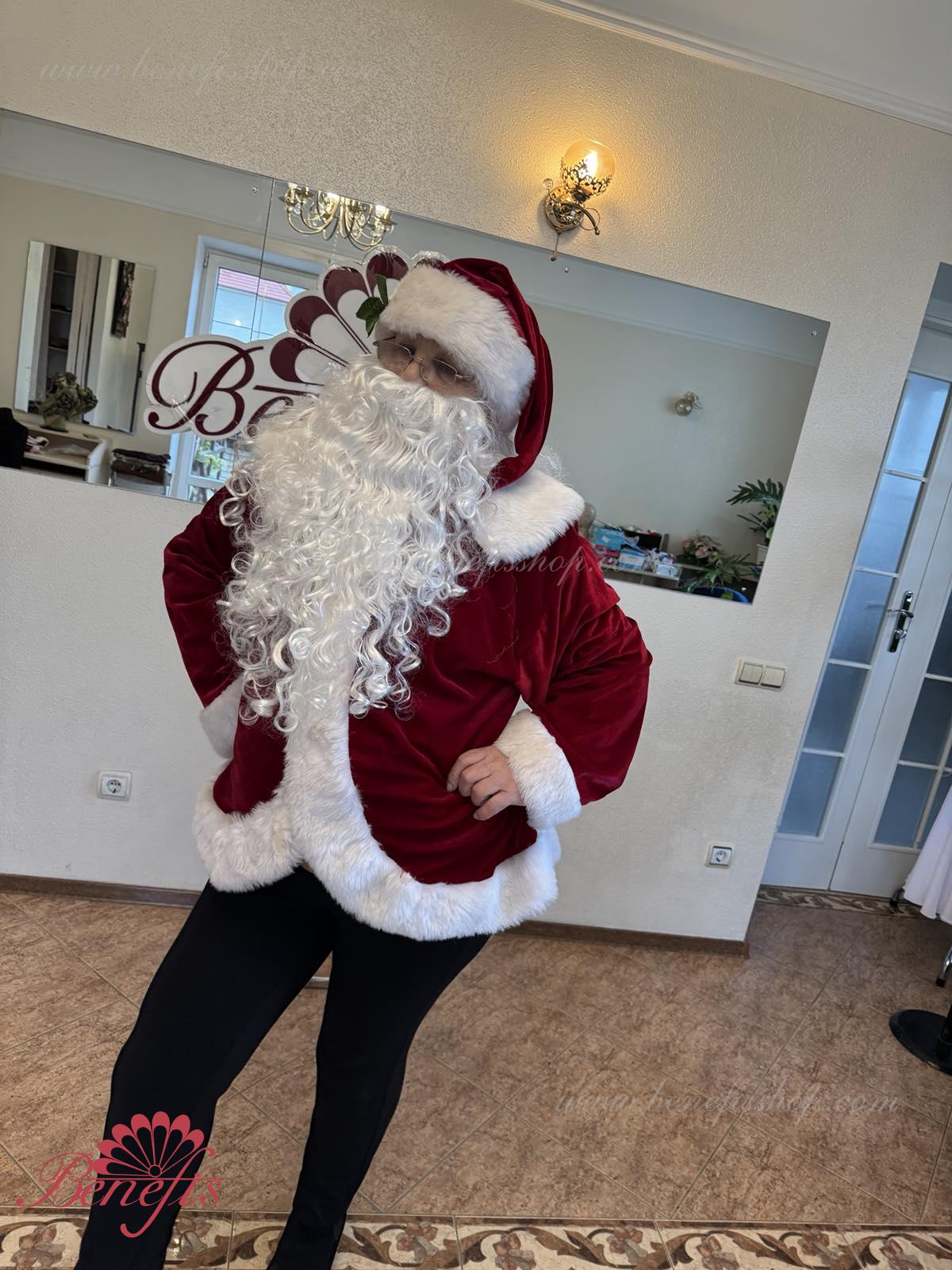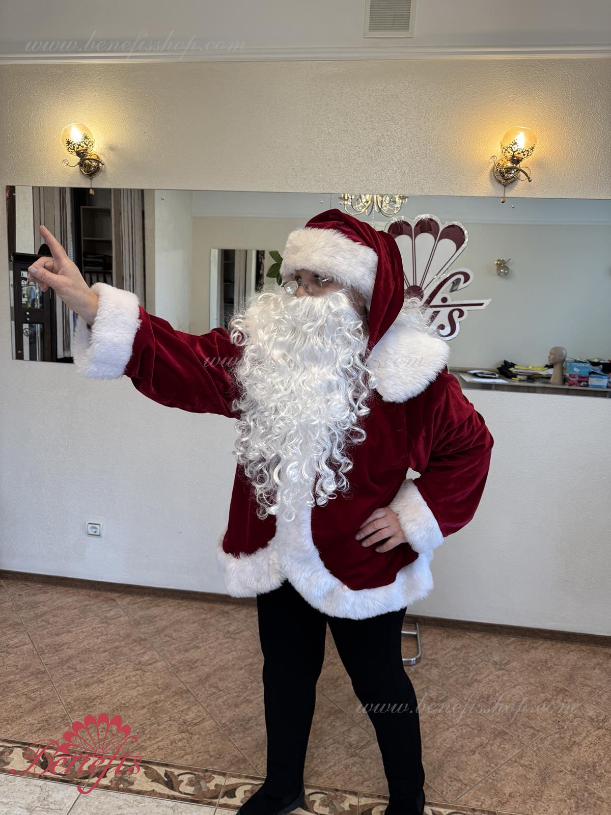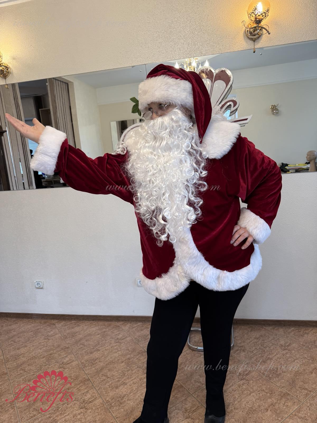 Santa Claus's hat and jacket are made of stretch velvet with fur trim.The costume is ready for immediate shipment