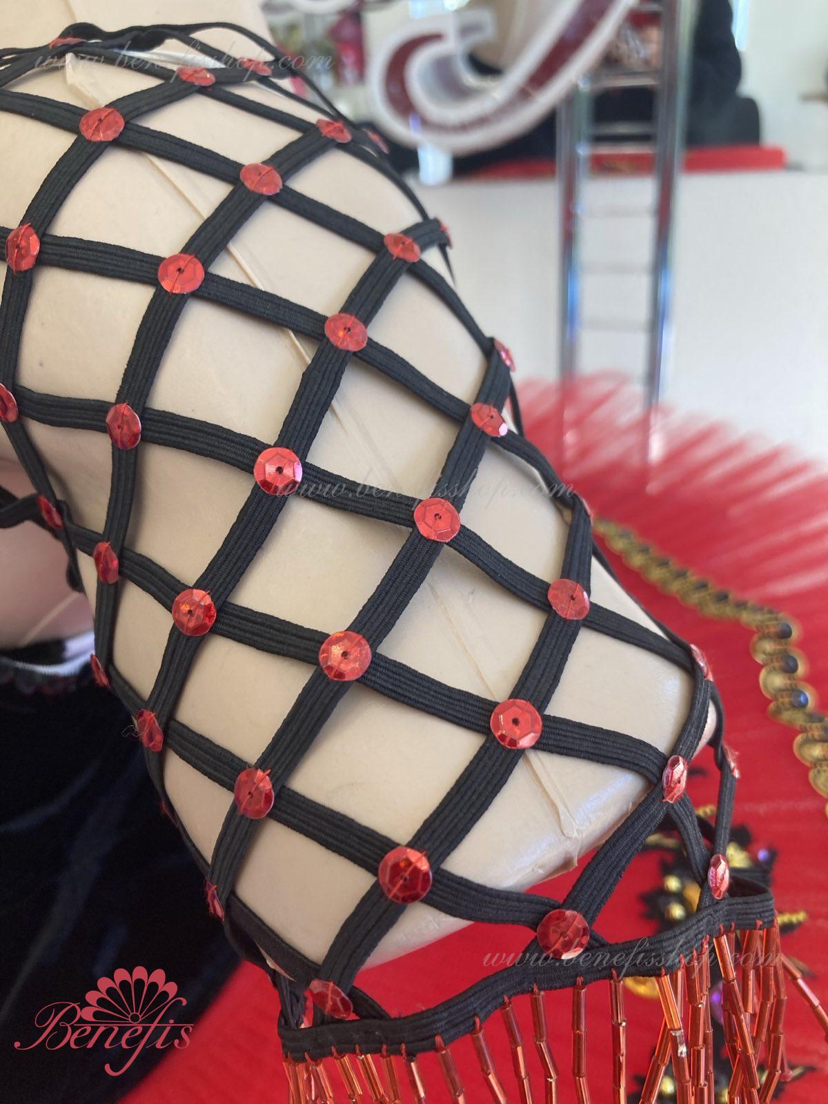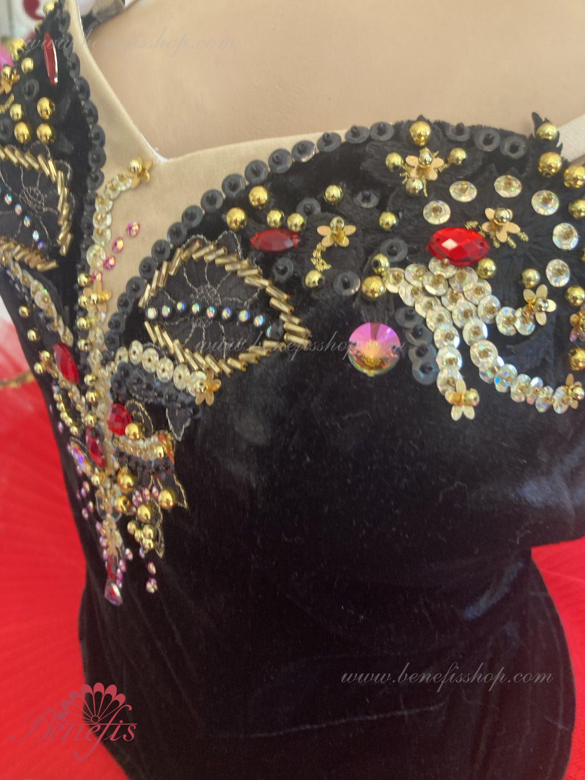 Golden, red and black crystals, shining particles, bugles, golden and black braid are used as décor elements.