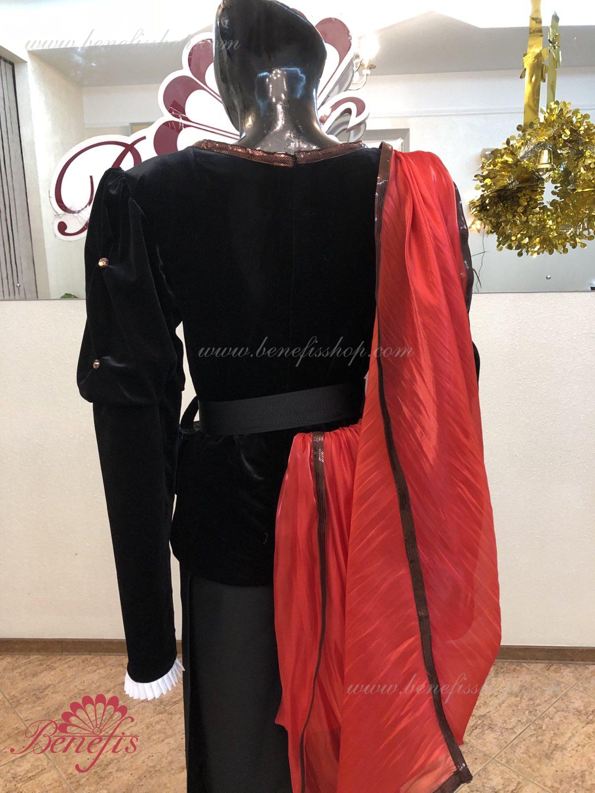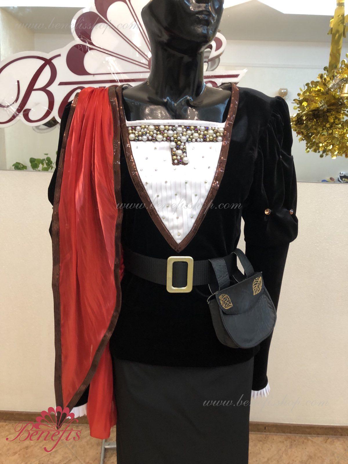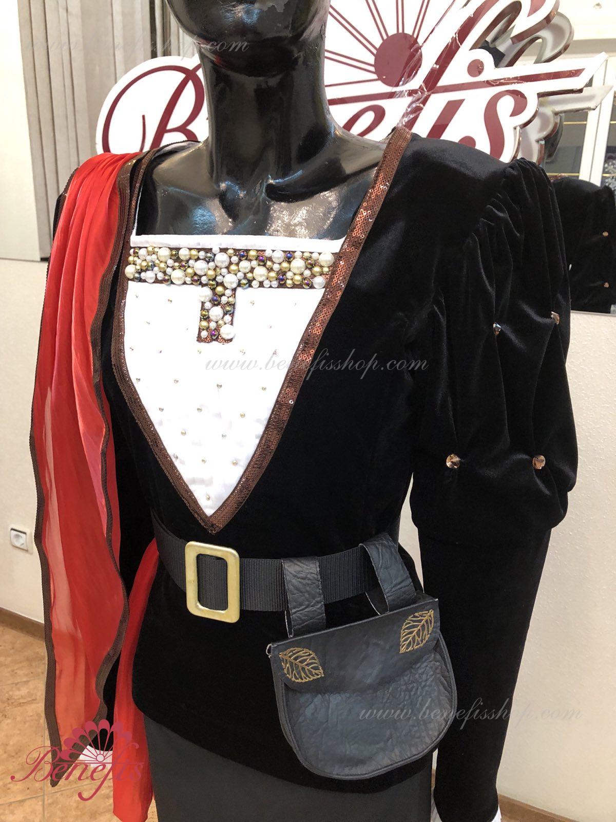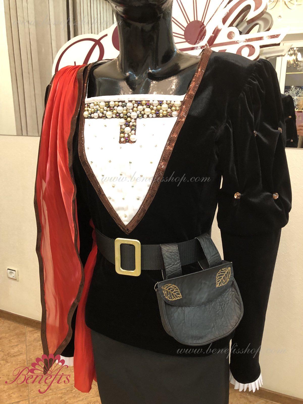 Details: tunic, cape. This is a professional stage costume made of dense semi-elastic fabric. The tunic fastens at the back with hooks and loops. Rhinestones, sequins, a belt, and a handbag are used as decorations, colette is ahead. The costume can be made in any color at the customer's choice. Only professional seamstresses and designers work on the product.