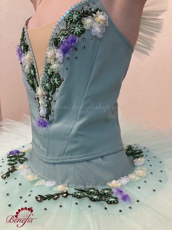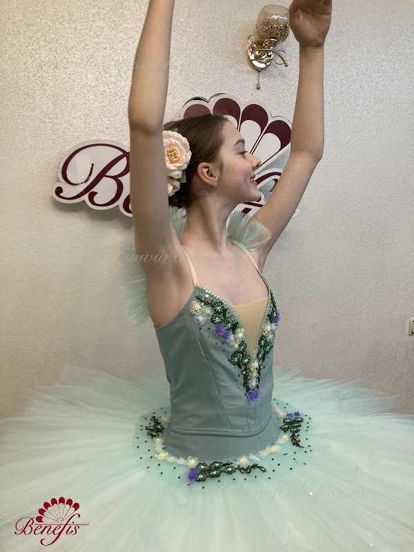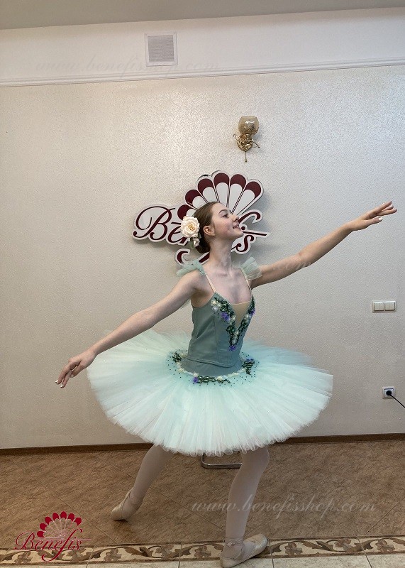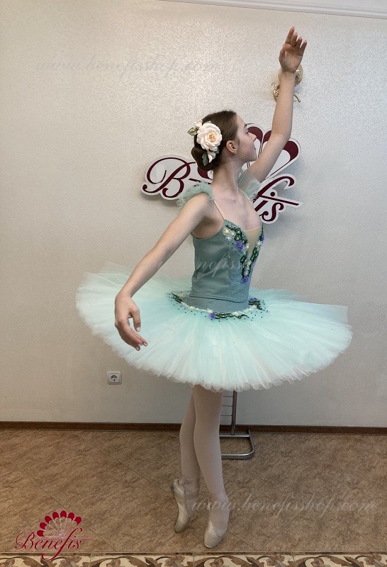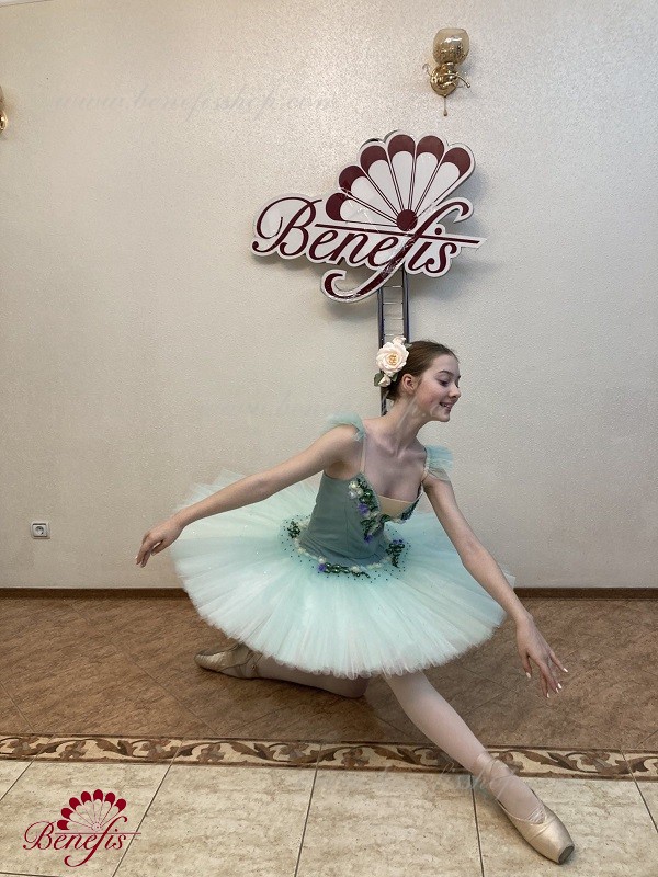 Details:costume. The base is based on the basic model T0001B . Eight pleated graduated layers of semi-soft tulle - seven long and one short on tulle panties with a 10 cm yoke attached to an elastic waistband. Two crinoline hoops are embedded in the middle layer with two additional short frills at the edges. The length of the top layer is 36-38 cm, each next layer is 4 cm shorter. The pack is fastened at the back with 6 large hooks and loops. The bodice, with elastic straps, is made of gabardine. This model is made of two parts, which are attached to each other with elastic bands, in the waist area. The lower part is sewn to a tutu or skirt. The upper part is superimposed on the lower one, which allows you to adjust the length of the bodice depending on the height of the ballerina, and gives the bodice greater mobility.