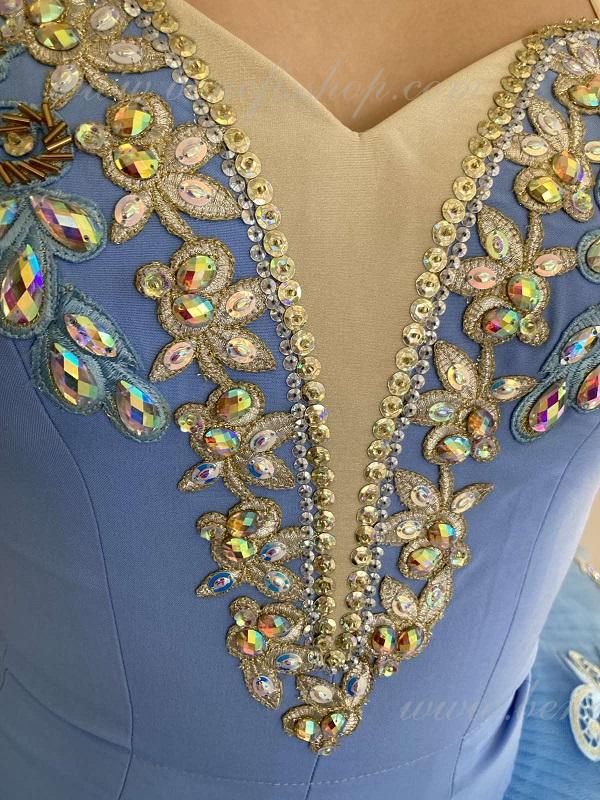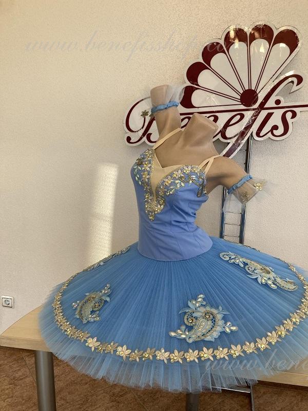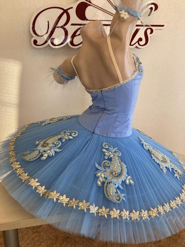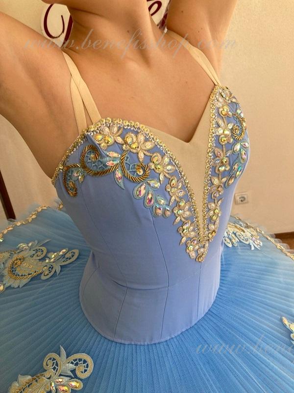 The bodice is fastened with hooks in two rows for convenient adjustment, the inner cord is used to tighten the bodice in the chest area.Eight to ten pleated graduated layers of hard tulle on tulle panties with a 10 cm yoke. Each next layer is 2 cm shorter. The pack is attached to an elastic waistband.