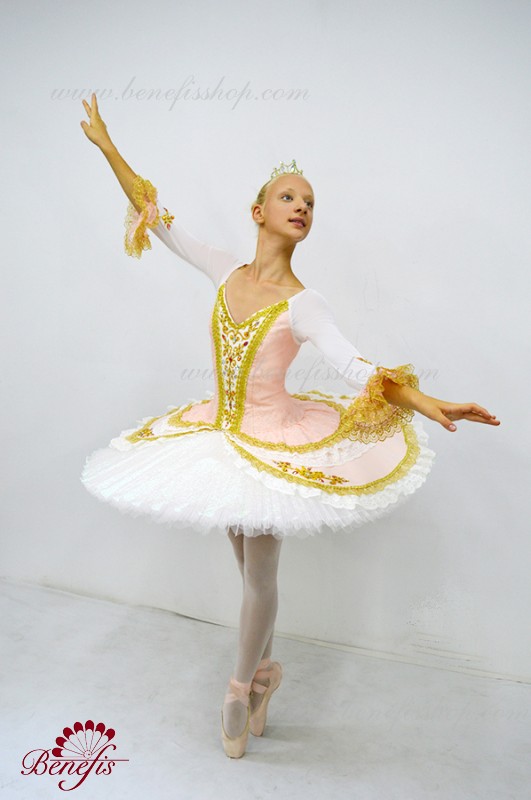 Ballet stage costume made on the basis of T0001B, bodice is made of semi-stretch fabric with a v-shape insert in the front. The bodice fastens on two rows of hooks, the sleeves are made of mesh with lace around the edges.