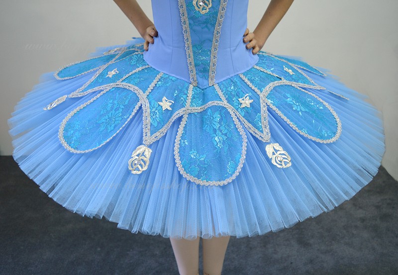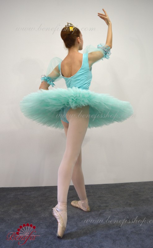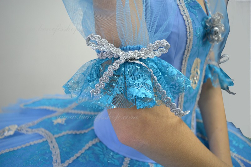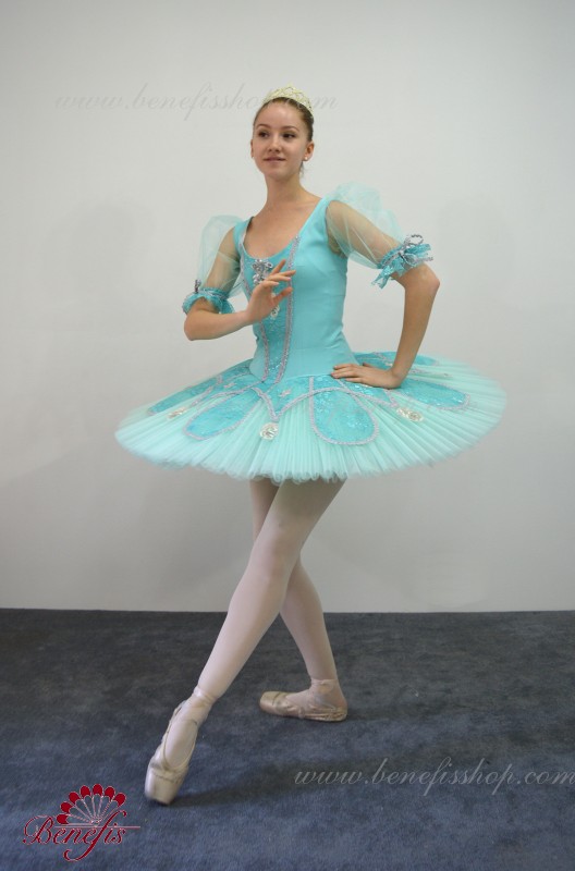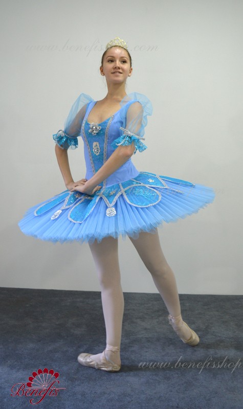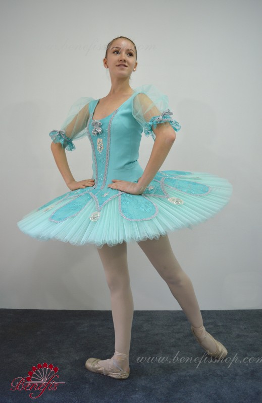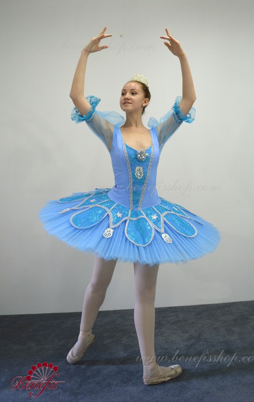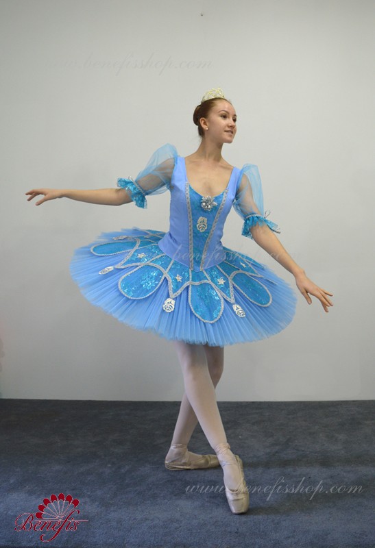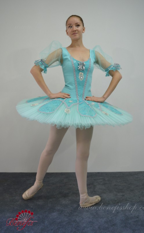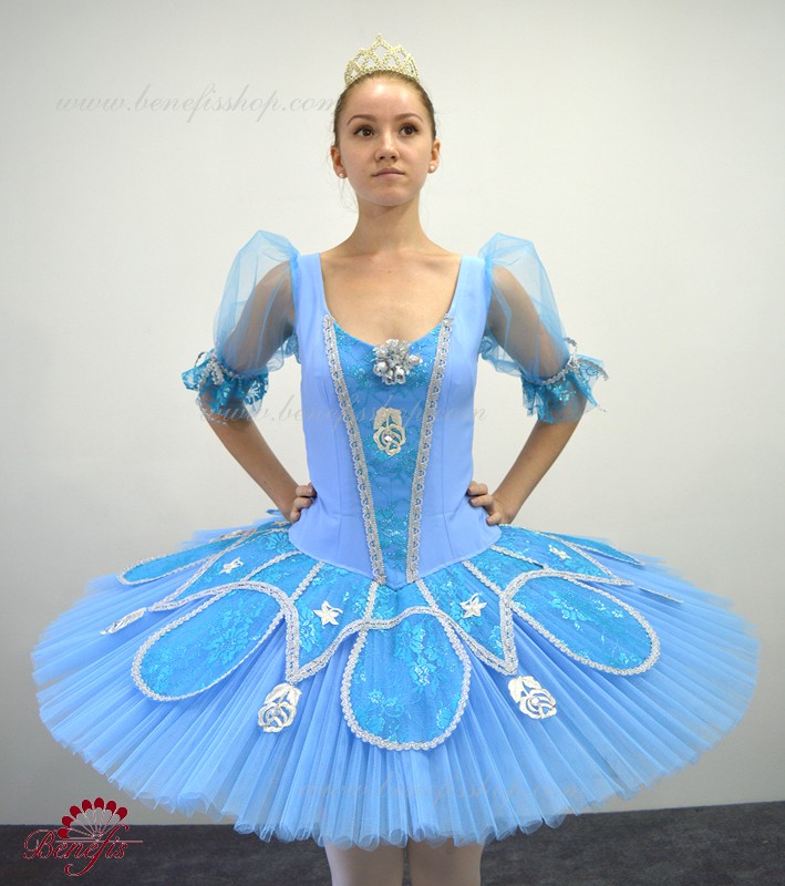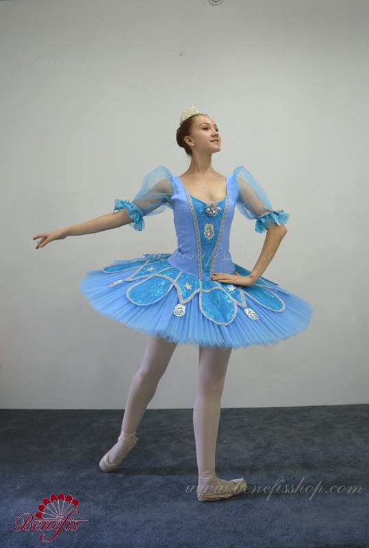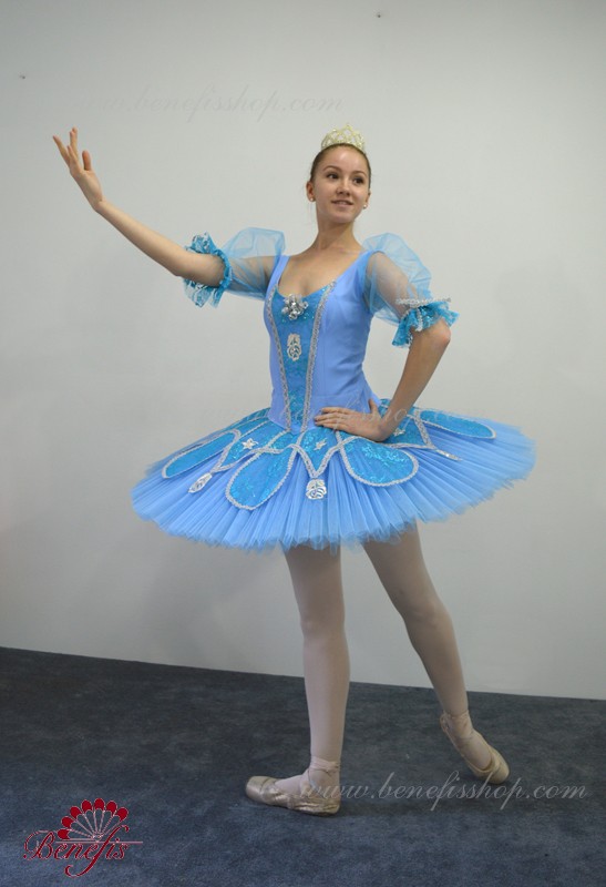 This is a professional stage costume. The bodice is made of semi-stretched dense fabric, with two rows of hooks. The bodice has shoulder seams and puffed sleeves. The costume is decorated with applications, braids, crystals, flowers.