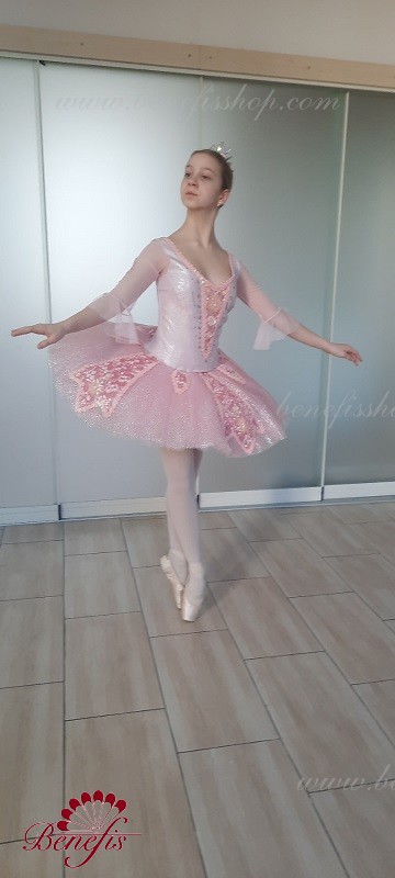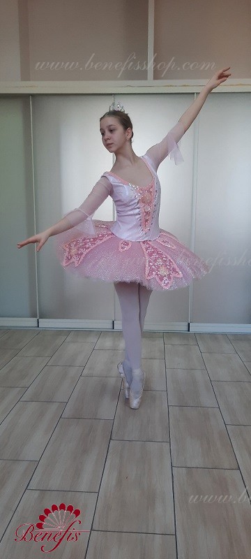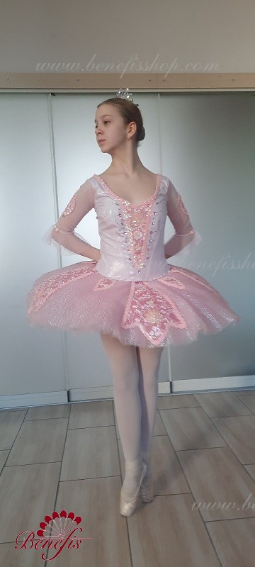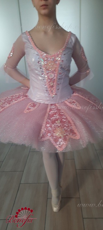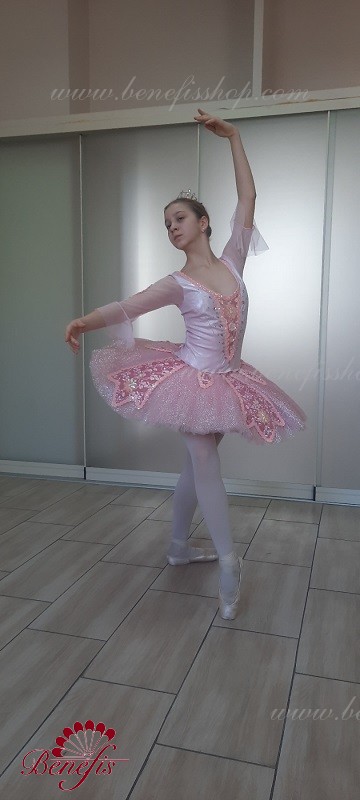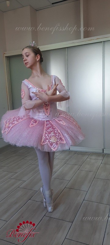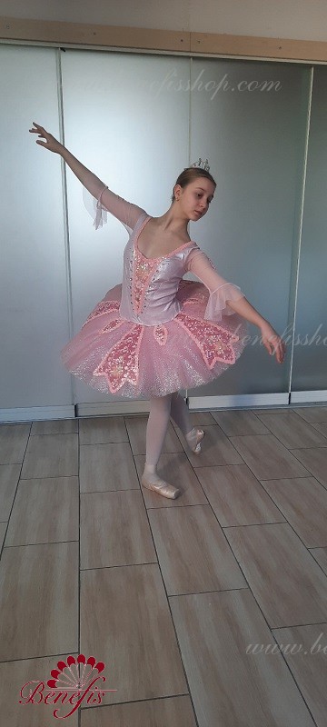 The base is based on the basic model T0001B . Eight pleated graduated layers of semi-soft tulle - seven long and one short on tulle panties with a 10 cm yoke attached to an elastic waistband. Two crinoline hoops are embedded in the middle layer with two additional short frills at the edges. The length of the top layer is 36-38 cm, each next layer is 4 cm shorter. The pack is fastened at the back with 6 large hooks and loops. Beads, rhinestones, sequins, and braid are used as decor.
