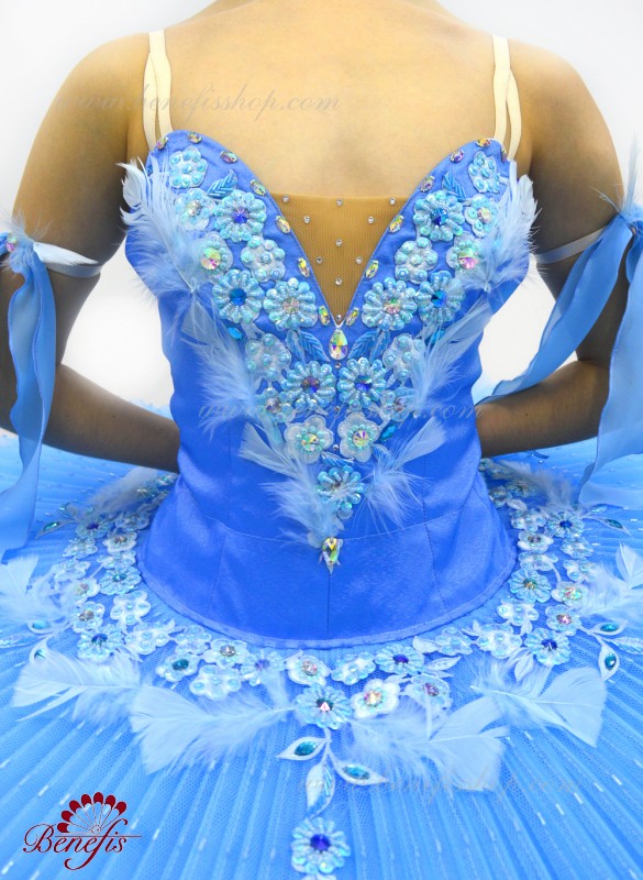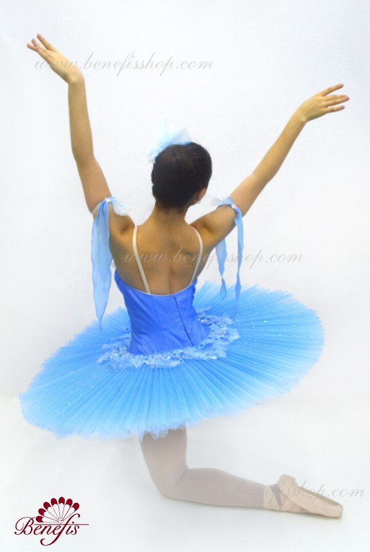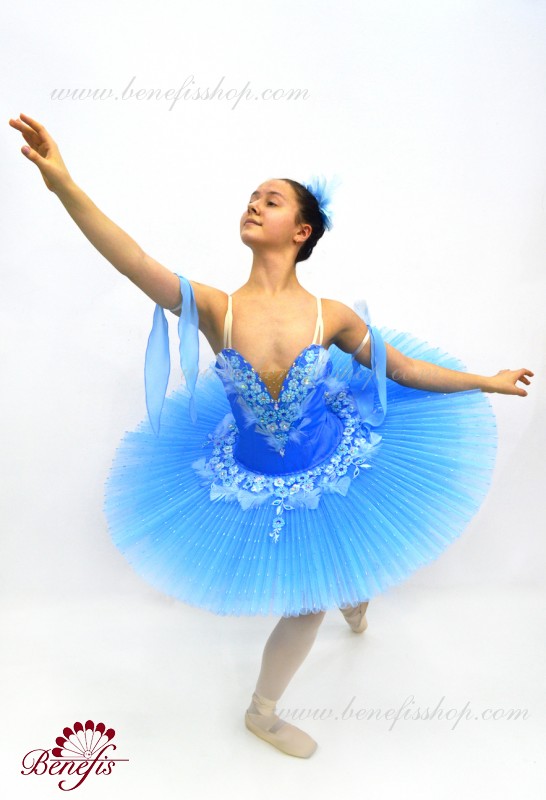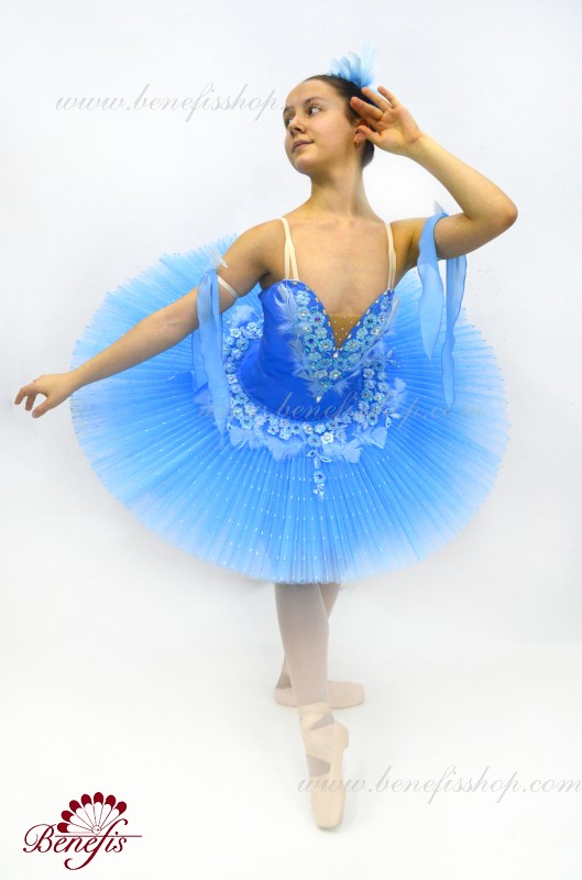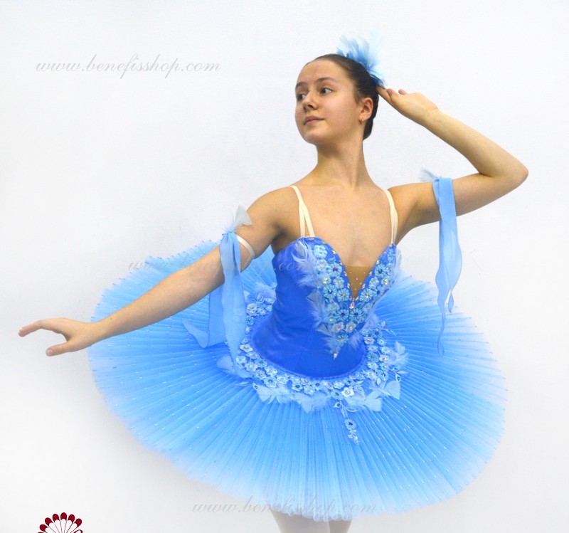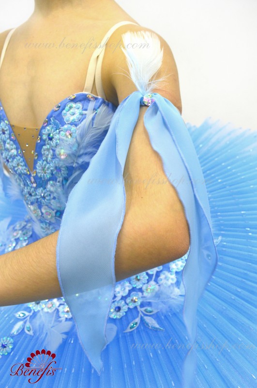 Details:costume, sleeves. This professional ballet stage costume is made on the basis of a professional basic tutu # T0001B (see the section<< Basic and rehearsal ballet tutus>>). The bodice, with elastic straps and a body insert on the chest, is made of dense semi-elastic fabric with a fitted mesh toe.