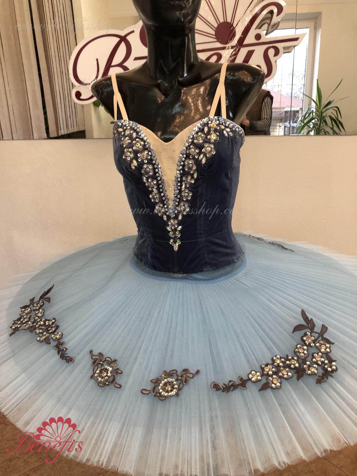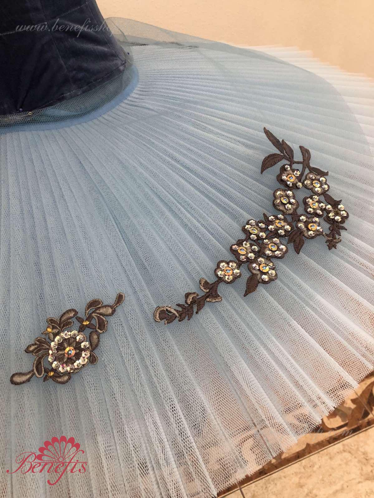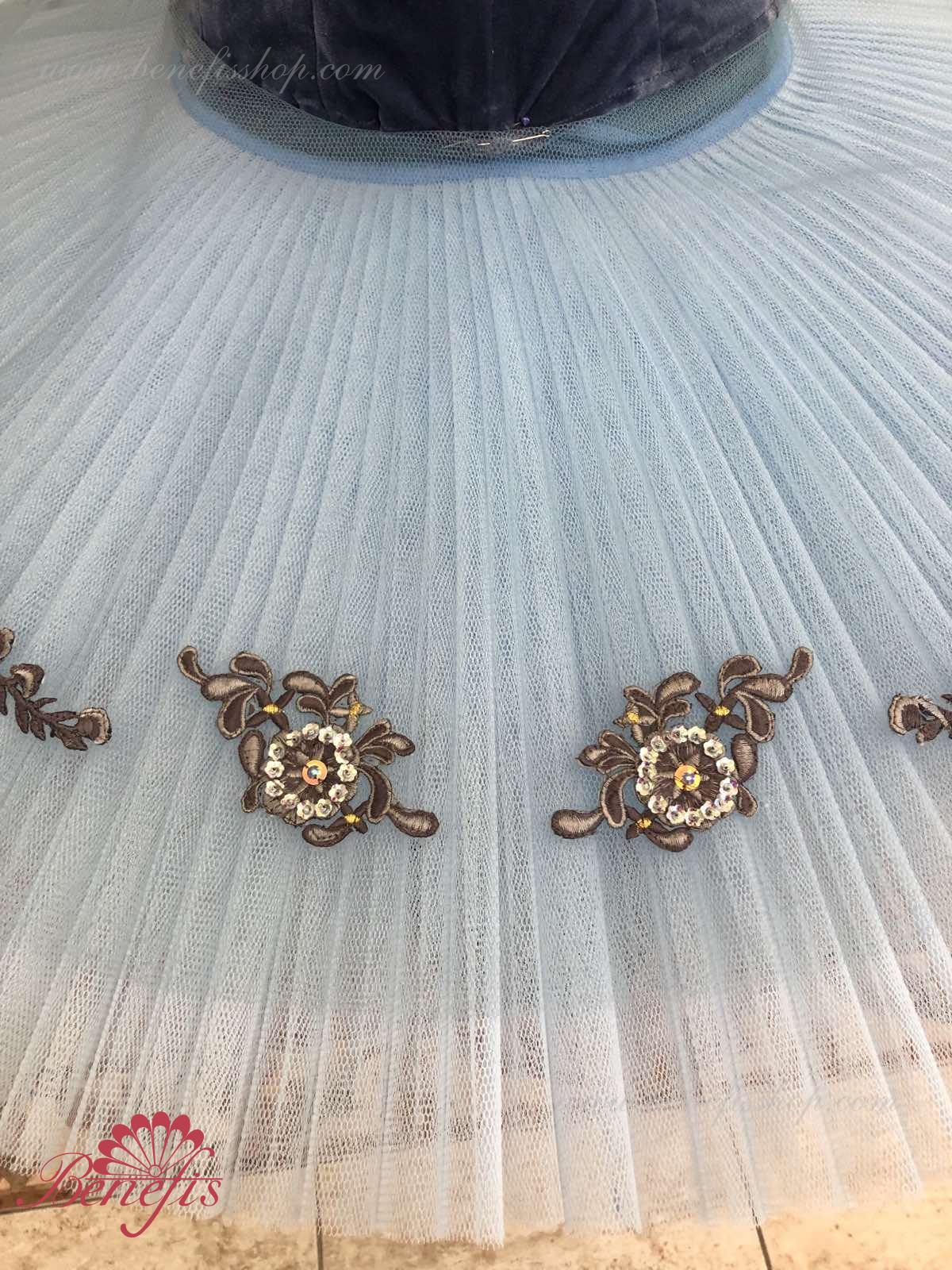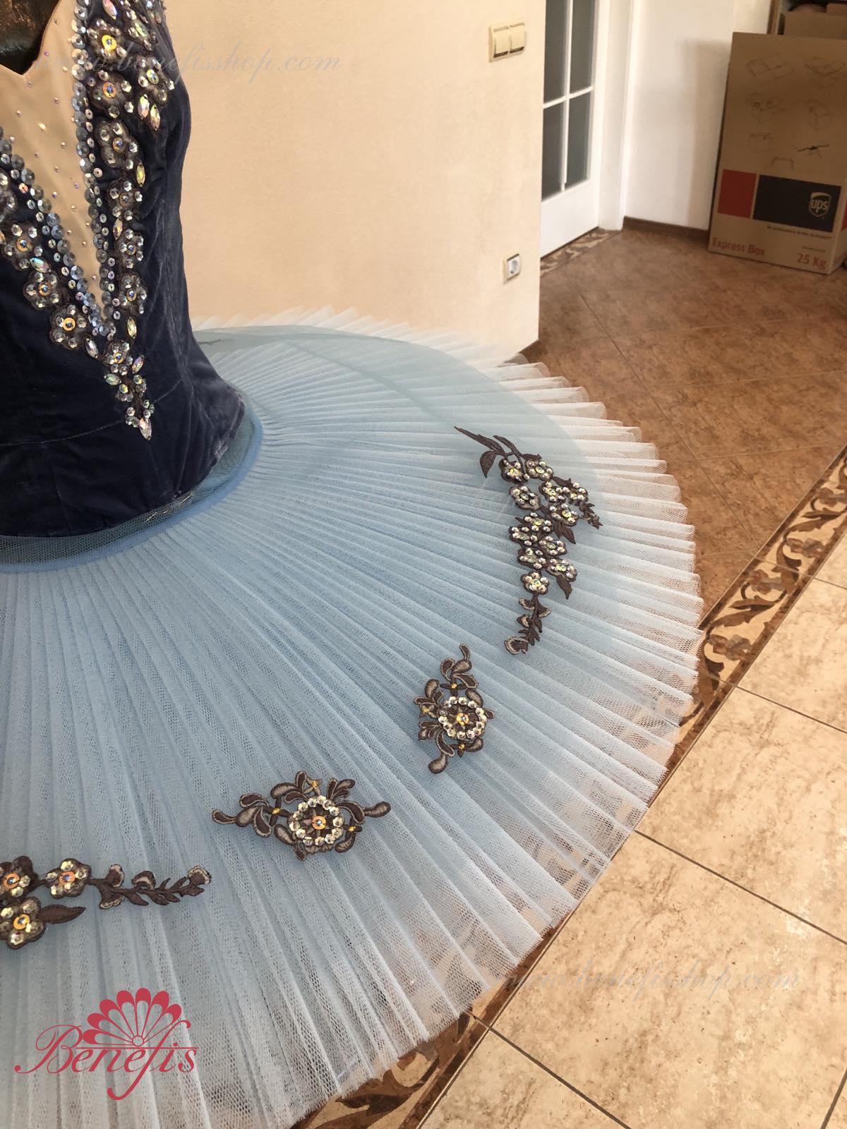 Tutu- Eight pleated graduated layers of semi-soft tulle- seven long and one short with tulle panties with a 10 cm bascque attached to an elastic waistband. Two crinoline hoops are sewed in the middle layer with two additional short frills at the edges. The length of the top layer of the tutu is 36-38 cm, each next layer is shorter with 4 cm than previous . The tutu is fastened at the back with 6 large hooks and loops.