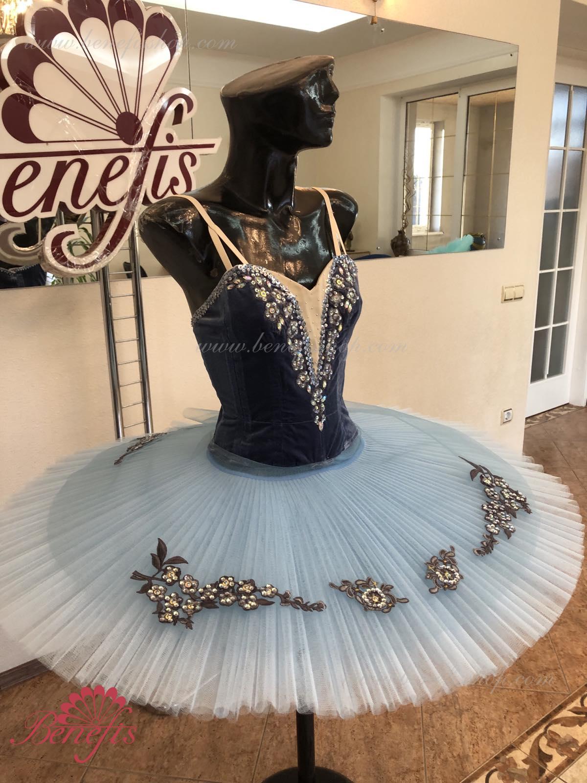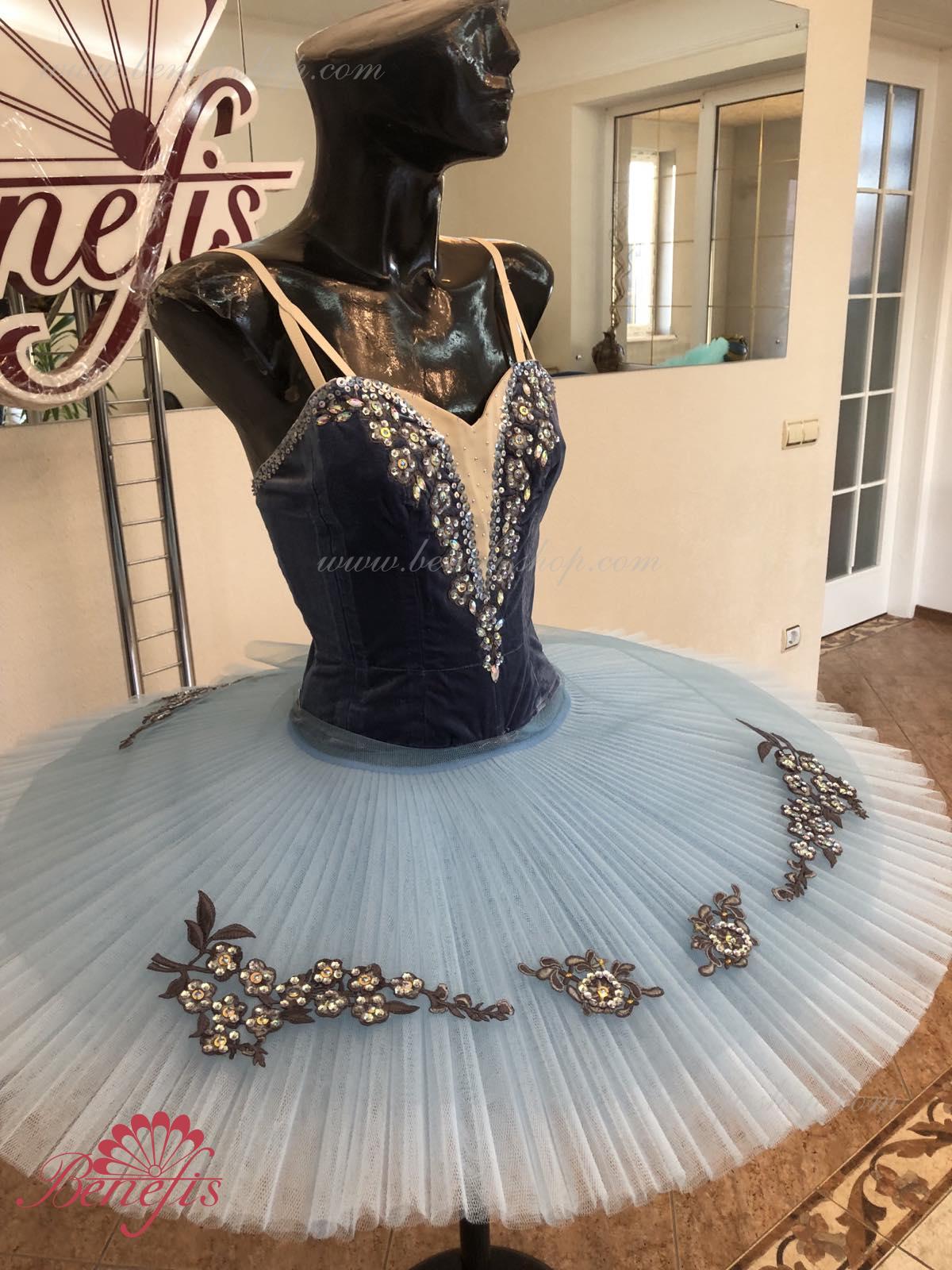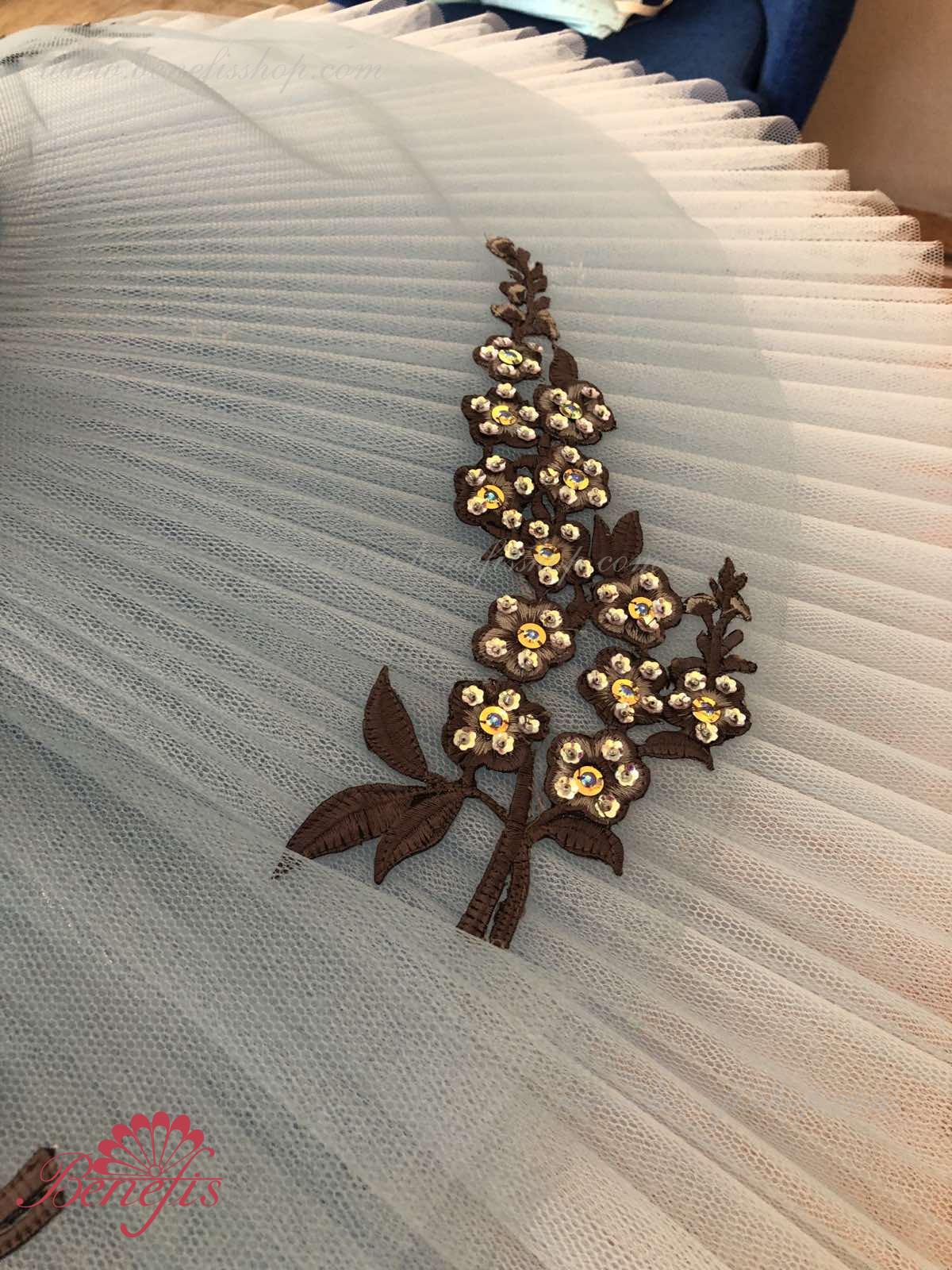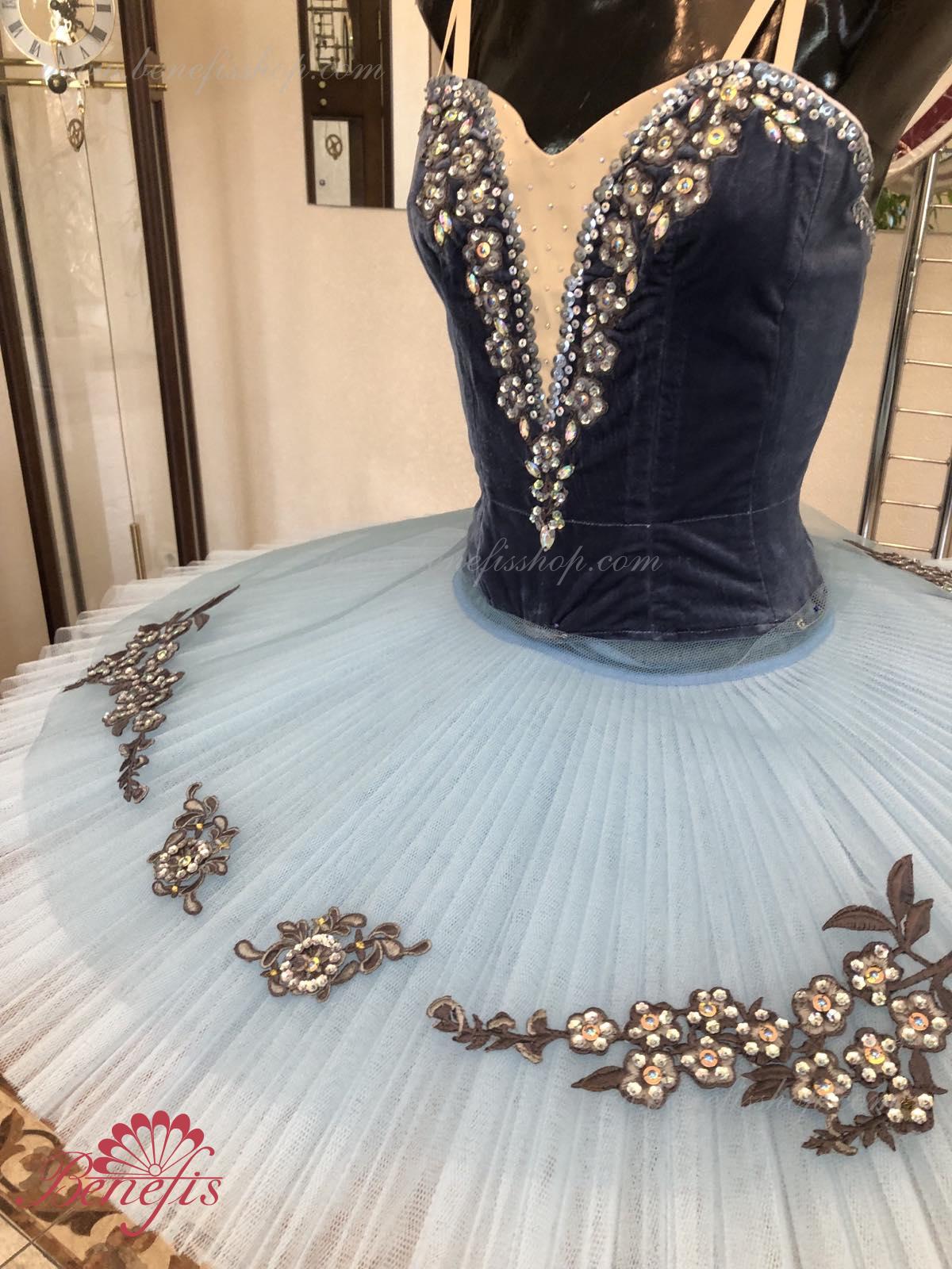 Tutu- Eight pleated graduated layers of semi-soft tulle- seven long and one short with tulle panties with a 10 cm bascque attached to an elastic waistband. Two crinoline hoops are sewed in the middle layer with two additional short frills at the edges. The length of the top layer of the tutu is 36-38 cm, each next layer is shorter with 4 cm than previous . The tutu is fastened at the back with 6 large hooks and loops.