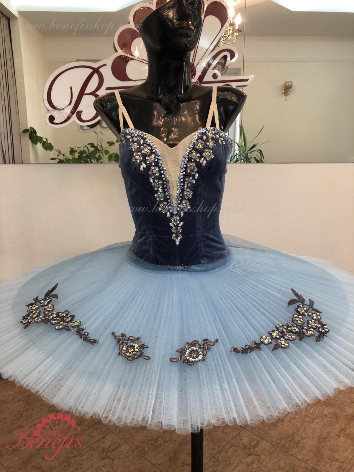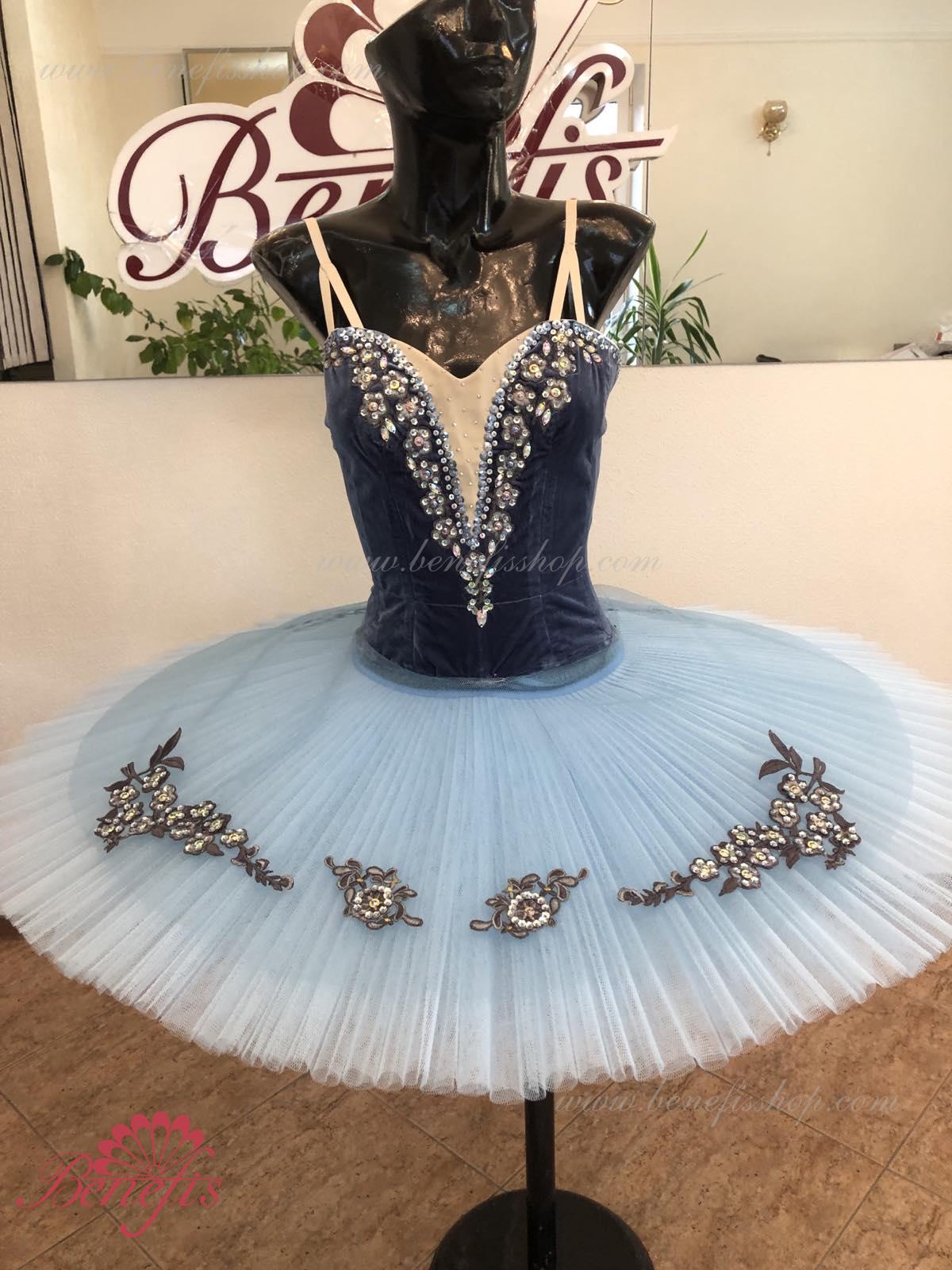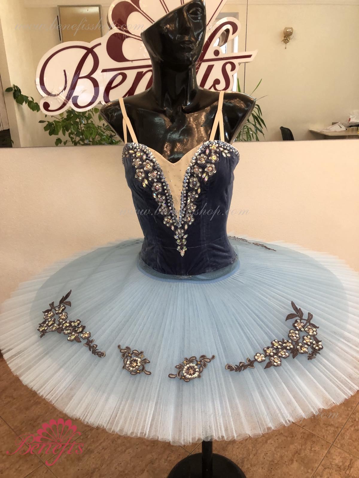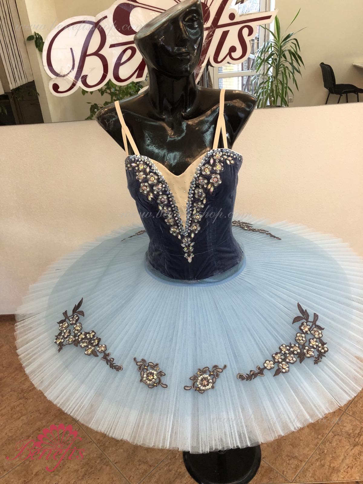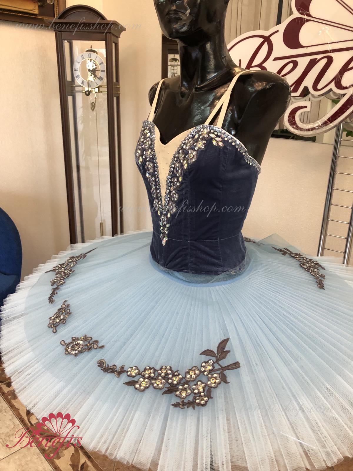 Tutu- Eight pleated graduated layers of semi-soft tulle- seven long and one short with tulle panties with a 10 cm bascque attached to an elastic waistband. Two crinoline hoops are sewed in the middle layer with two additional short frills at the edges. The length of the top layer of the tutu is 36-38 cm, each next layer is shorter with 4 cm than previous . The tutu is fastened at the back with 6 large hooks and loops.