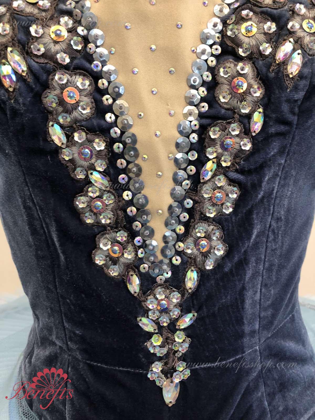 The bodice is made of velvet with elastic straps and a body insert on the chest. The bodice is fastened with hooks in two rows for easy adjustment, the inner cord is used to tighten the bodice in the chest area.