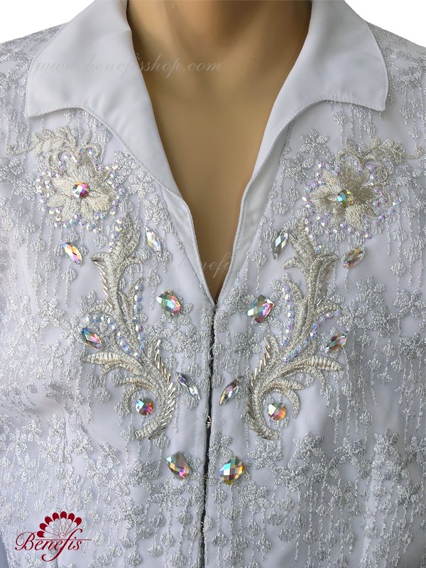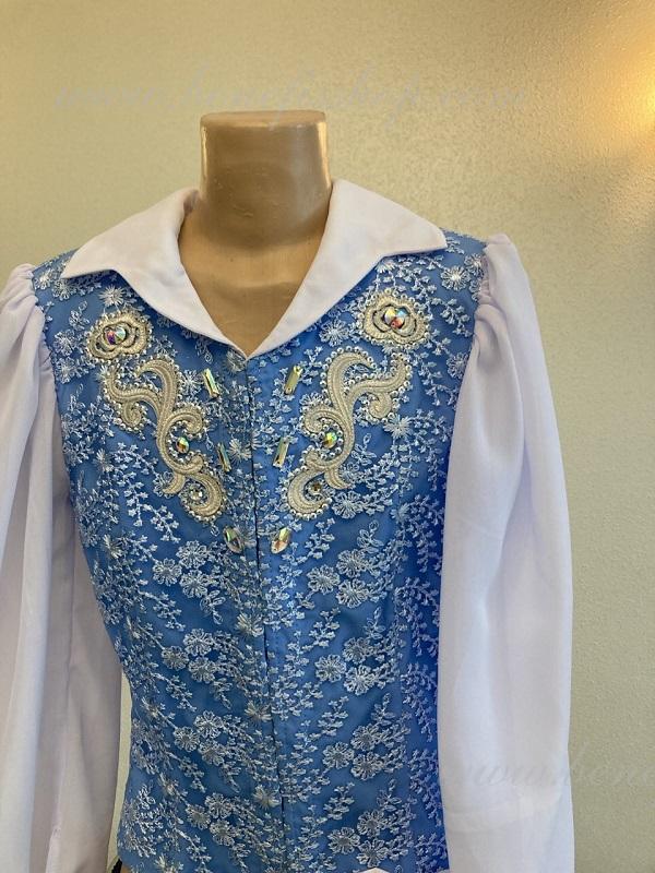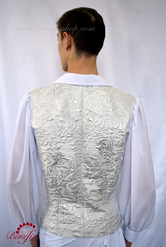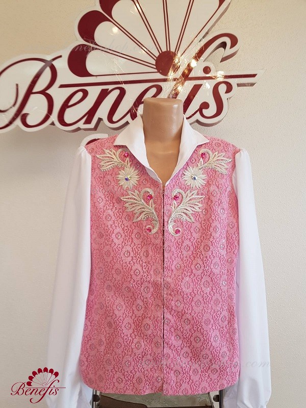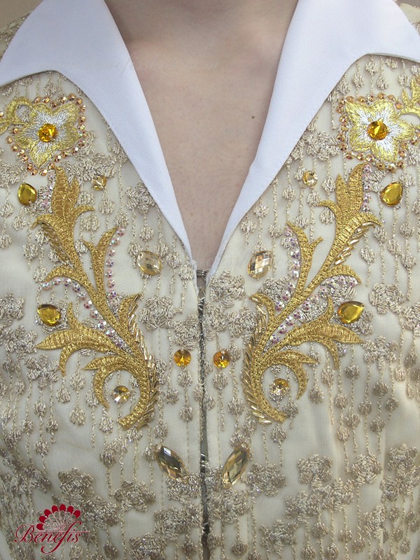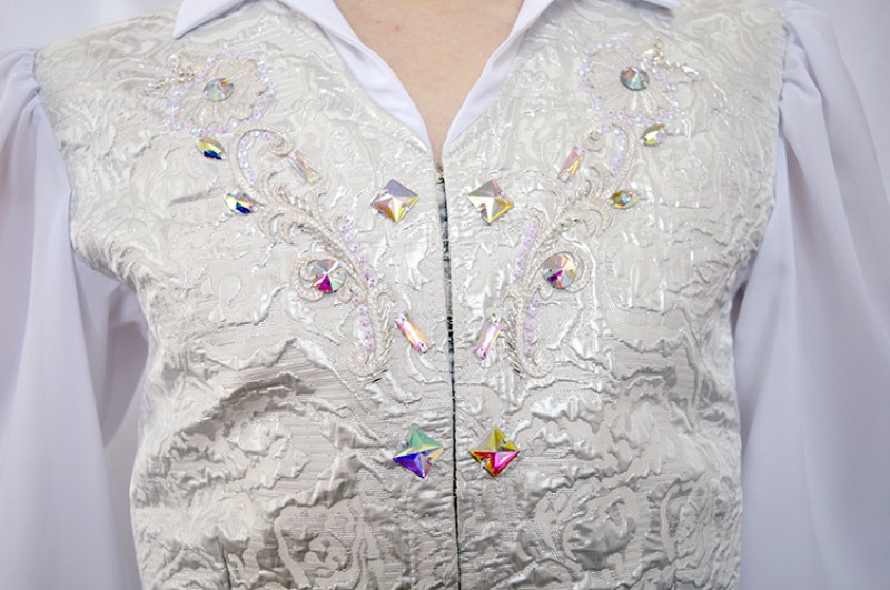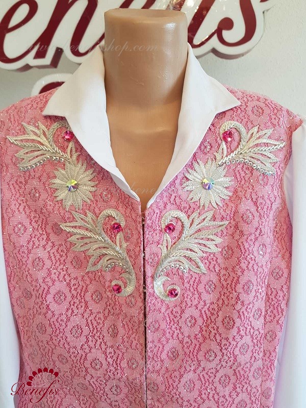 Details:it stings. This is a professional stage jacket, made of satin, covered with guipure.The collar and sleeves are made of viscose. The jacket is fastened in front with hooks and loops.