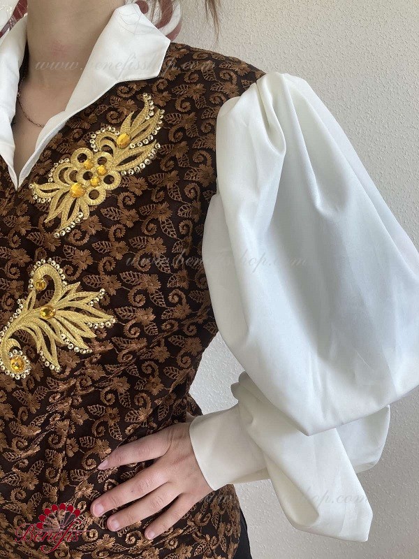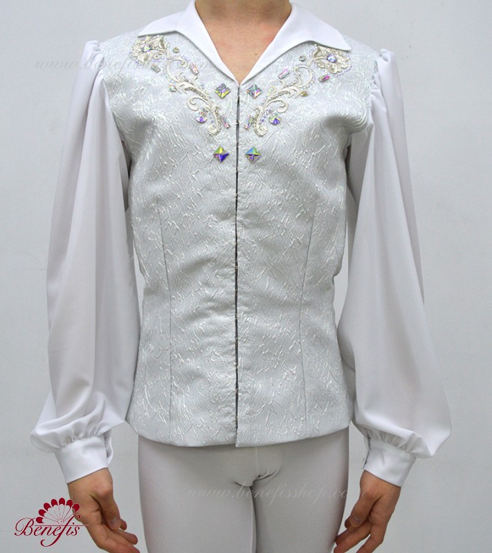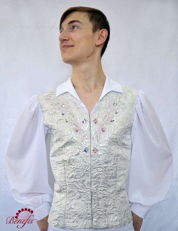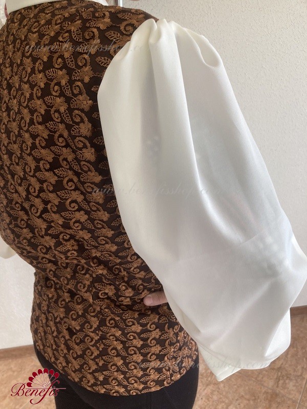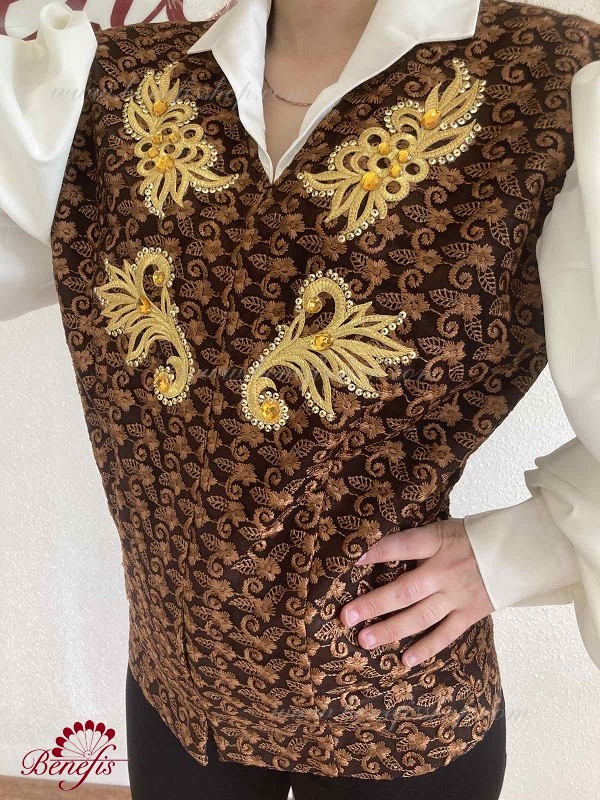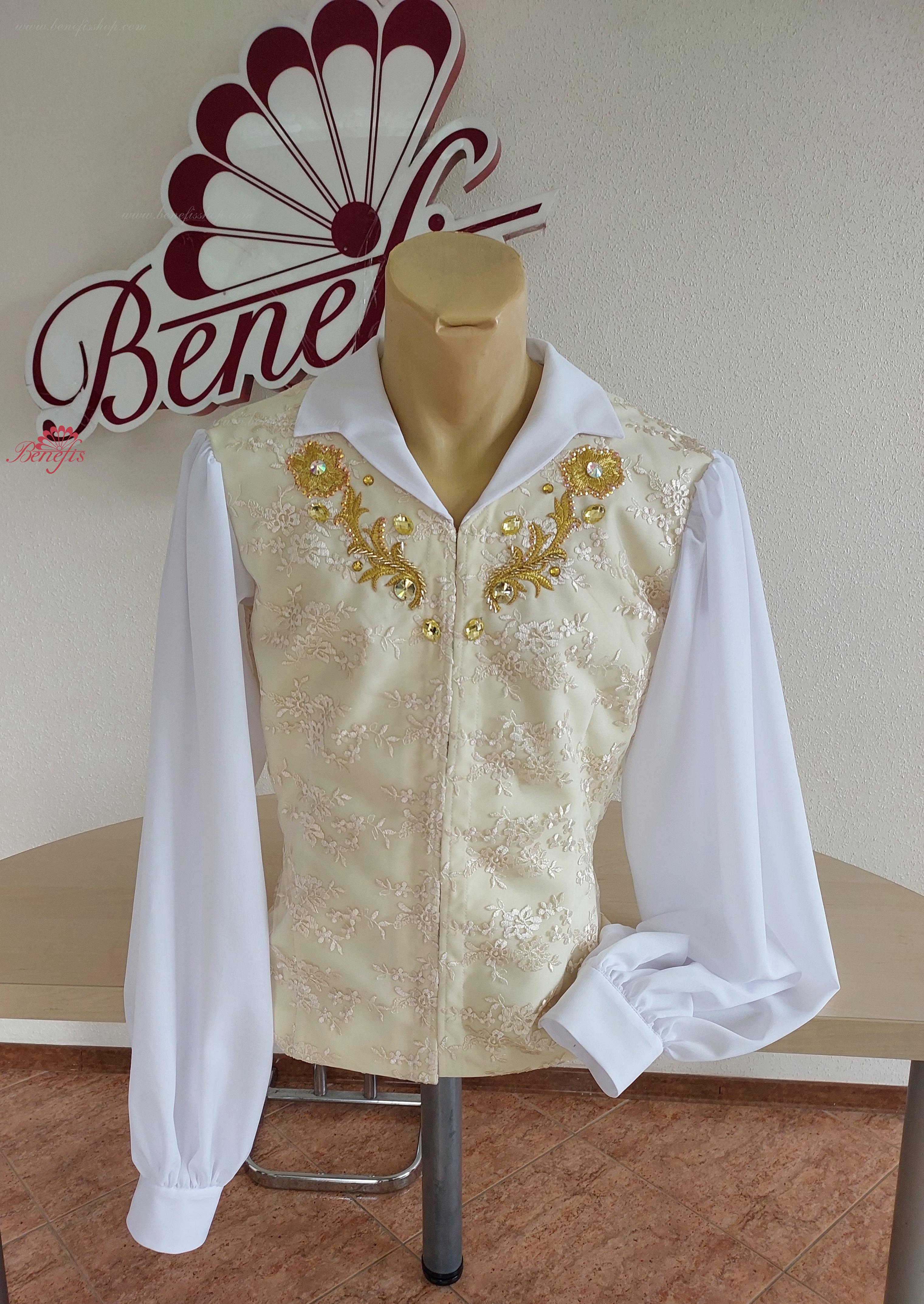 Details:it stings. This is a professional stage jacket, made of satin, covered with guipure.The collar and sleeves are made of viscose. The jacket is fastened in front with hooks and loops.