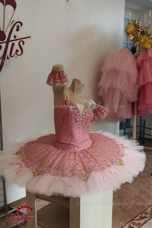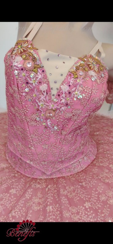 This professional ballet stage costume is made on the basis of a professional tutu T0001R. The bodice, with elastic straps, is made of dense semi-elastic fabric. This model is made of two parts, which are attached to each other with elastic bands, in the waist area. The lower part is sewn to a tutu or skirt. The upper part is superimposed on the lower one, which allows you to adjust the length of the bodice depending on the height of the ballerina, and gives the bodice greater mobility.