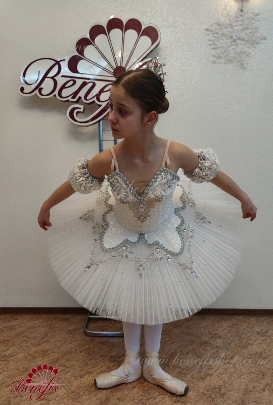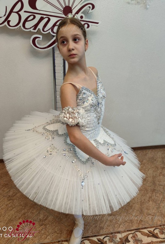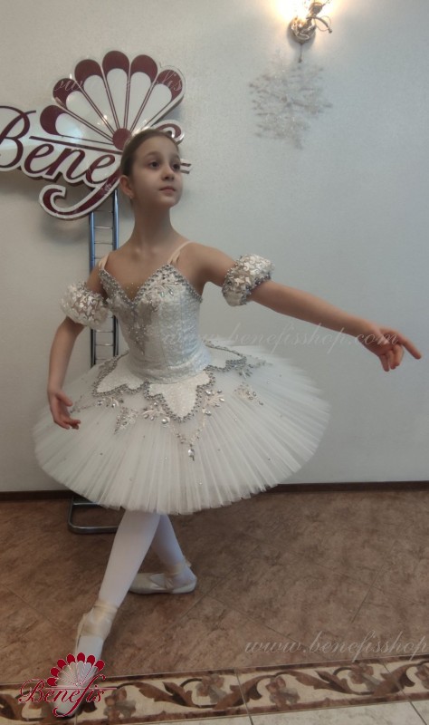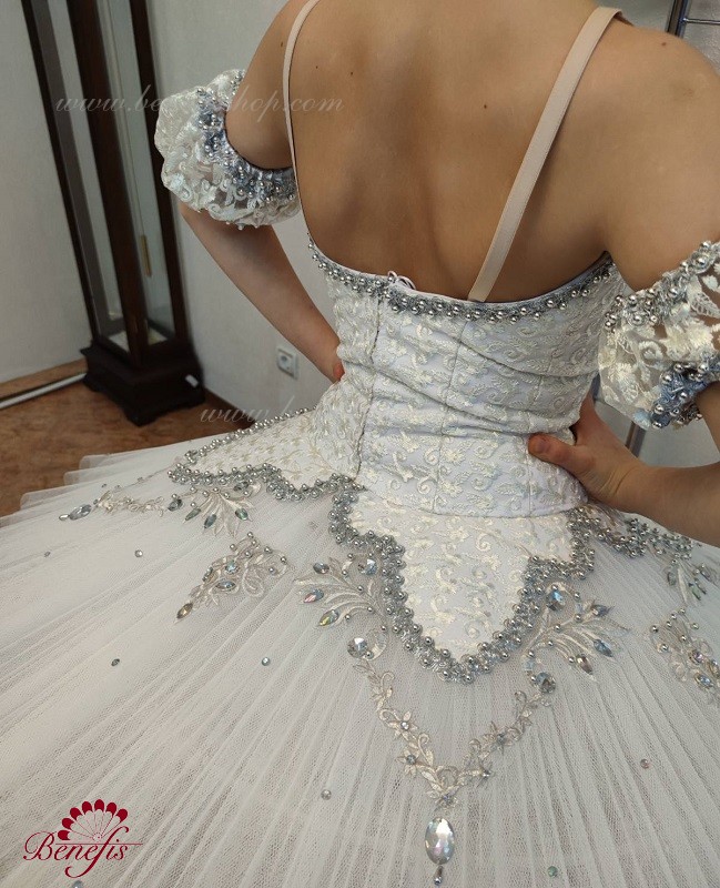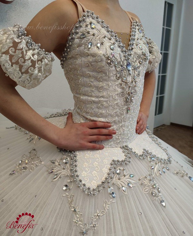 The bodice is fastened with hooks in two rows for convenient adjustment, the inner cord serves to tighten the bodice in the chest area. Eight pleated graduated layers of semi-soft tulle - seven long and one short on tulle panties with a 10 cm yoke attached to an elastic waistband. Two crinoline hoops are embedded in the middle layer with two additional short frills at the edges. The length of the top layer is 36-38 cm, each next layer is 4 cm shorter. The pack is fastened at the back with 6 large hooks and loops. The sleeves are made in the form of puffs of guipure .