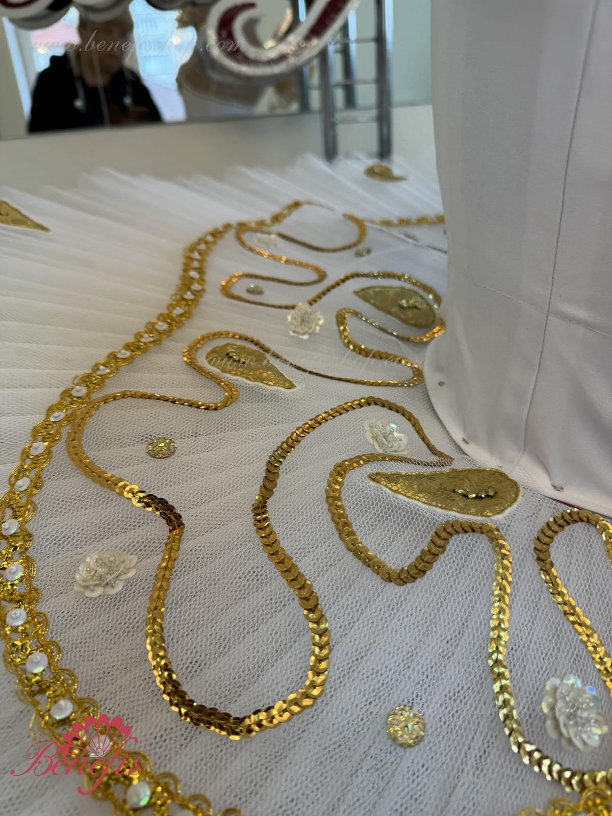 Gentle arm ruffles are trimmed with golden or silver braid and are also embellished with simple patterns made of sparkling braid.