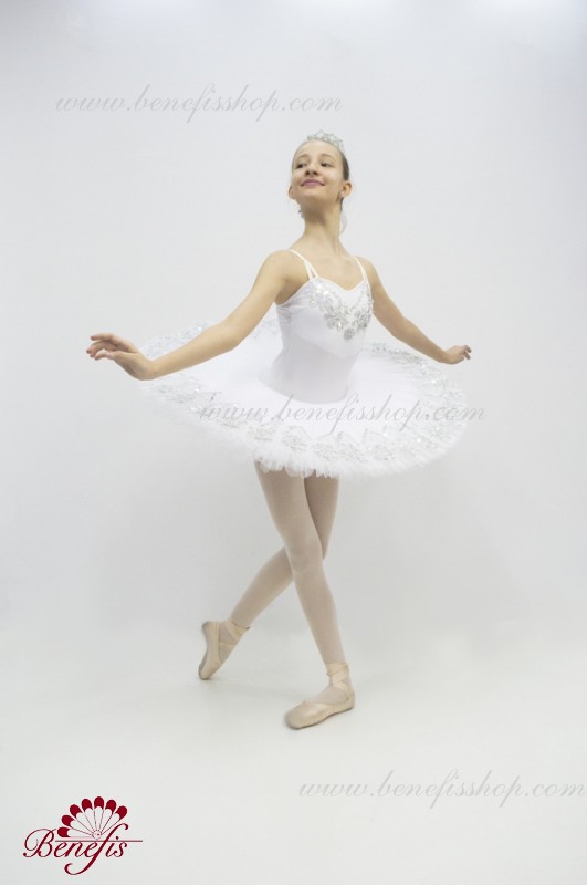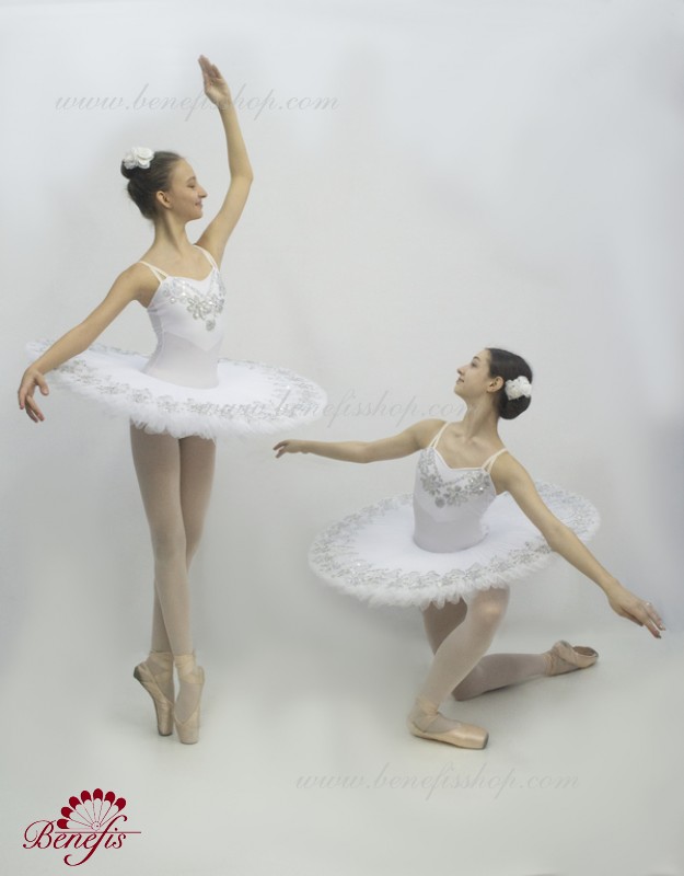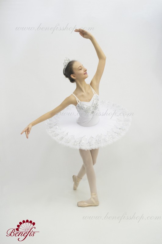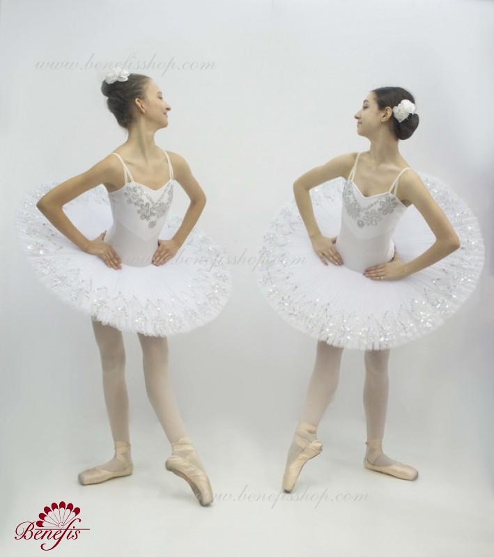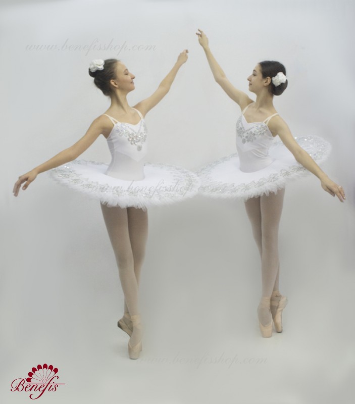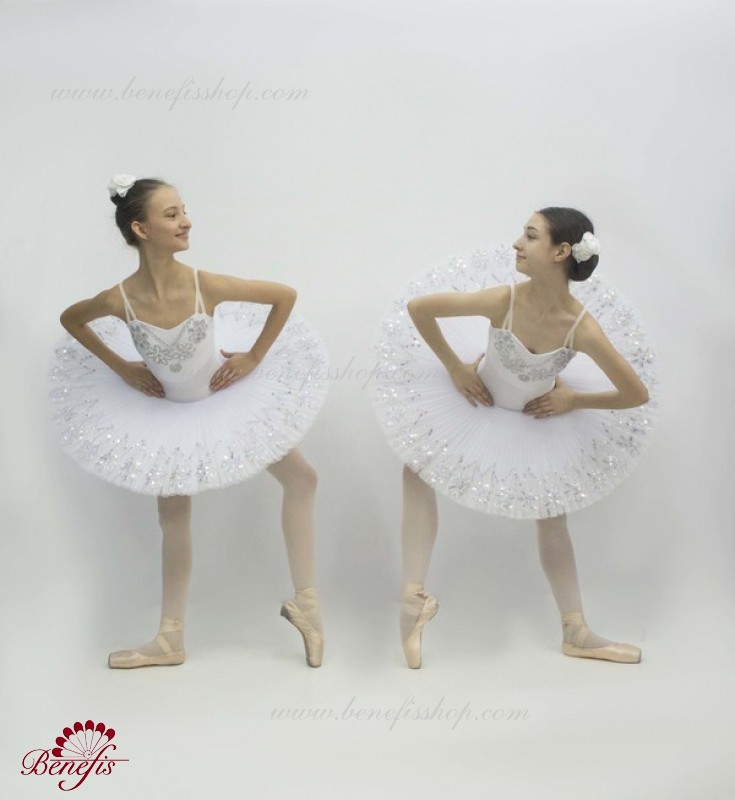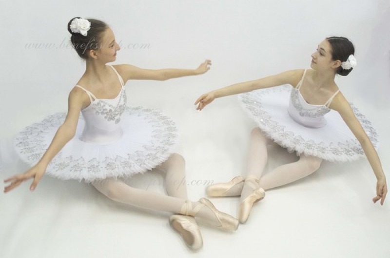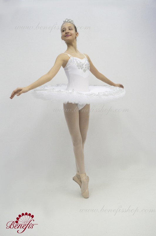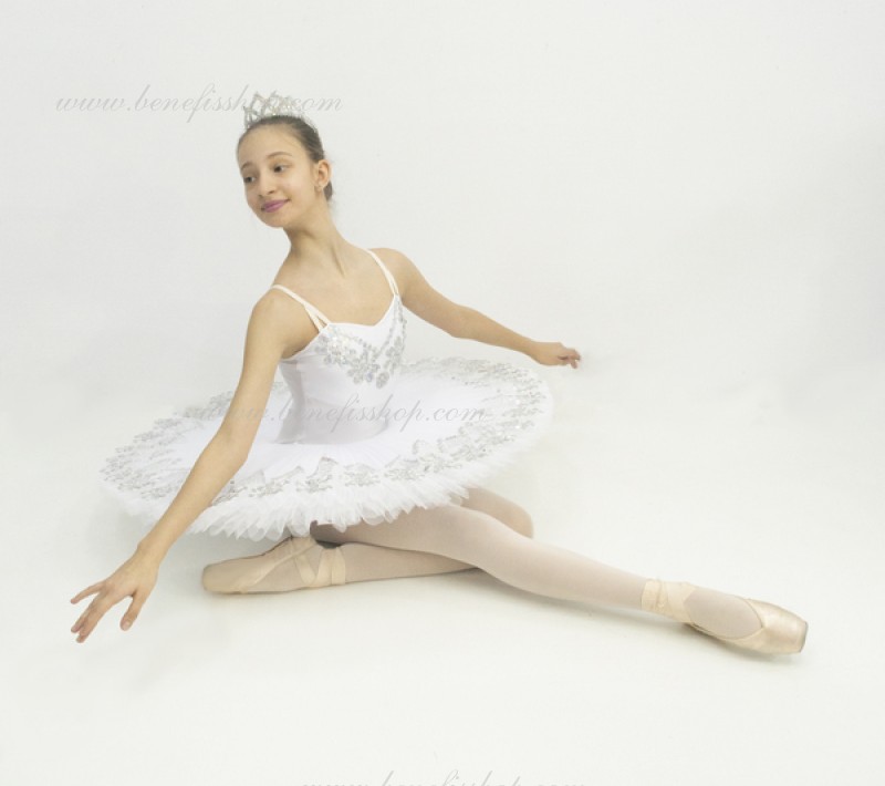 Stage costume is based on professional basic tutu T 0005. Asymmetrical decoration made of guipure on the chest. The tire casing is decorated with guipure as well.