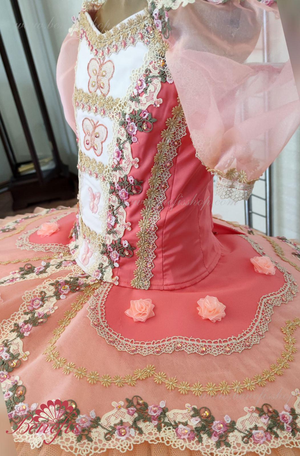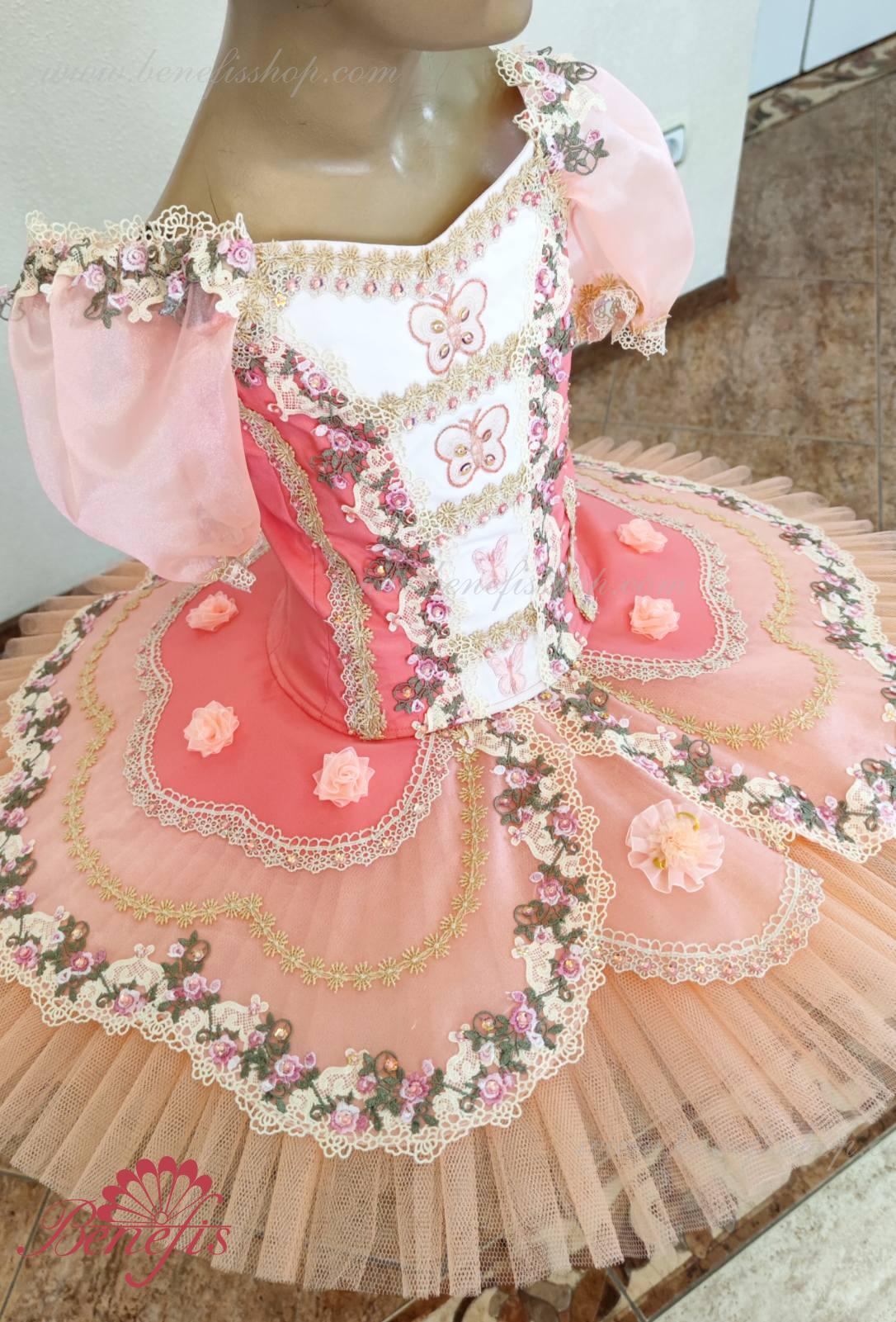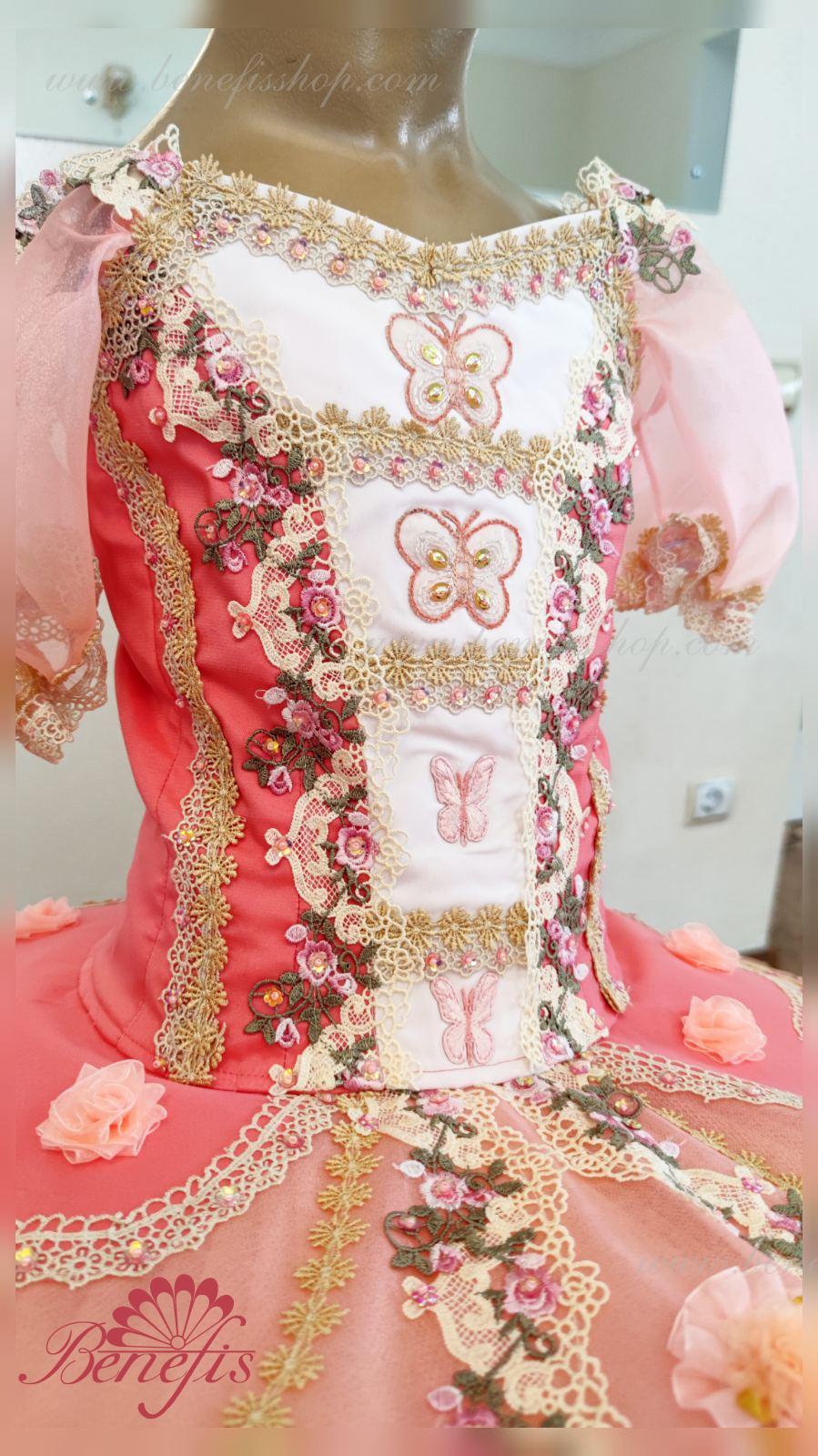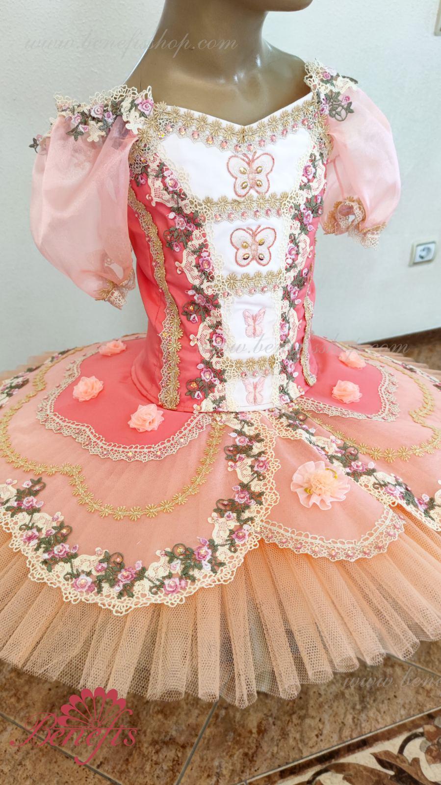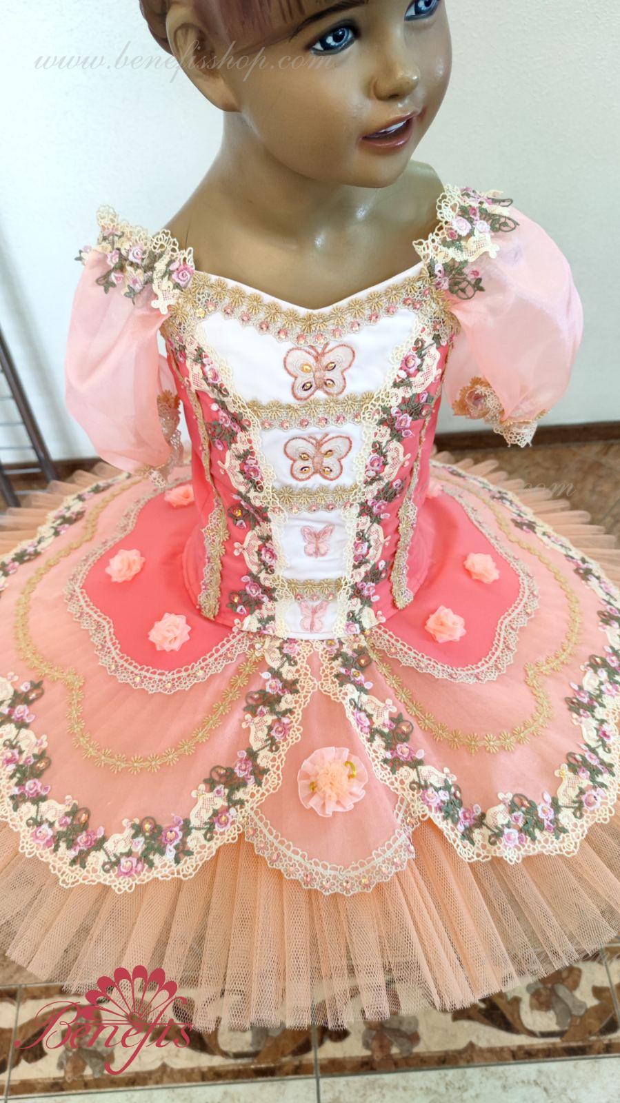 Details: costume. The bodice, with elastic straps and a flesh insert on the chest, is made of satin. The bodice is fastened with hooks in two rows for easy adjustment, the inner cord is used to tighten the bodice in the chest area.The sleeves and the tire are made of organza, the peplum is made of satin.Eight pleated graduated layers of semi-soft tulle- seven long and one short on tulle panties with a 10 cm yoke attached to an elastic waistband. Two crinoline hoops are embedded in the middle layer with two additional short frills at the edges. The length of the top layer is 36-38 cm, each subsequent layer is 4 cm shorter. The tutu is fastened at the back with 6 large hooks and loops. The decor is lace, flowers, sequins.