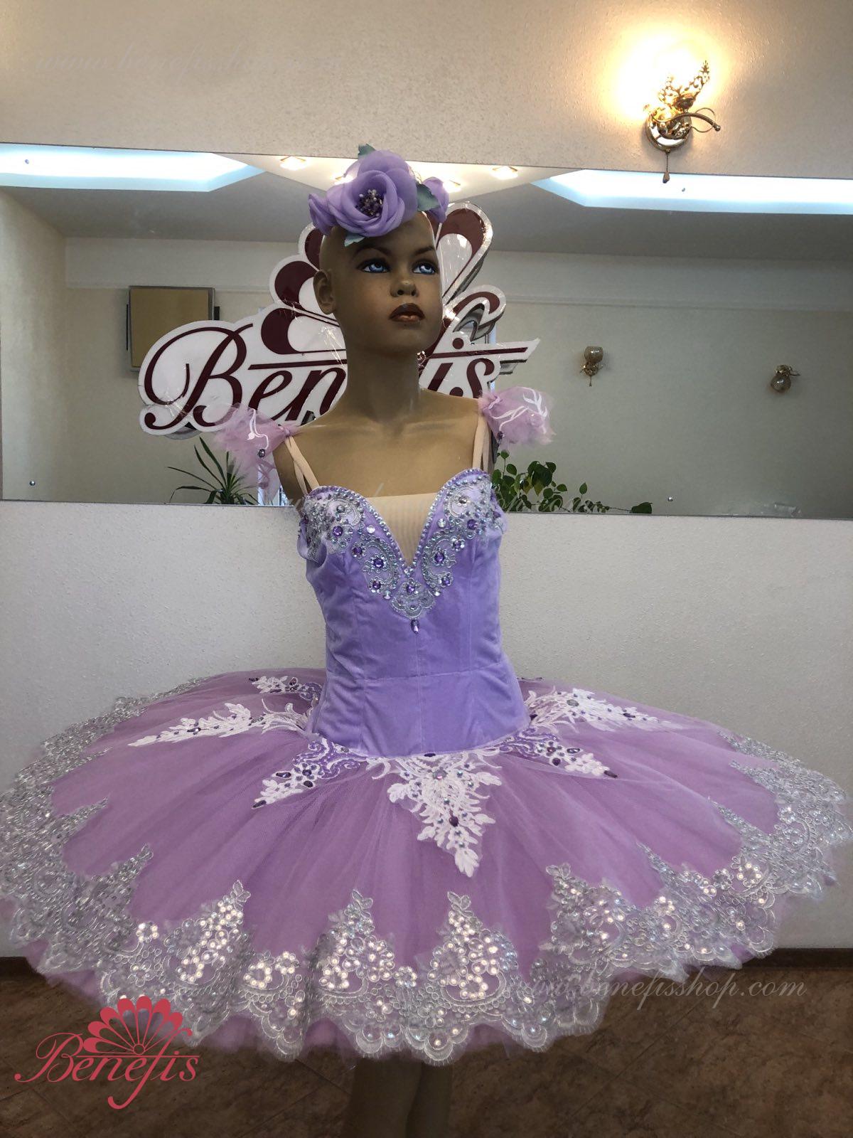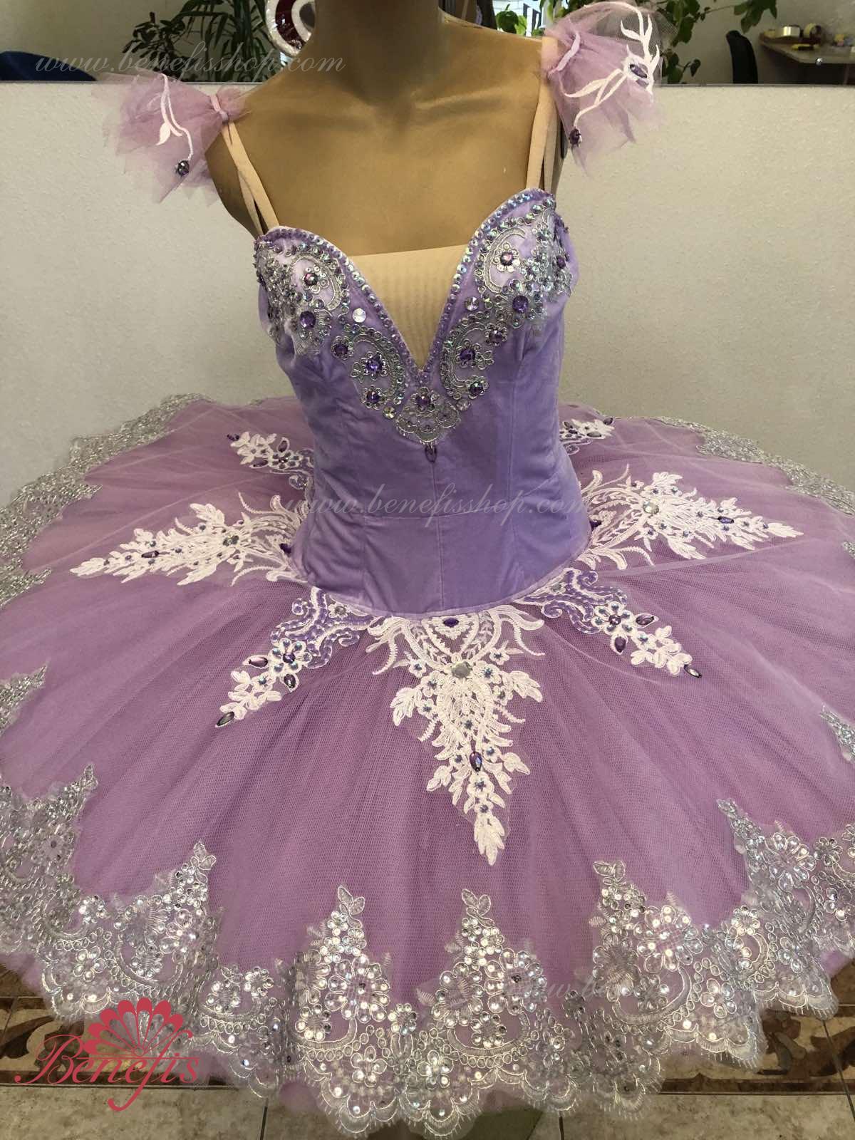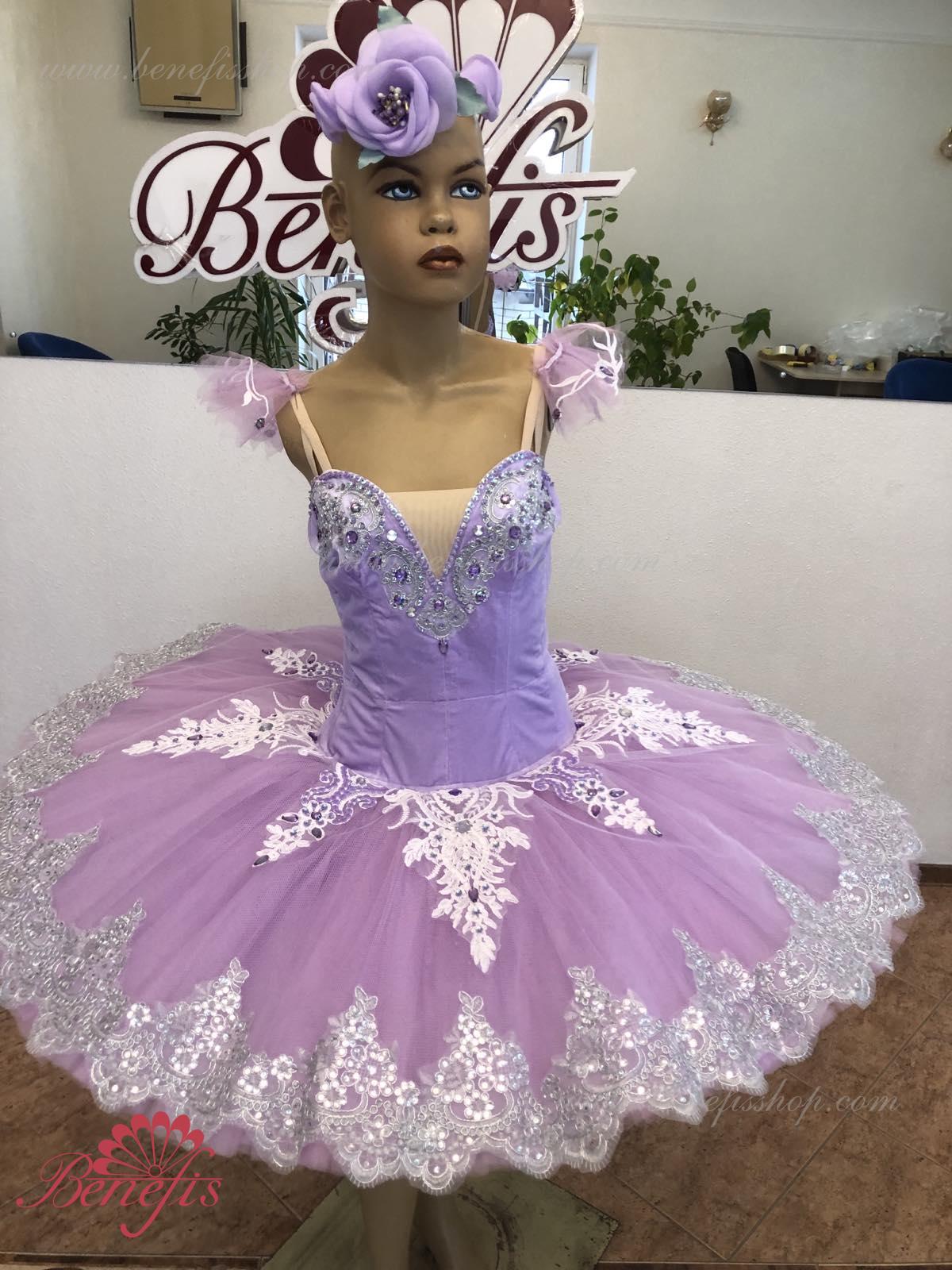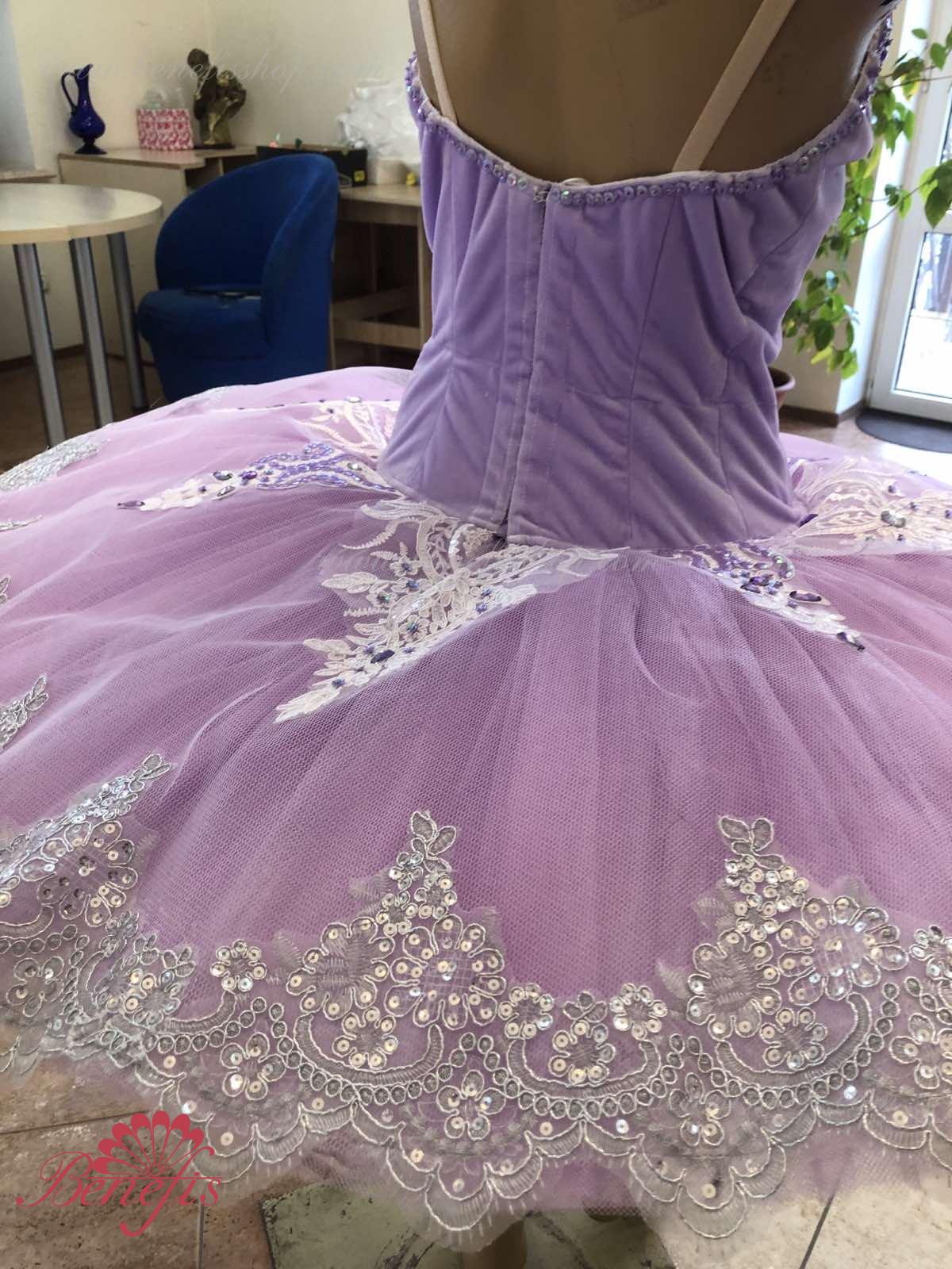Details: costume, tire and sleeves. The bodice, with elastic straps and a flesh insert on the chest, is made of velvet. The bodice is fastened with hooks in two rows for easy adjustment, the inner cord is used to tighten the bodice in the chest area.Tutu skirt. It is made of 9 layers of soft and hard tulle with 1 crinoline. The edge of the pack is 38-42 cm. Applications, rhinestones, and sequins are used as decorative elements. The originality of the costume lies in the skillful handwork. At the request of the customer, the suit can be made in a different color.