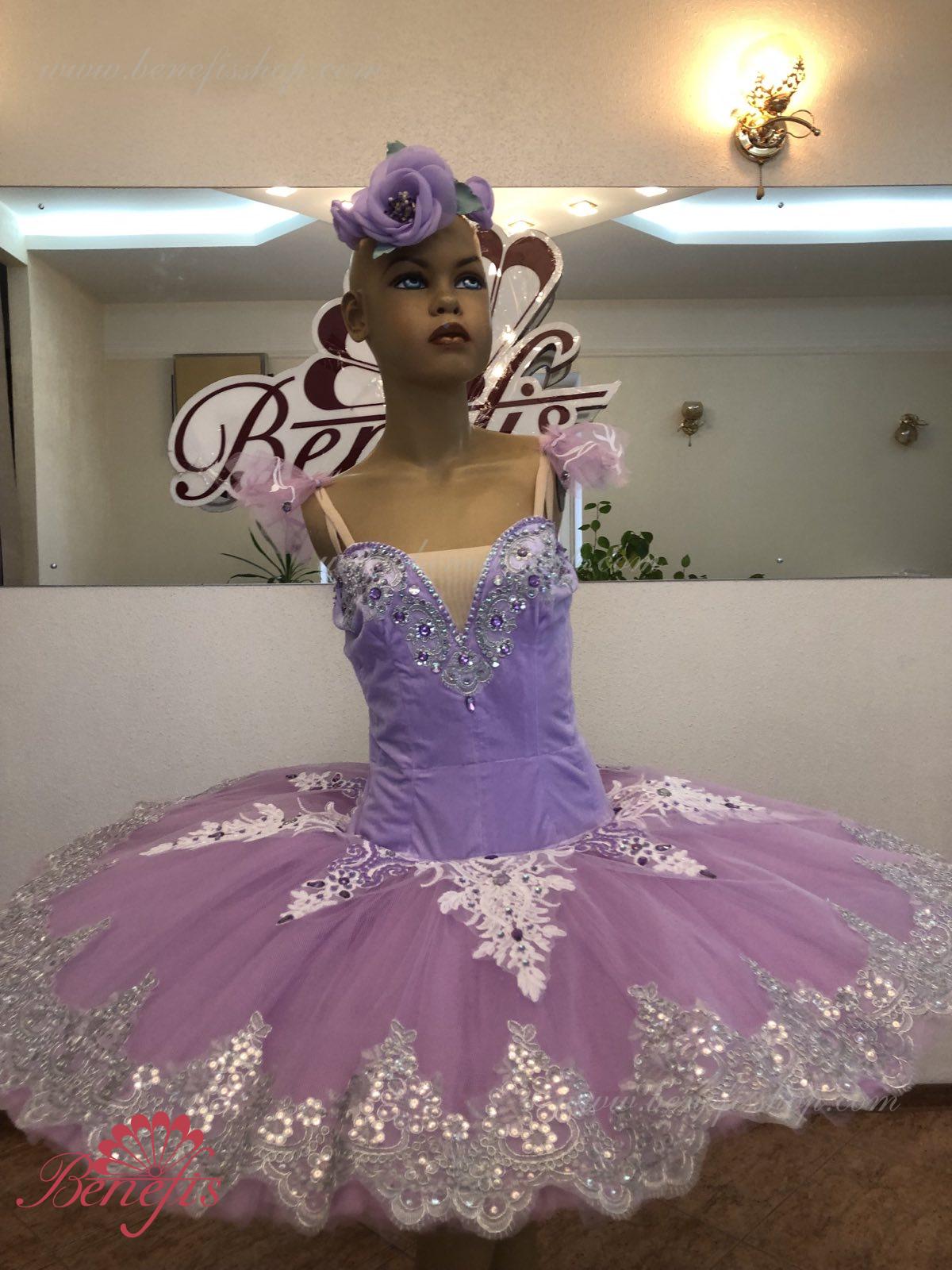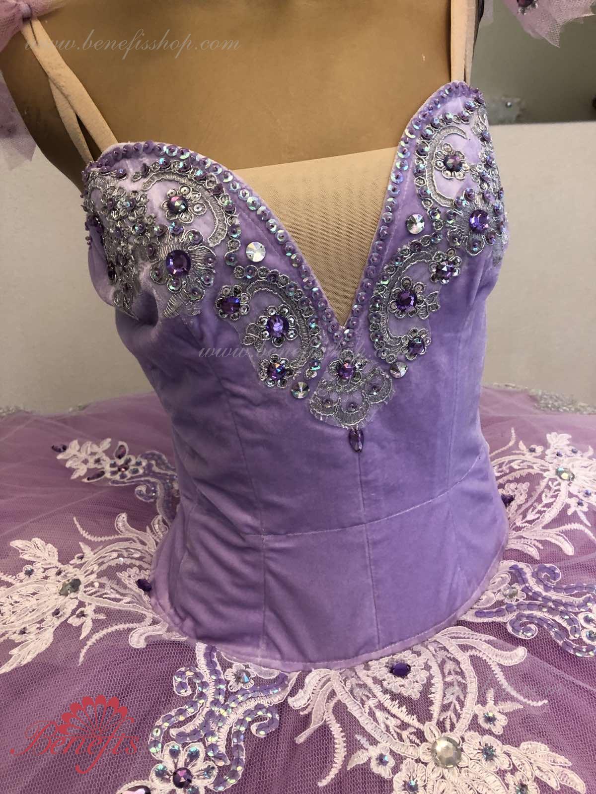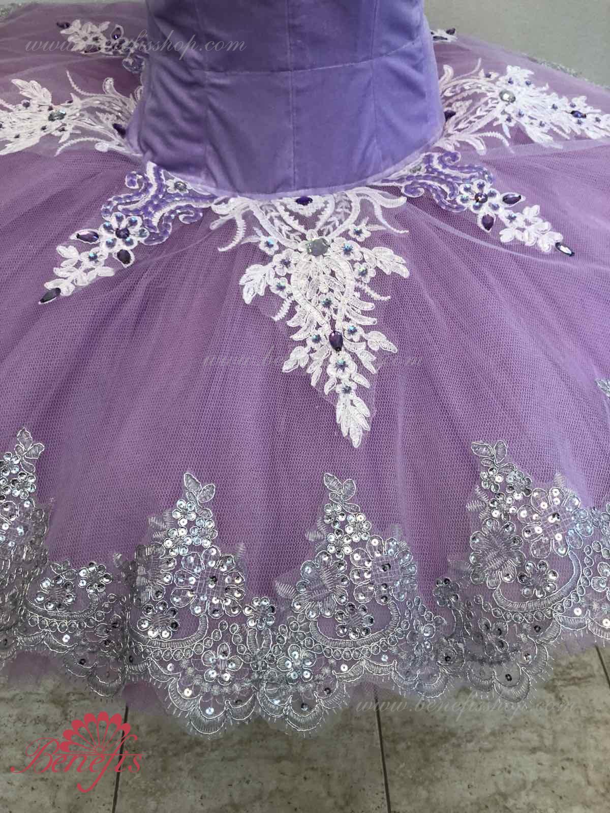 Details: costume, tire and sleeves. The bodice, with elastic straps and a flesh insert on the chest, is made of velvet. The bodice is fastened with hooks in two rows for easy adjustment, the inner cord is used to tighten the bodice in the chest area.Tutu skirt. It is made of 9 layers of soft and hard tulle with 1 crinoline. The edge of the pack is 38-42 cm. Applications, rhinestones, and sequins are used as decorative elements. The originality of the costume lies in the skillful handwork. At the request of the customer, the suit can be made in a different color.