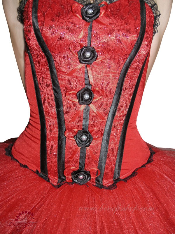 The corset is made of satin and decorated with flowers. The five-layer skirt is made of soft tulle