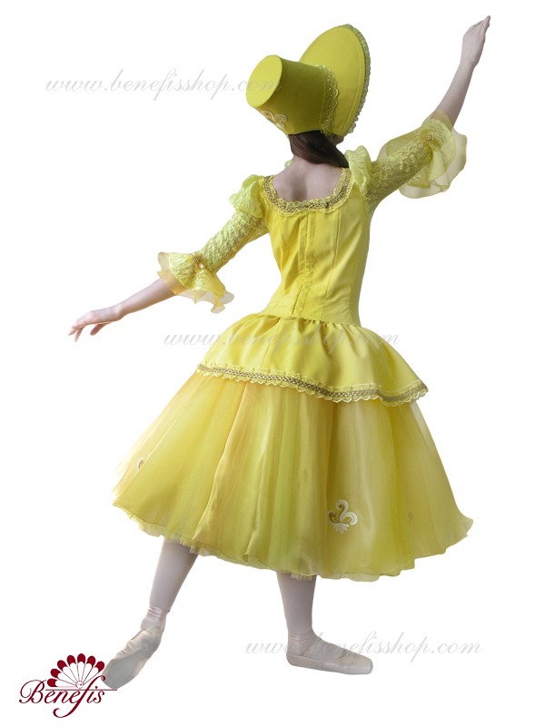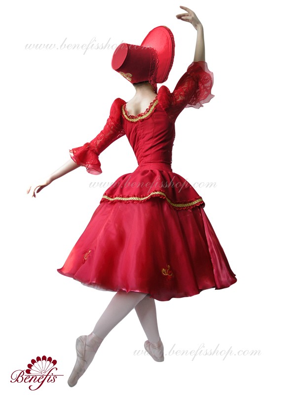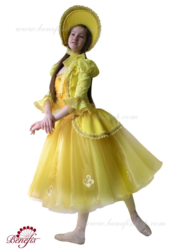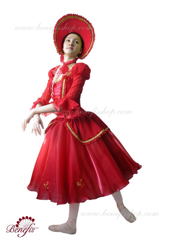The dress is made on the basis of an elastic leotard. The skirt is made of four layers of soft tulle, and one short layer of velvet. On the bodice in the front there is a pleated inset of organza embellished with applications in the form of flowers. The bodice and the upper layer of skirt are embellished with brade and laces. The skirt’s upper layer is embellished with applications. The sleeves until elbows are ending with cuffs in two layers: the upper one of velvet, the lower and the longer one – of organza. The head-piece is made on the hard basis with wide peak, is embellished with braid and wide laced ribbon, which ties up under the chin.