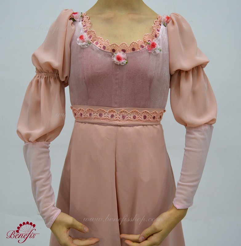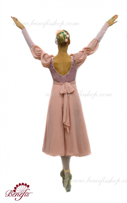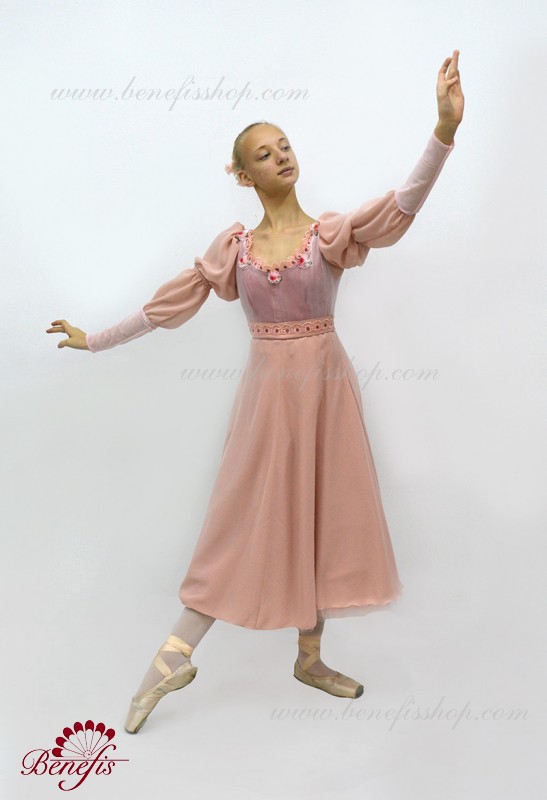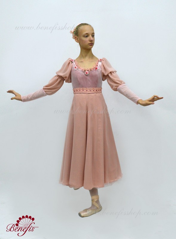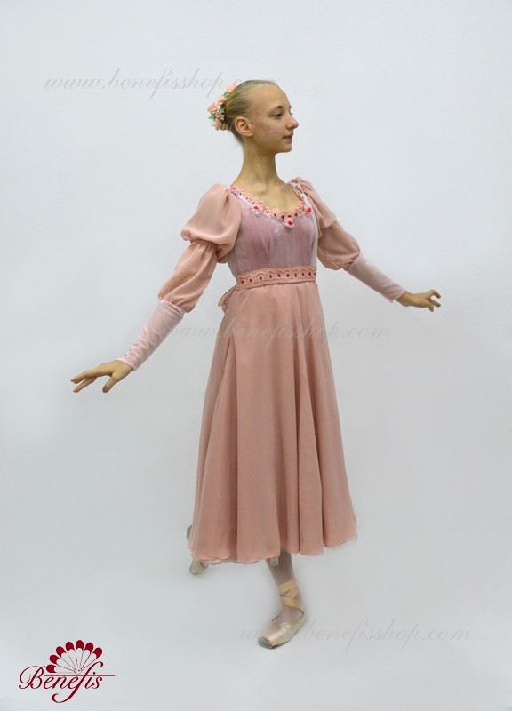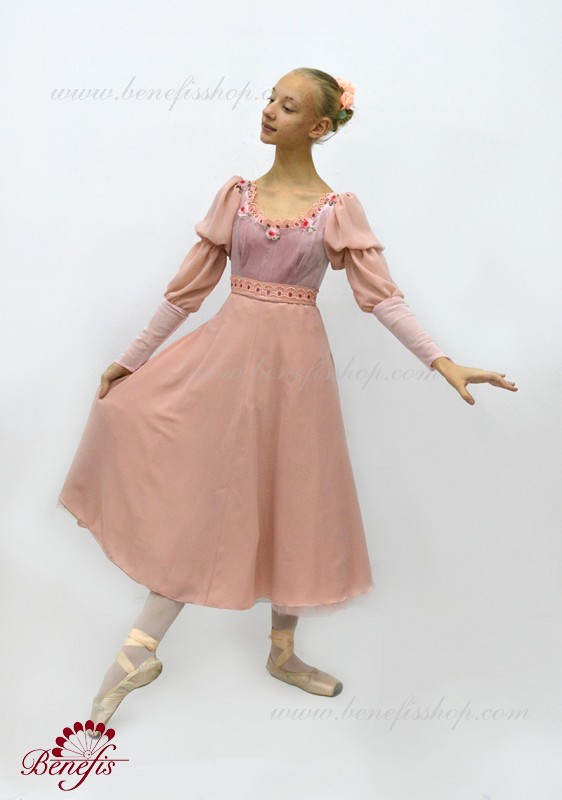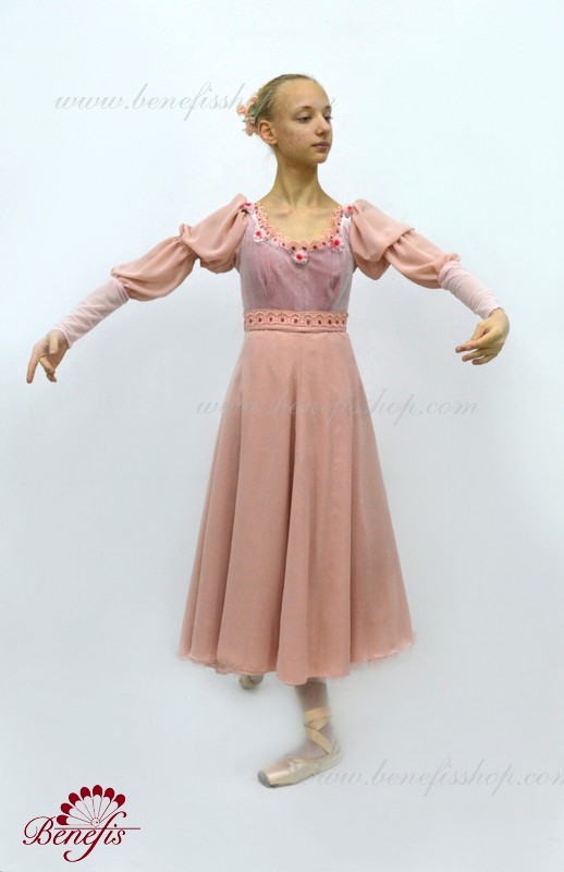 Delicate ballet dress is made of chiffon and thick elastic fabric. The velvet bodice with long sleeves that are made of two kinds of fabric: chiffon and netting. The bodice is fastened with two rows of hooks on the back. Décor includes flowers and braid.