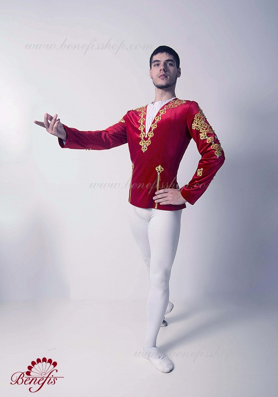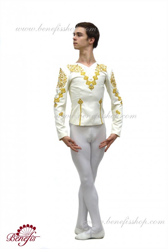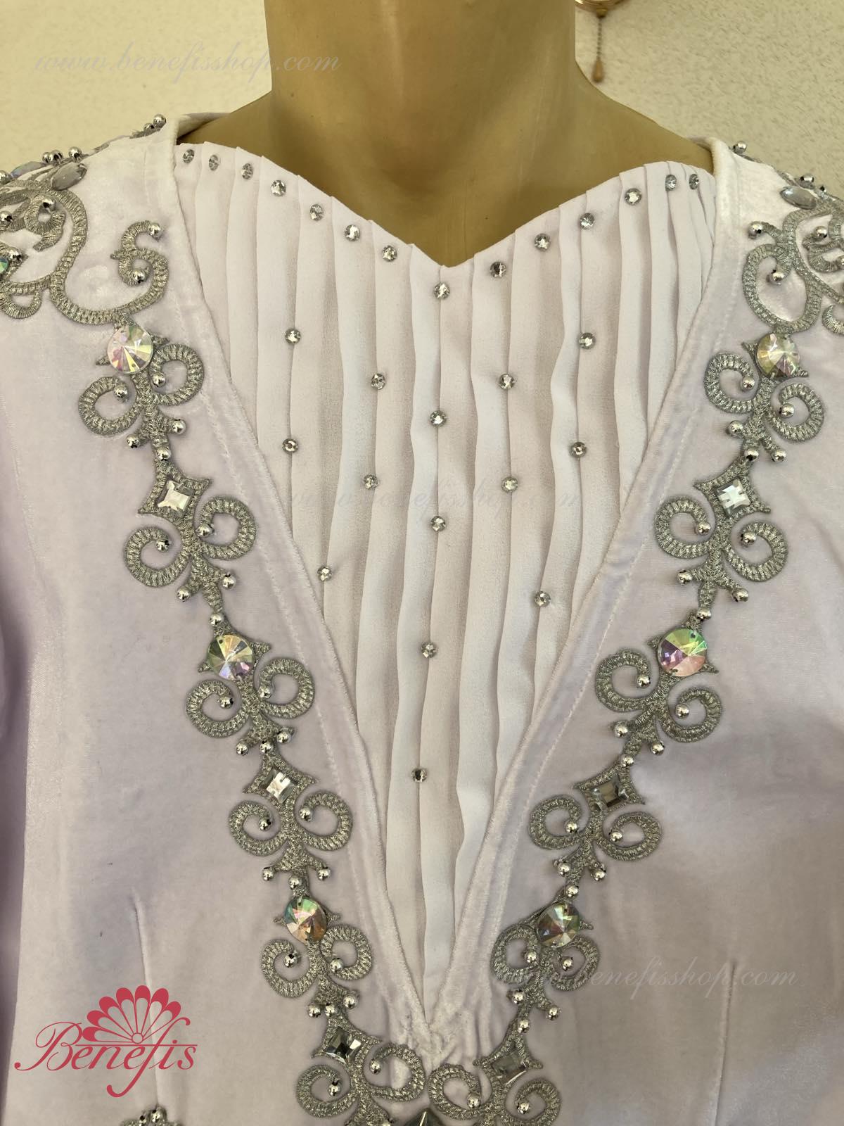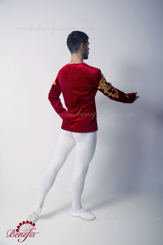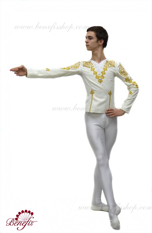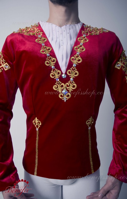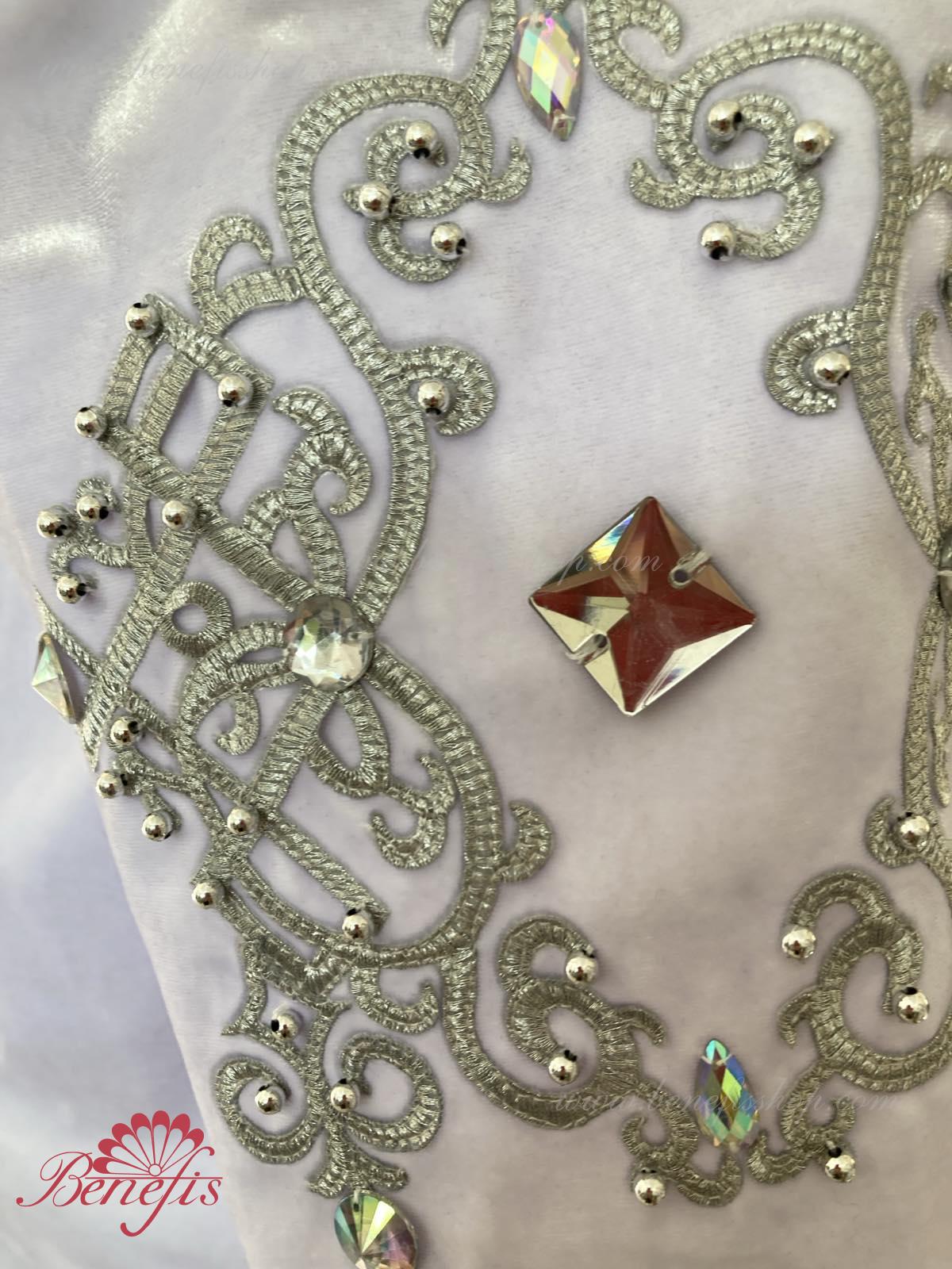 Professional stage ballet costume made of semi-stretched fabric. Has a V-shaped inset at the front made of draped fabric (chiffon). The tunic fastens on the back with two rows of hooks. Décor includes two kinds of braid, appliques, beads, rhinestones.