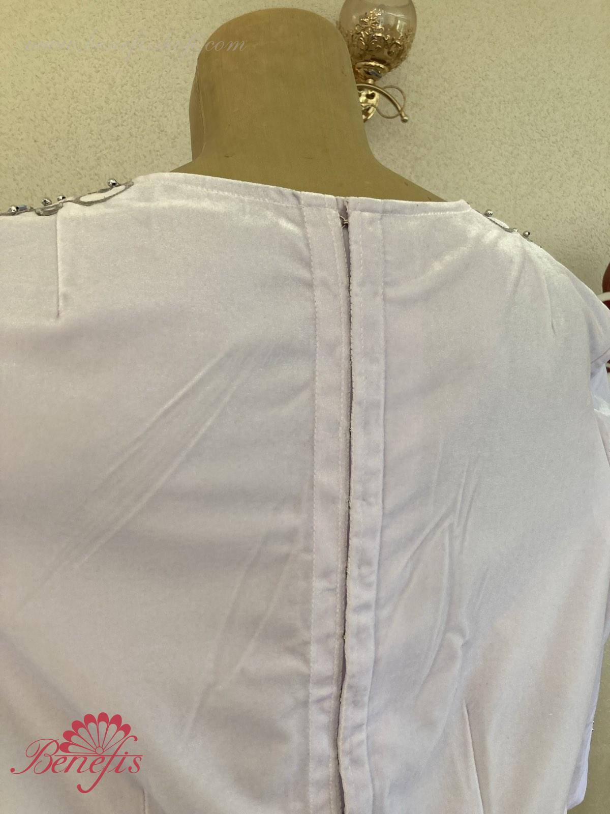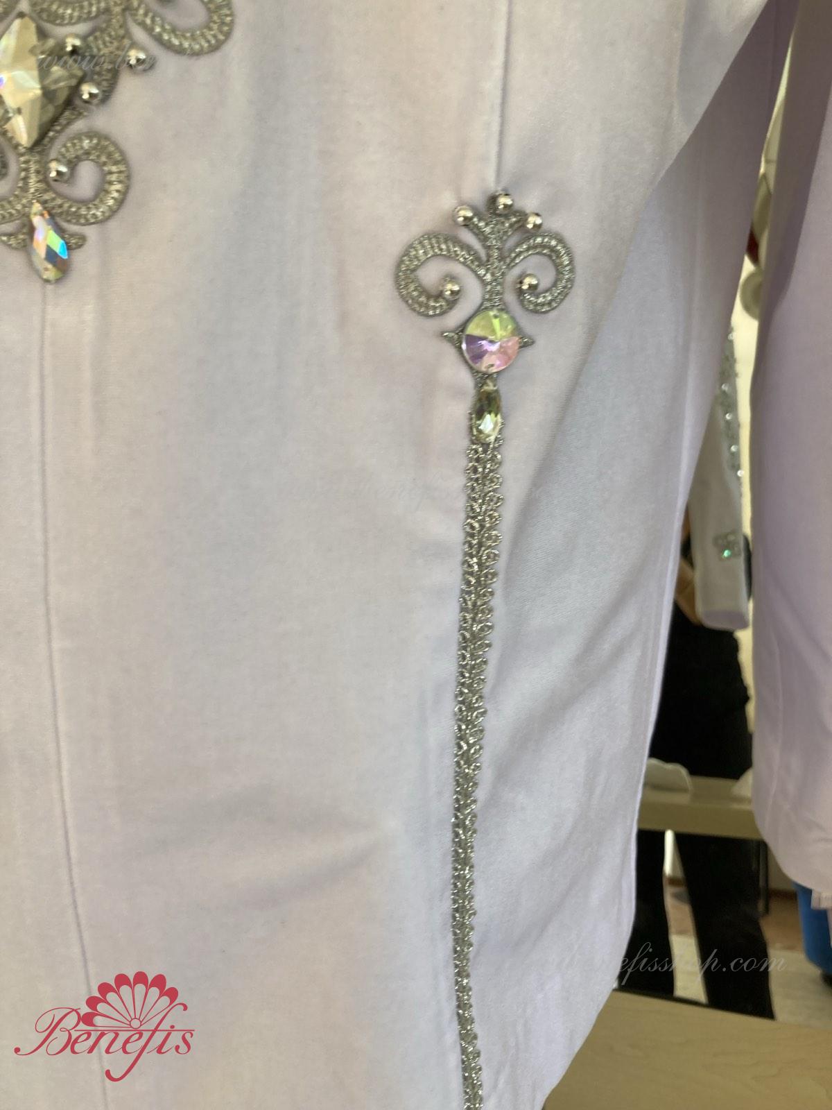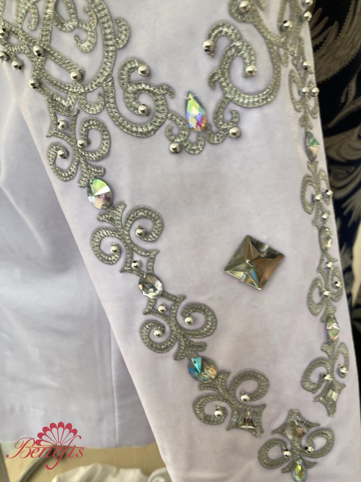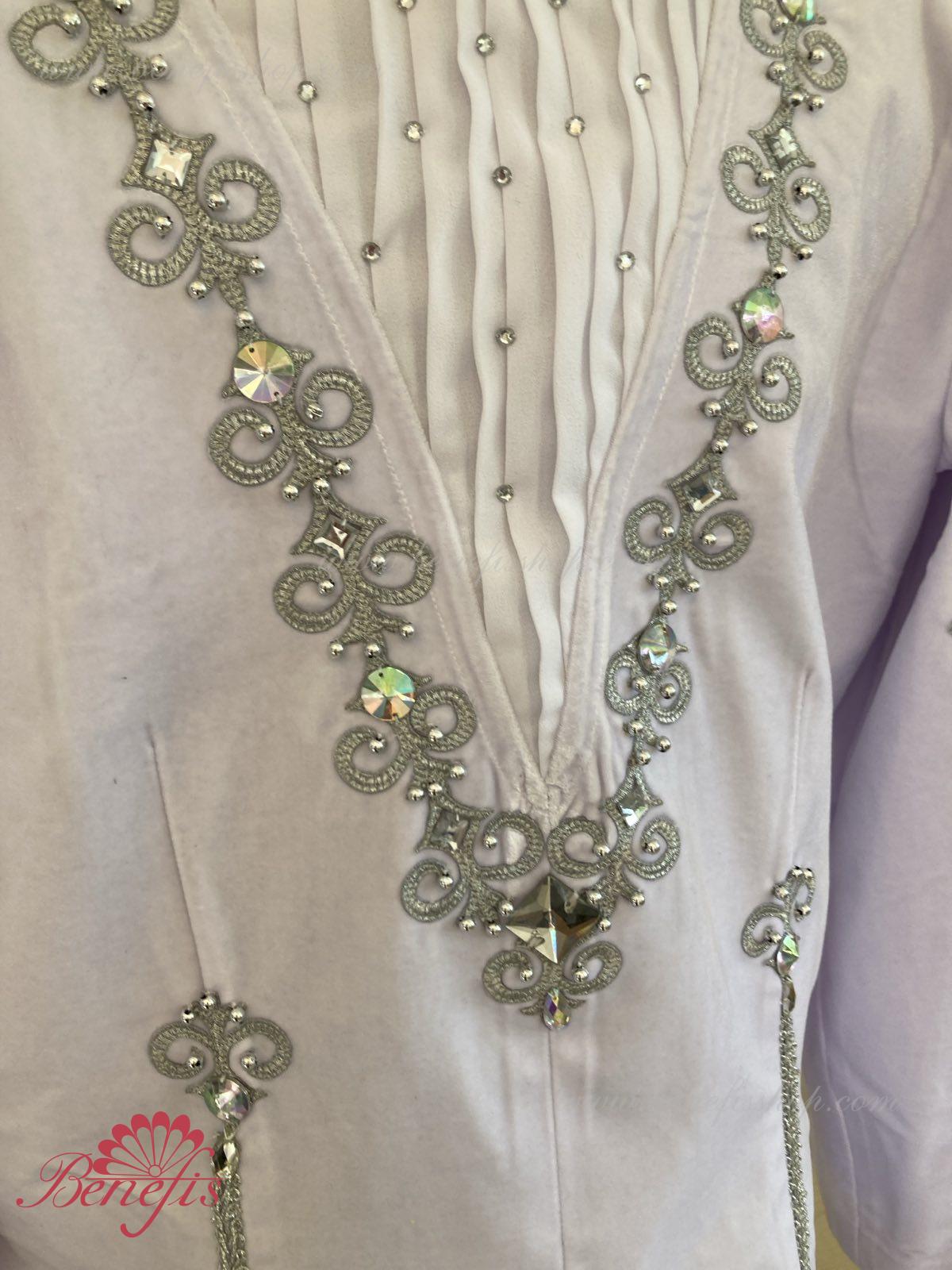 Professional stage ballet costume made of semi-stretched fabric. Has a V-shaped inset at the front made of draped fabric (chiffon). The tunic fastens on the back with two rows of hooks. Décor includes two kinds of braid, appliques, beads, rhinestones.
